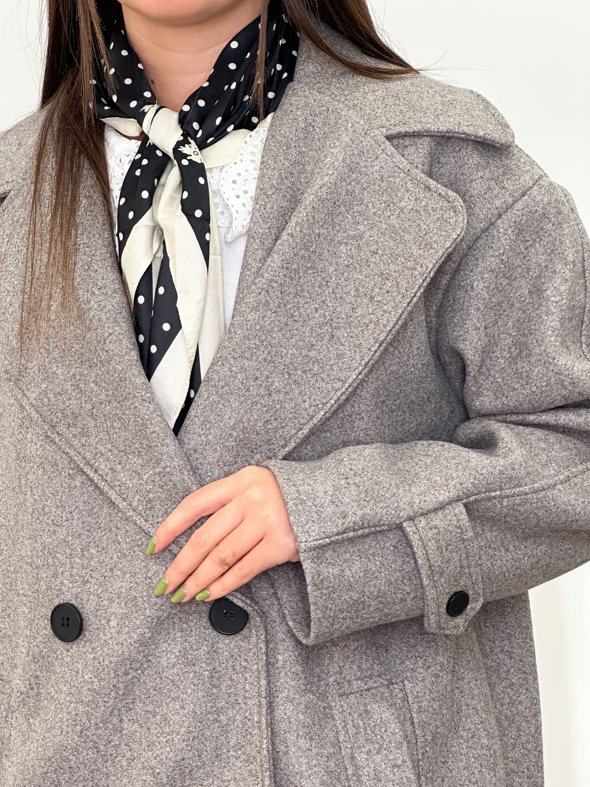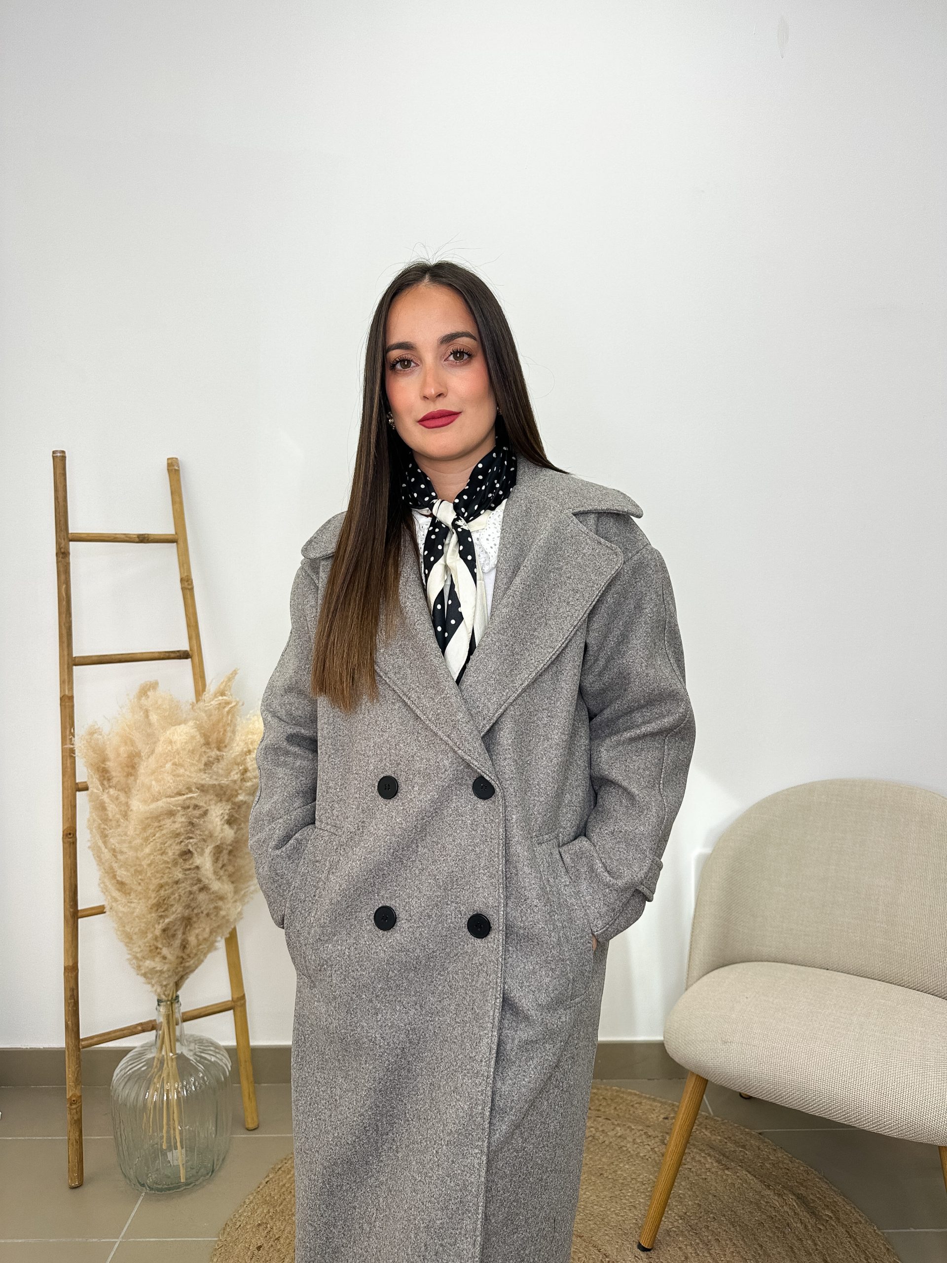 La doble abotonadura con botones oscuros le da ese guiño clásico que nunca falla, mientras que el cuello con solapas marca la estructura justa para que te veas estilizada y con mucho porte.