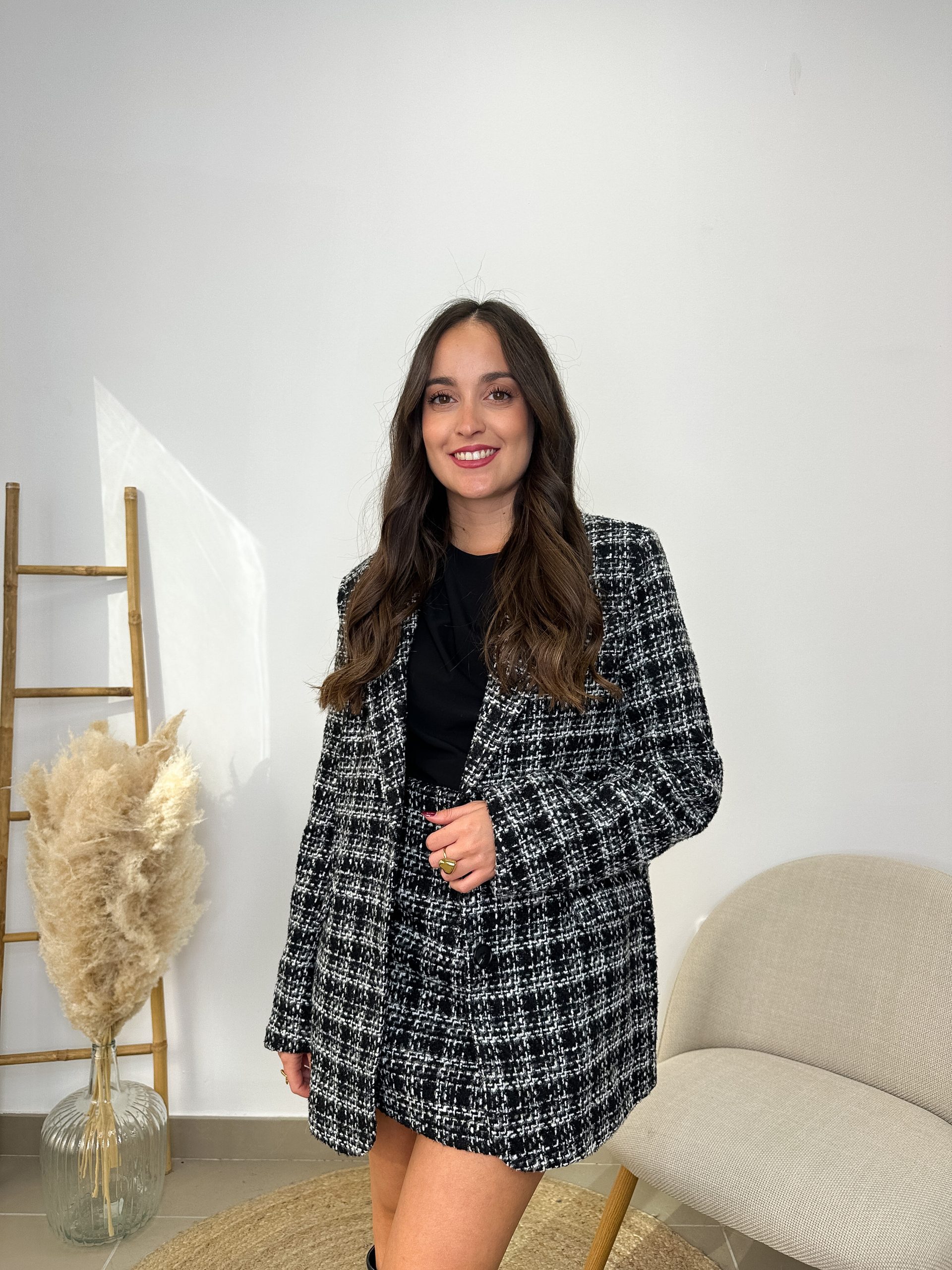 El cuadro limpio en blanco y negro se mezcla con un hilo metalizado negro que brilla lo justo, como un guiño sutil que solo se ve cuando te mueves. La solapa grande le da carácter y el forro interior hace que siente de maravilla, con esa caída elegante que siempre suma.