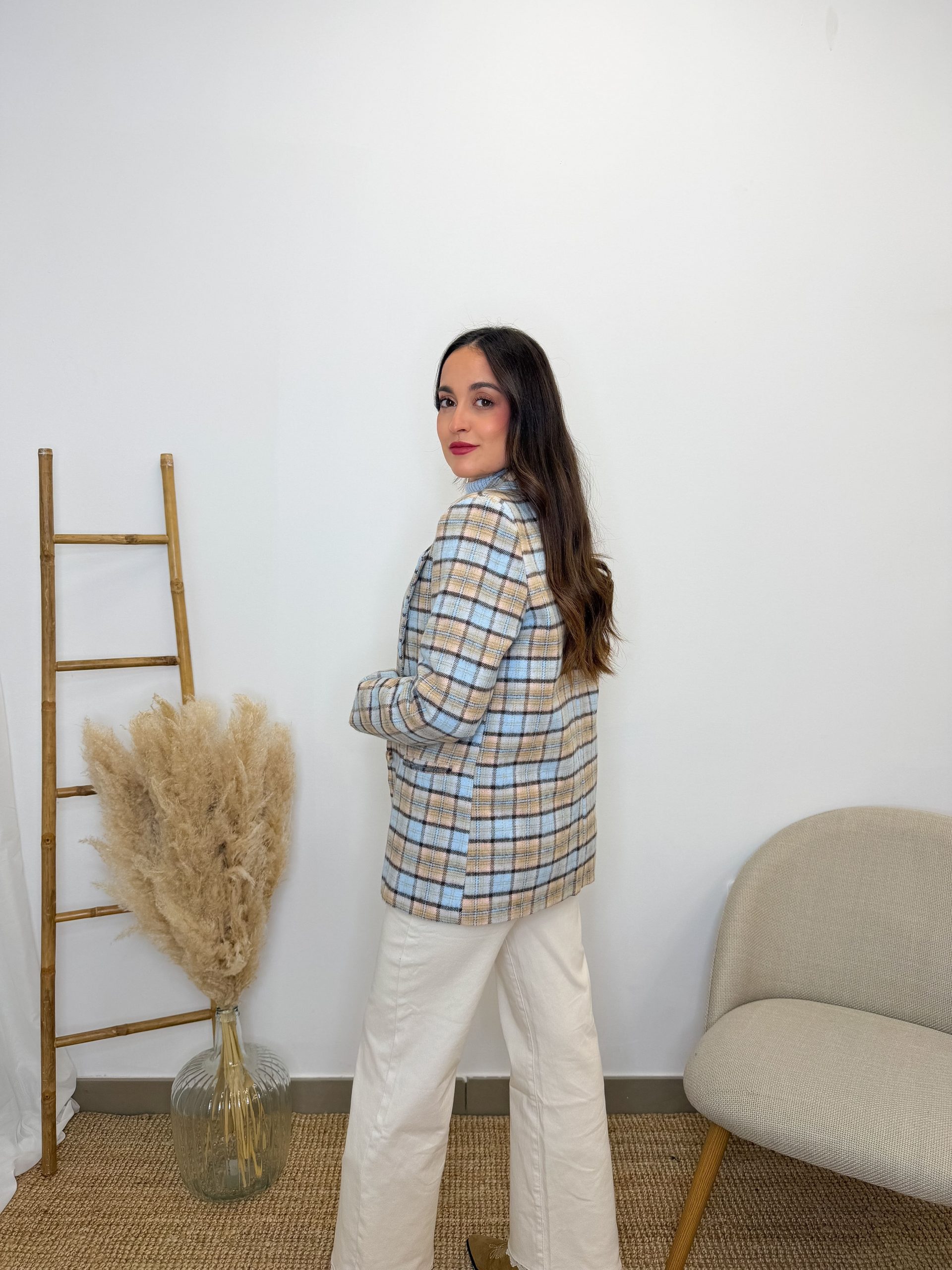 Una blazer que mezcla dulzura y carácter en la medida justa. Azul clarito con cuadros y rayas en tonos marrones, suaves y oscuros, creando un contraste precioso y muy especial.