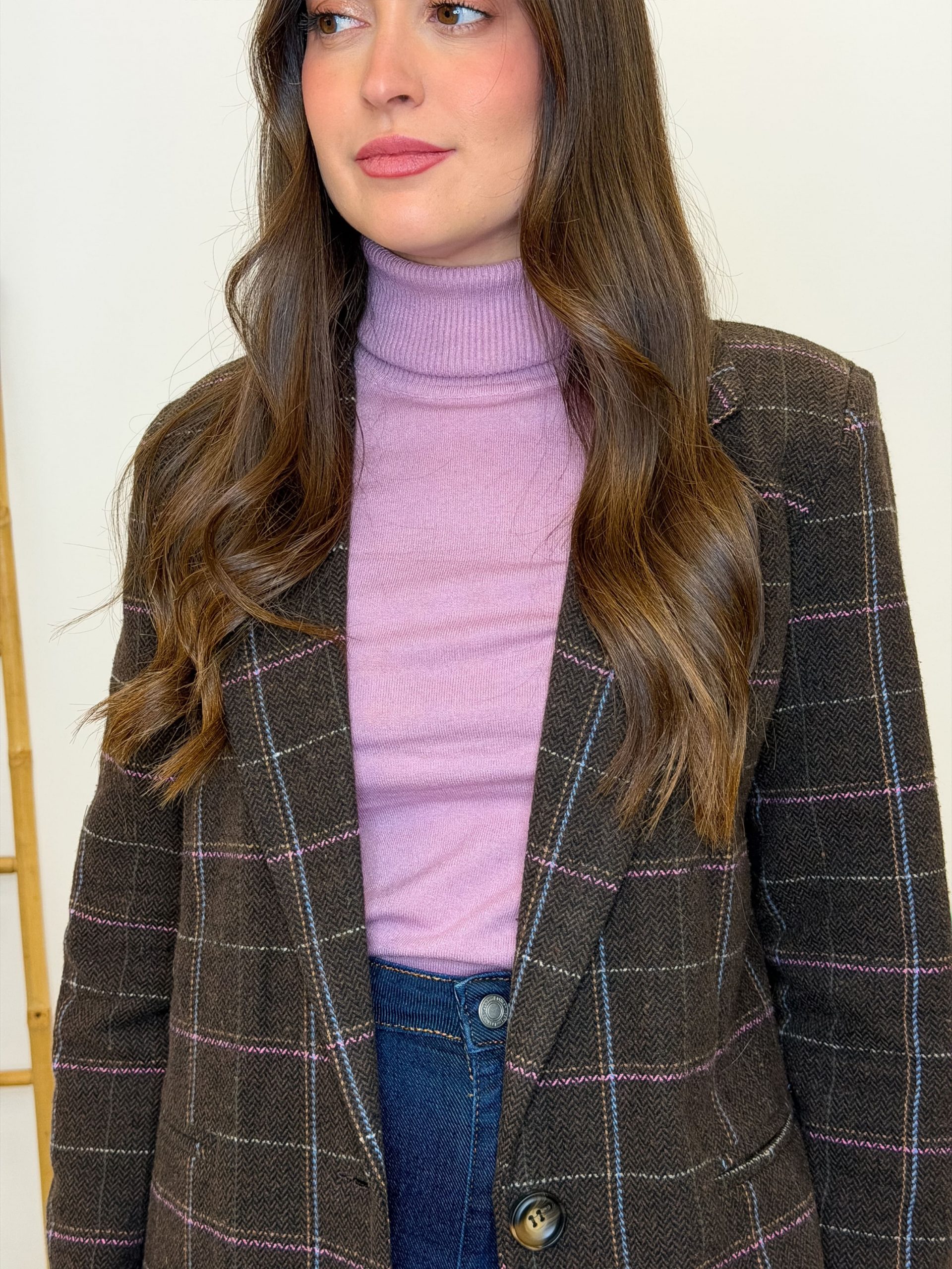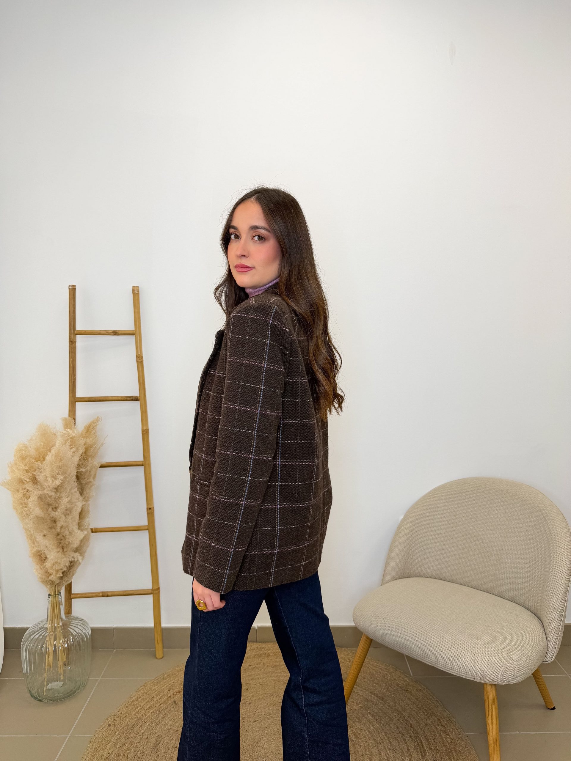 Mira esos cuadros finitos en beige, azul y rosa… tienen algo que hace que cada detalle llame la atención, pero sin gritar demasiado. Y ese botón en tono carey es como la cereza que cierra el look con estilo. Los bolsillos son falsos, pero honestamente… ¿quién necesita bolsillos cuando todo lo demás es tan irresistible? 😏