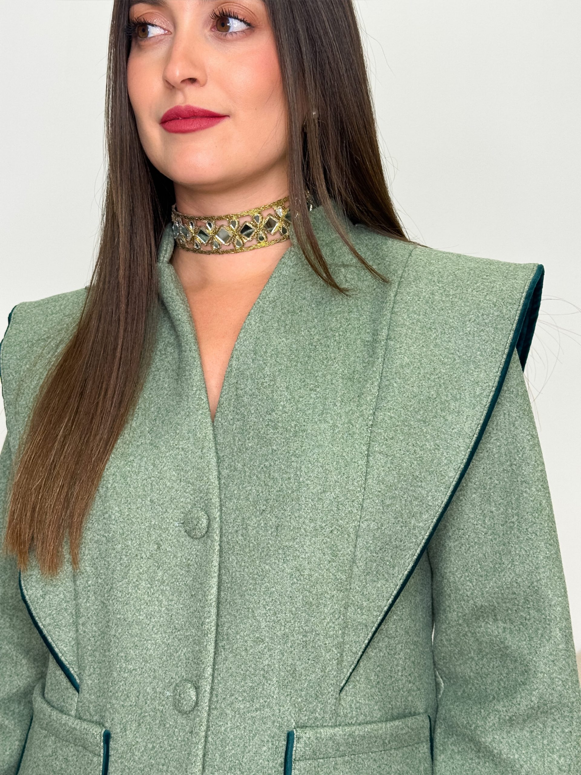 Su silueta es elegante pero con ese puntito especial que tanto nos gusta: los volantes en los hombros que dan presencia sin exagerar, y ese forro de terciopelo en verde oscuro que asoma en las solapas y en los bolsillos delanteros, aportando un toque sofisticado y muy La Mar de Ángela. Los botones, forrados en el mismo color, cierran el look con delicadeza.