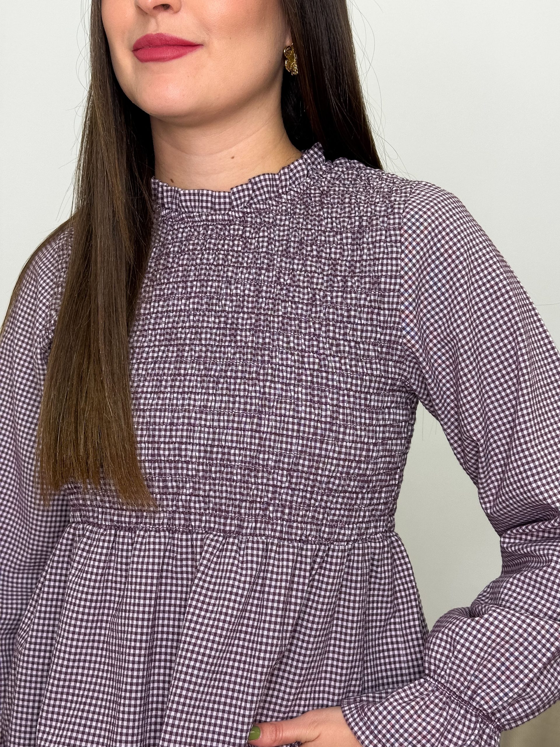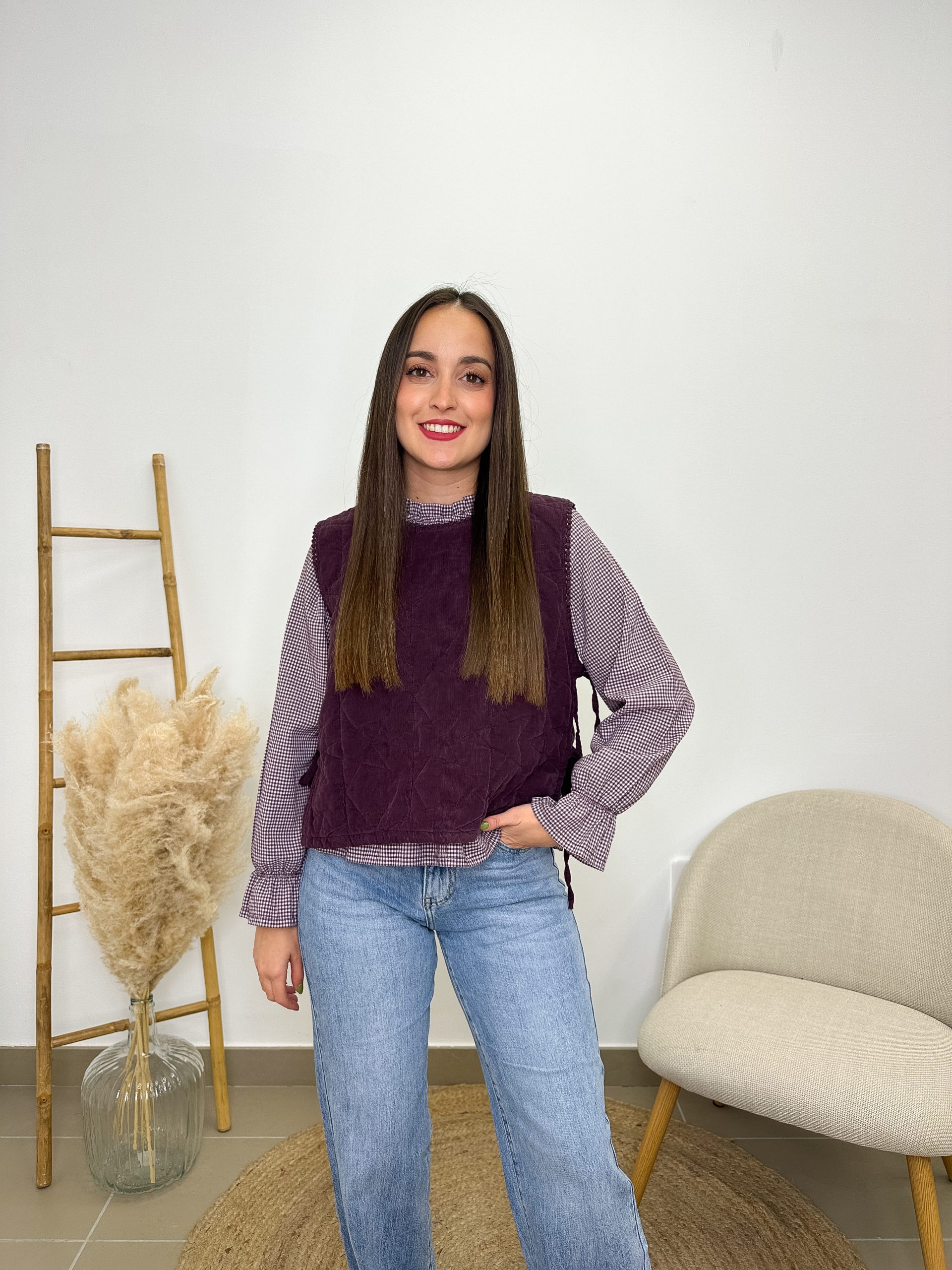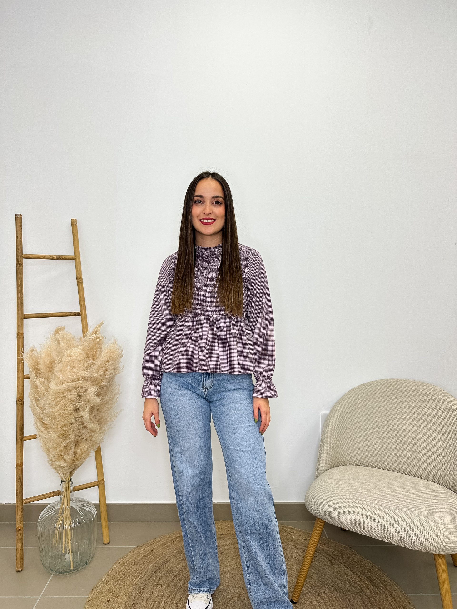 Hay blusas que te conquistan por los colores… y luego están las que te enamoran por cómo te hacen sentir. Esta, en cuadros vichí en tonos morado con un fondo blanco, tiene ese encanto que no se explica, se nota.