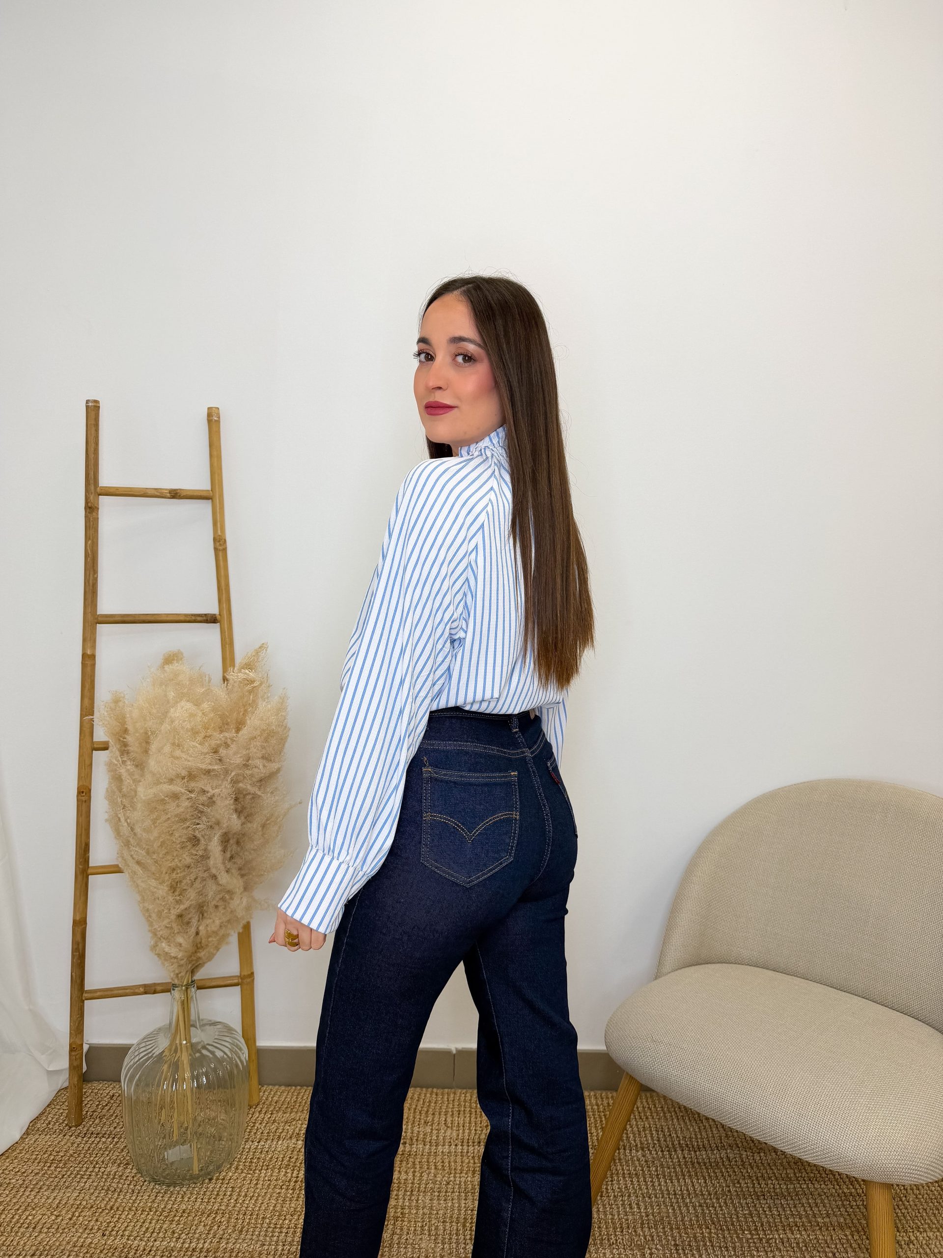 Es de esas prendas que hacen el look bonito sin esfuerzo. El blanco con rayas azules es fresco, elegante y atemporal, perfecto para el día a día o para planes un poquito más especiales.