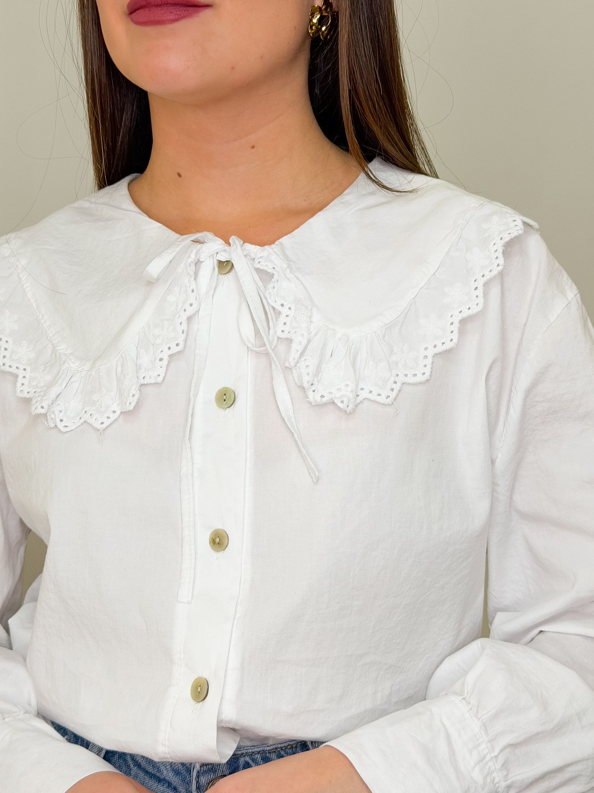 La abotonadura delantera le da ese toque clásico que siempre funciona, mientras que el cuello babero aporta personalidad y dulzura. Y las cintas en el cuello para anudar… ese detalle que puedes ajustar a tu manera, con lazada suave o más suelta, según el mood del día.