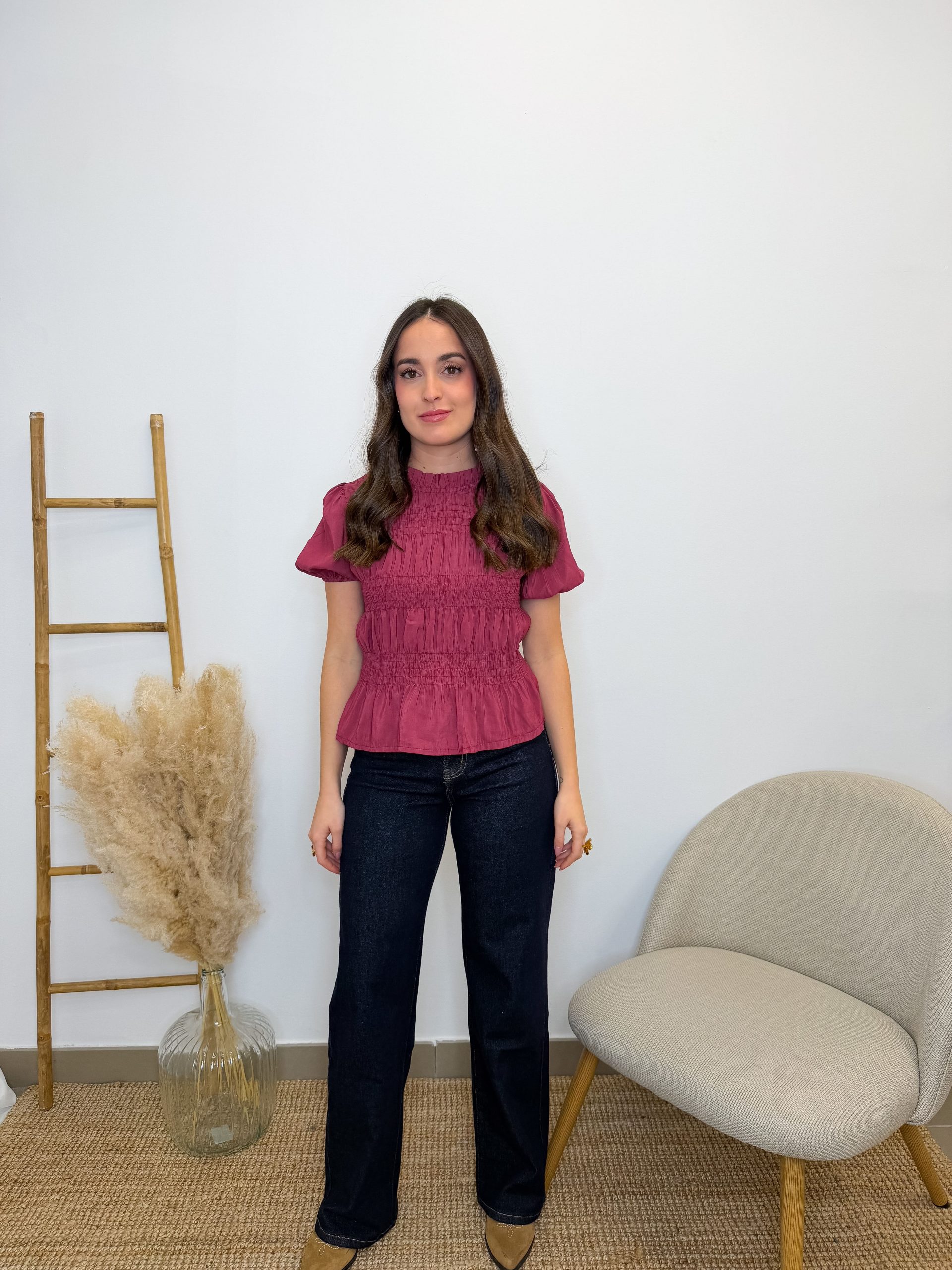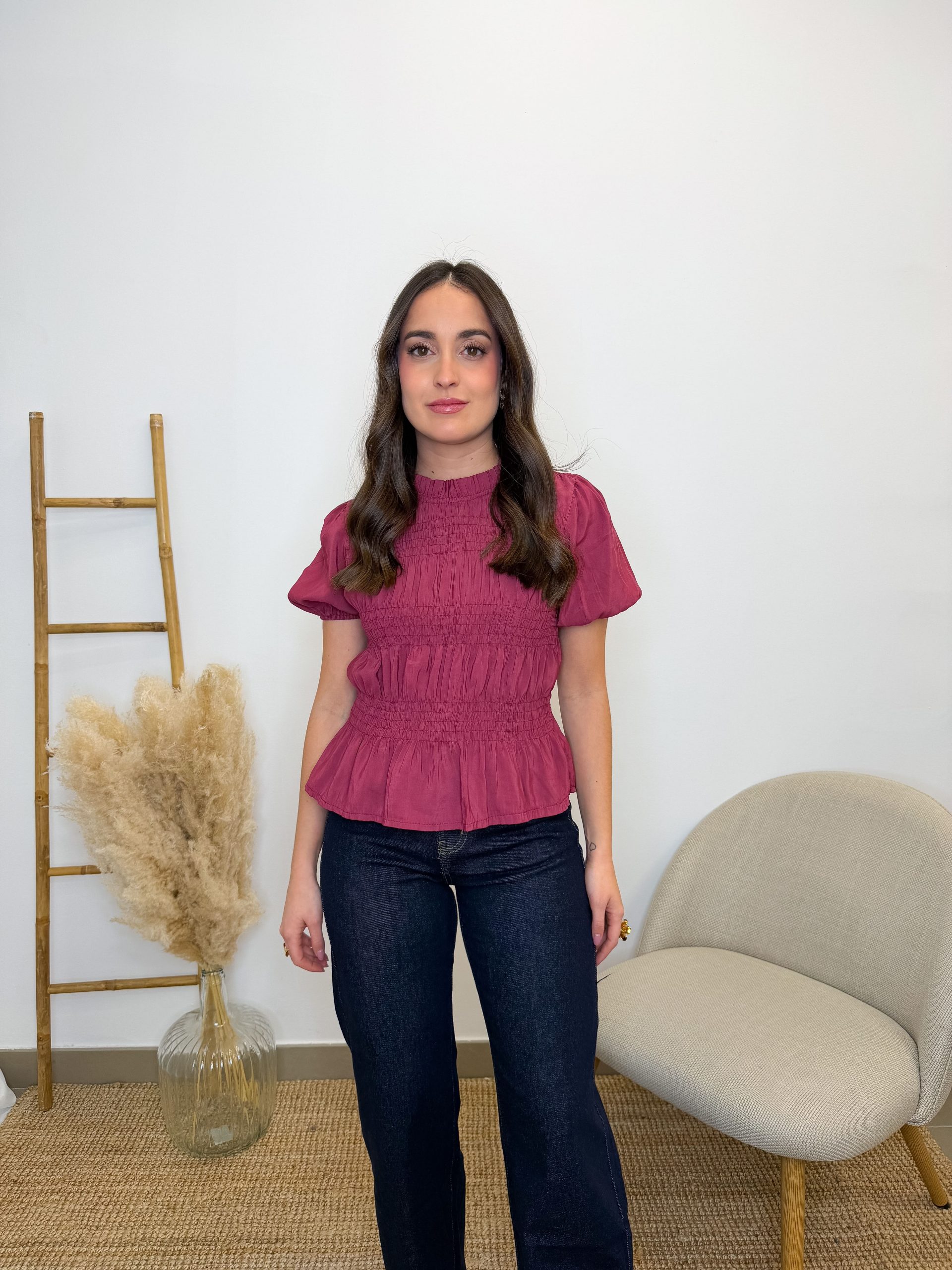 Esta blusa en color buganvilla tiene ese punto femenino que favorece muchísimo desde el primer momento. La zona del pecho con elástico hace que se ajuste al cuerpo de forma cómoda, marcando la silueta sin apretar y aportando ese efecto bonito que sienta tan bien.