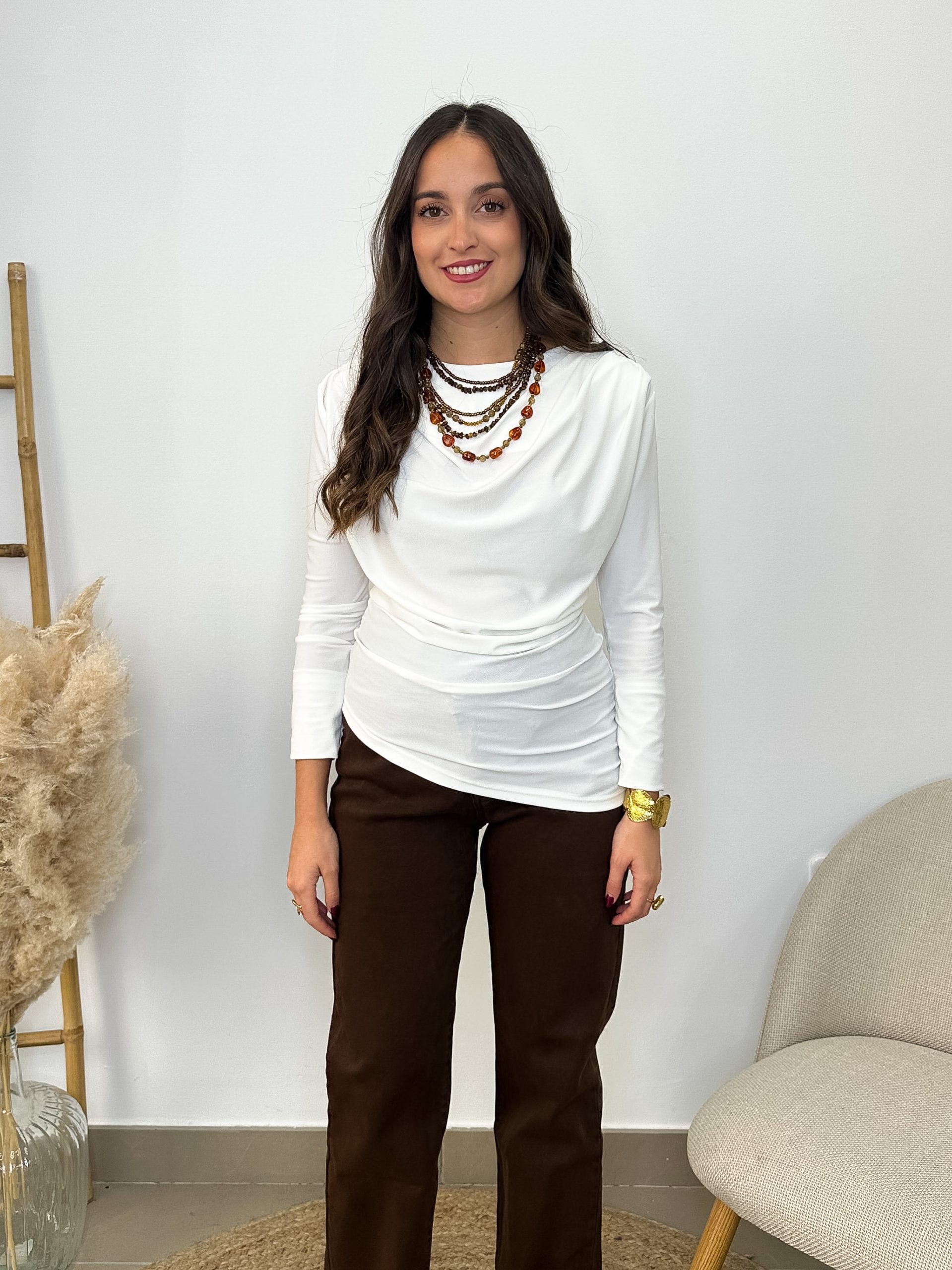 Esta blusa blanca asimétrica tiene ese algo que transforma un look sencillo en pura actitud. El tejido de licra se adapta con suavidad al cuerpo, mientras las hombreras y el fruncido en los hombros realzan la silueta y aportan un aire sofisticado y moderno.