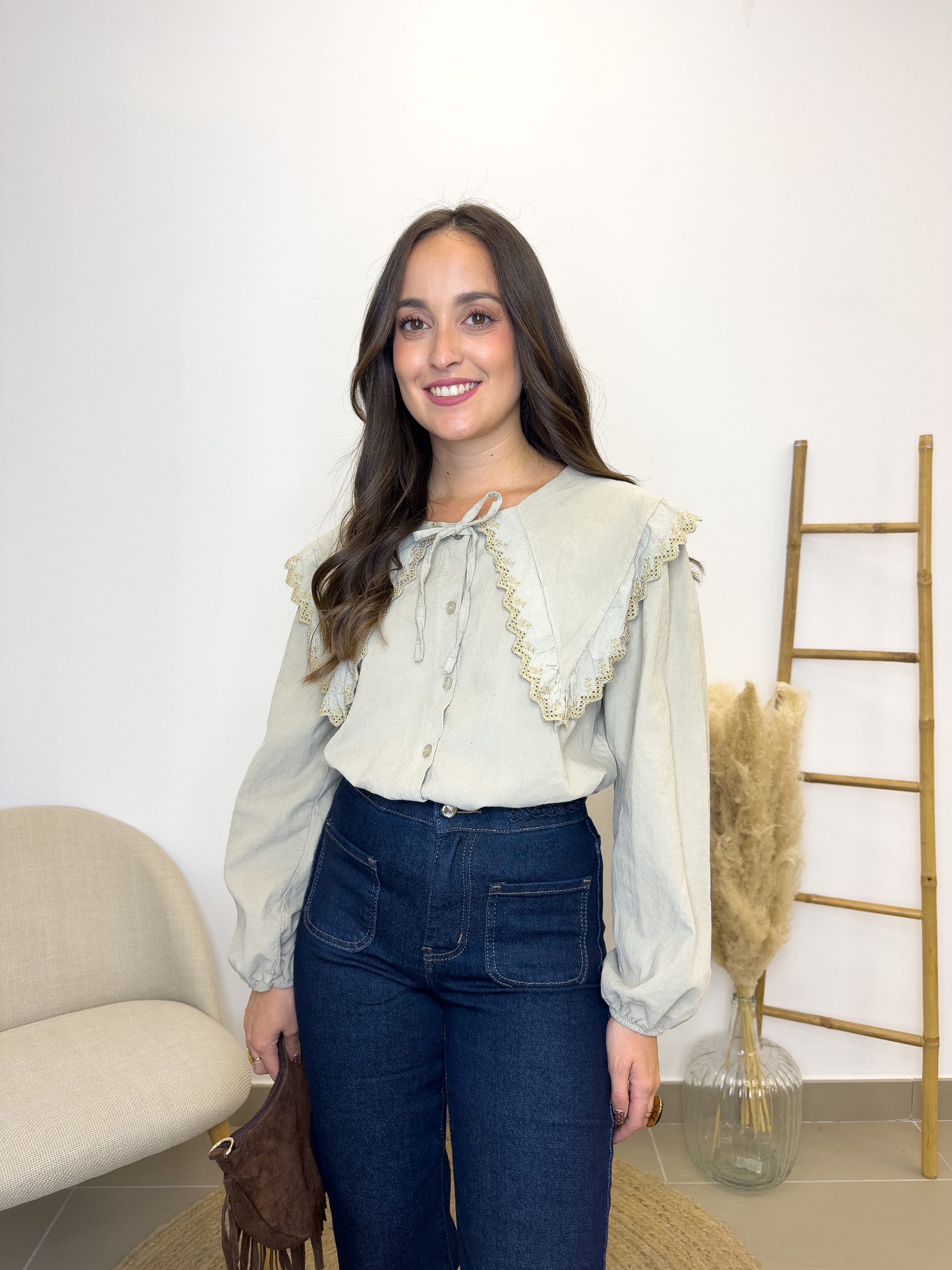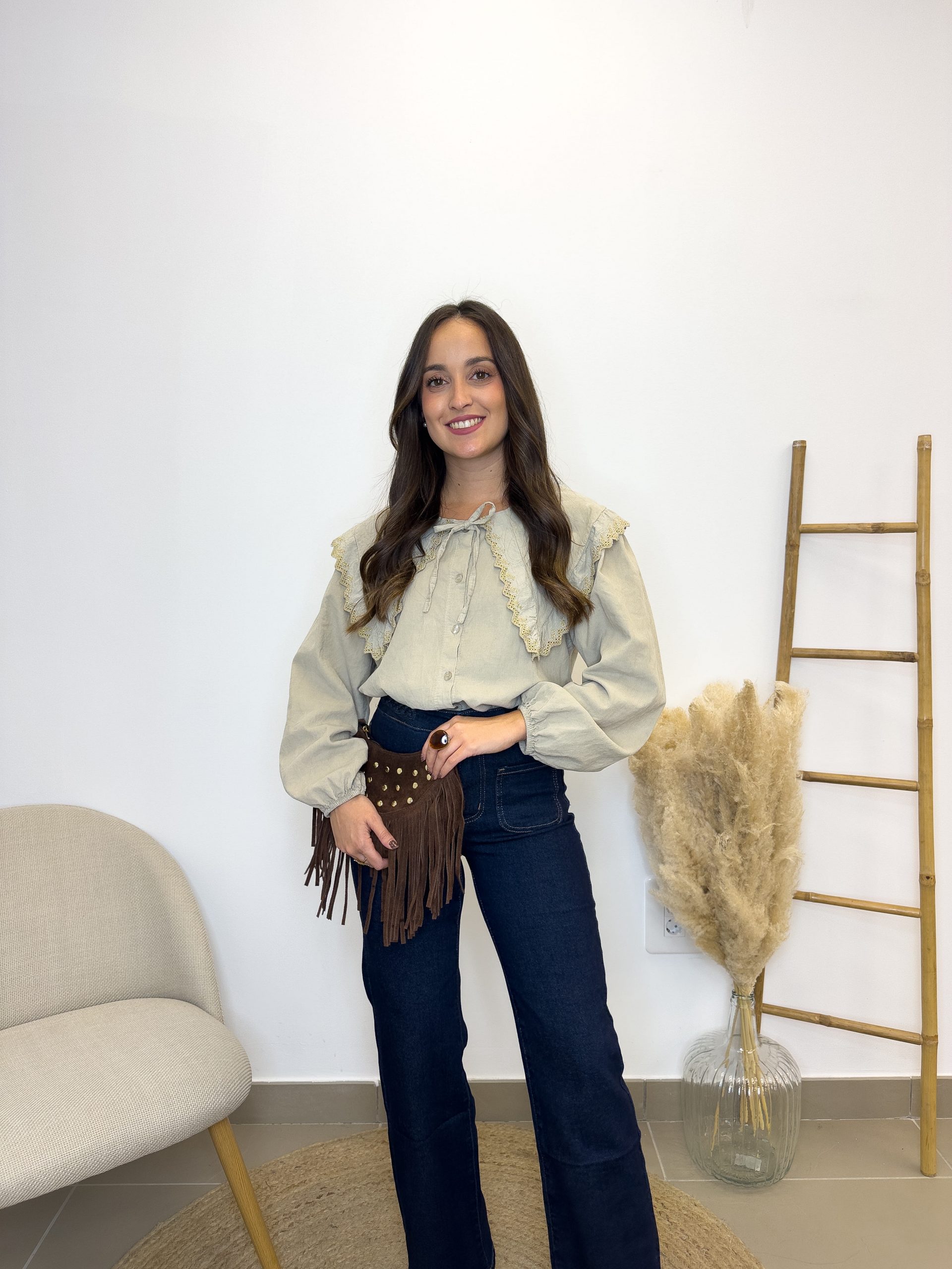 Esta blusa de pana beige tiene algo que enamora… Su cuello grande con solapas y la puntilla con detalles dorados le dan un aire romántico y muy cuidado.