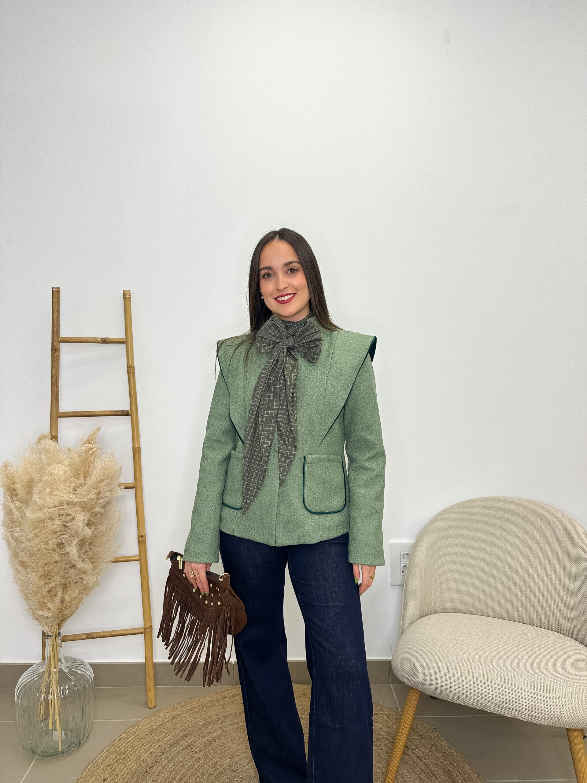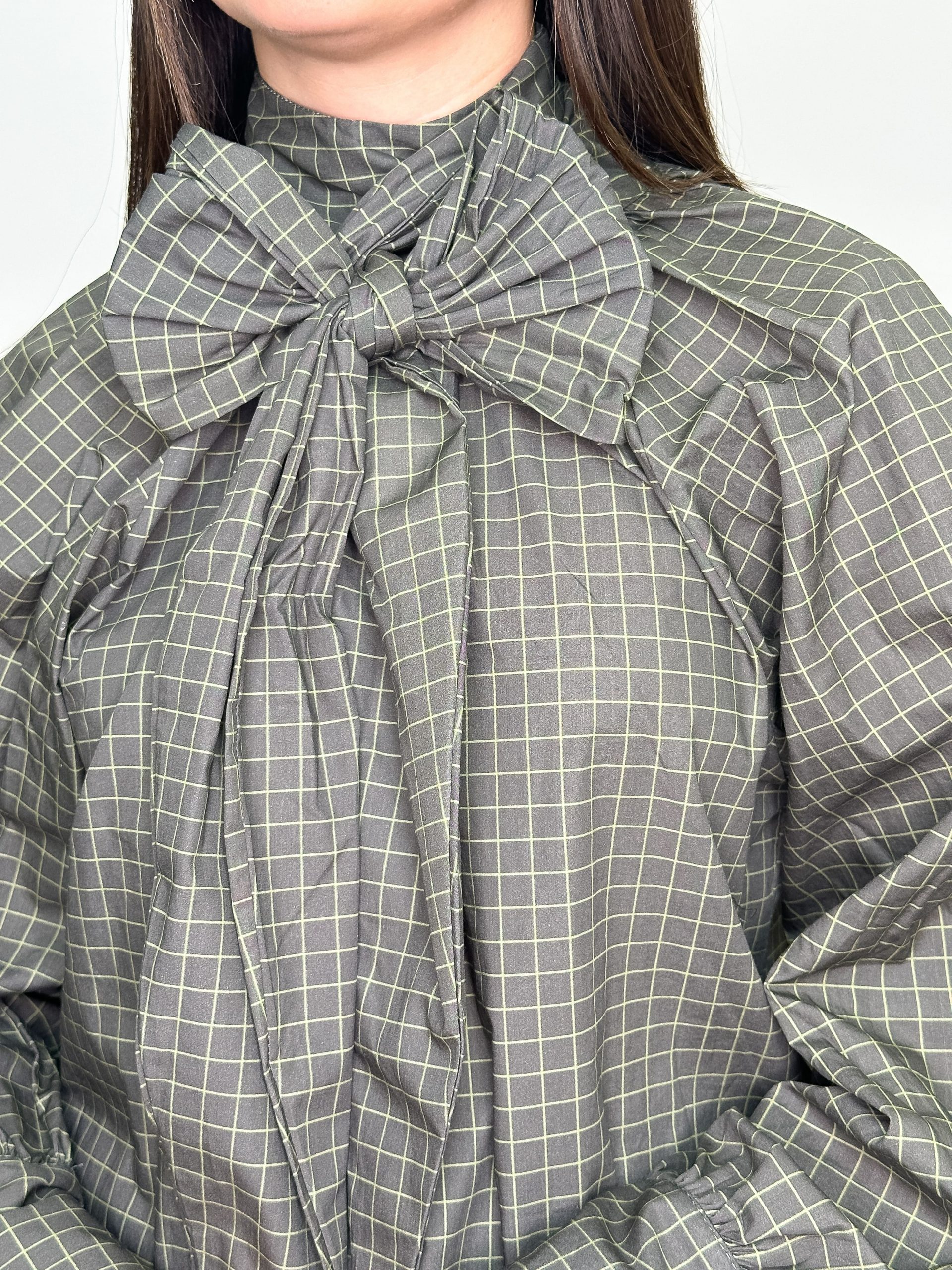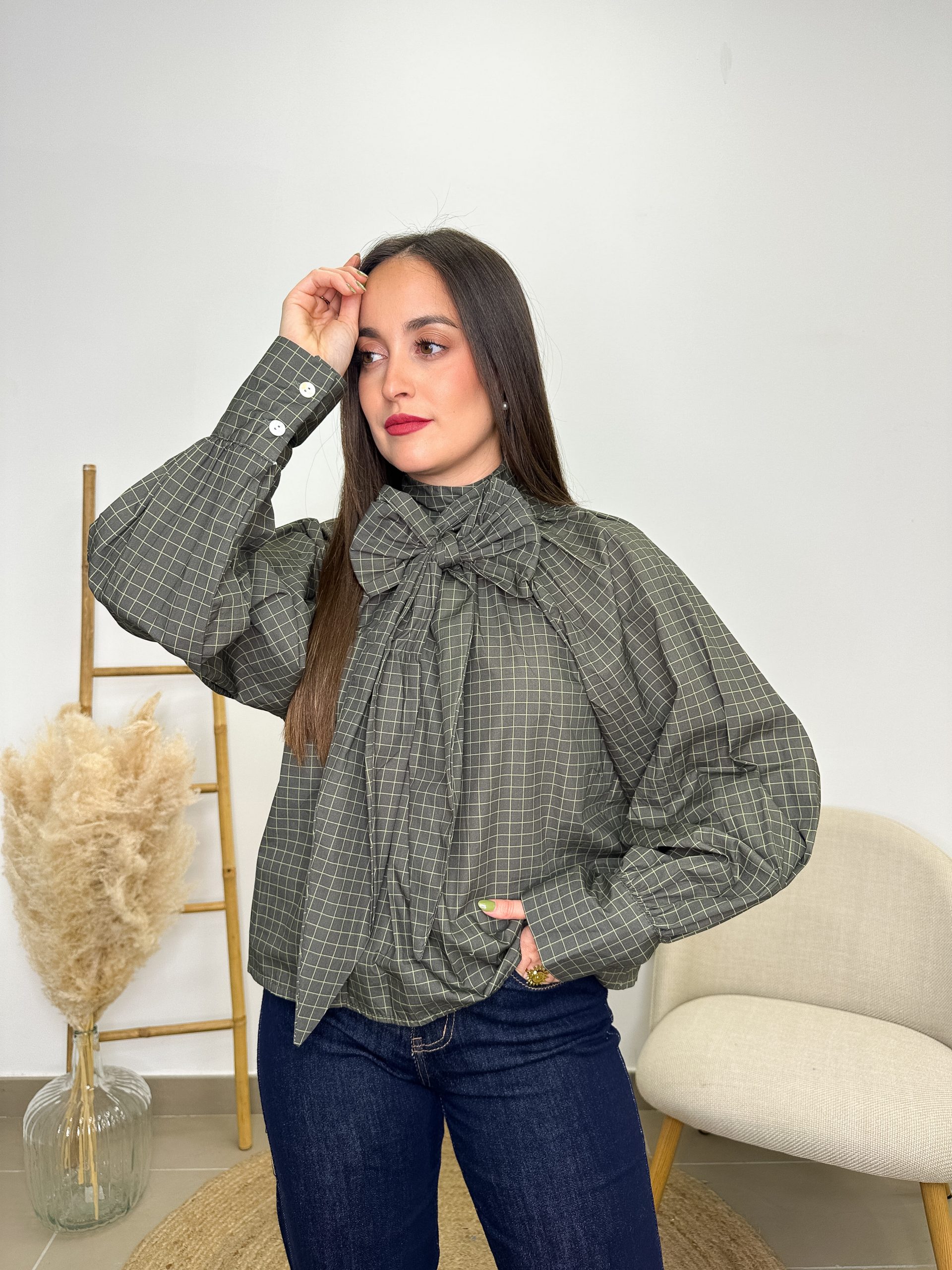 En tonos verde oscuro con finas líneas verde claro, su estampado de cuadros tiene personalidad sin ser excesivo. El cuello con lazada aporta ese puntito romántico que siempre suma, y las mangas tipo globo le dan movimiento y un toque muy femenino. Los puños estilo camisa, rematados con botones de nácar, hacen que se vea cuidada hasta el último detalle.