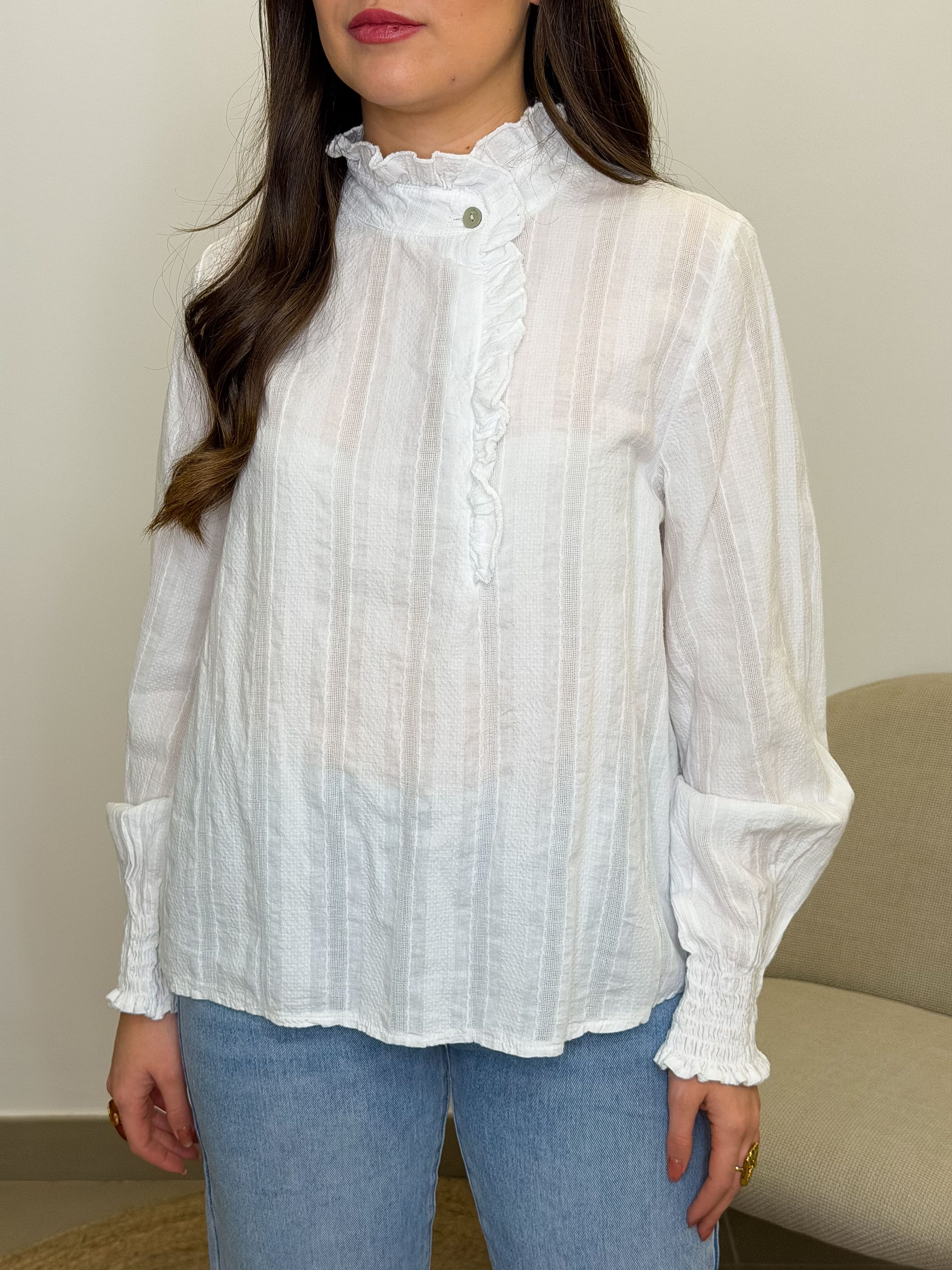 El cuello subido con mini volantito continúa suavemente hacia el pecho, creando un detalle fino y elegante que enmarca el rostro con muchísima dulzura. Las mangas terminan en puños fruncidos, rematados también con un pequeño volante que suma movimiento y delicadeza en cada gesto.