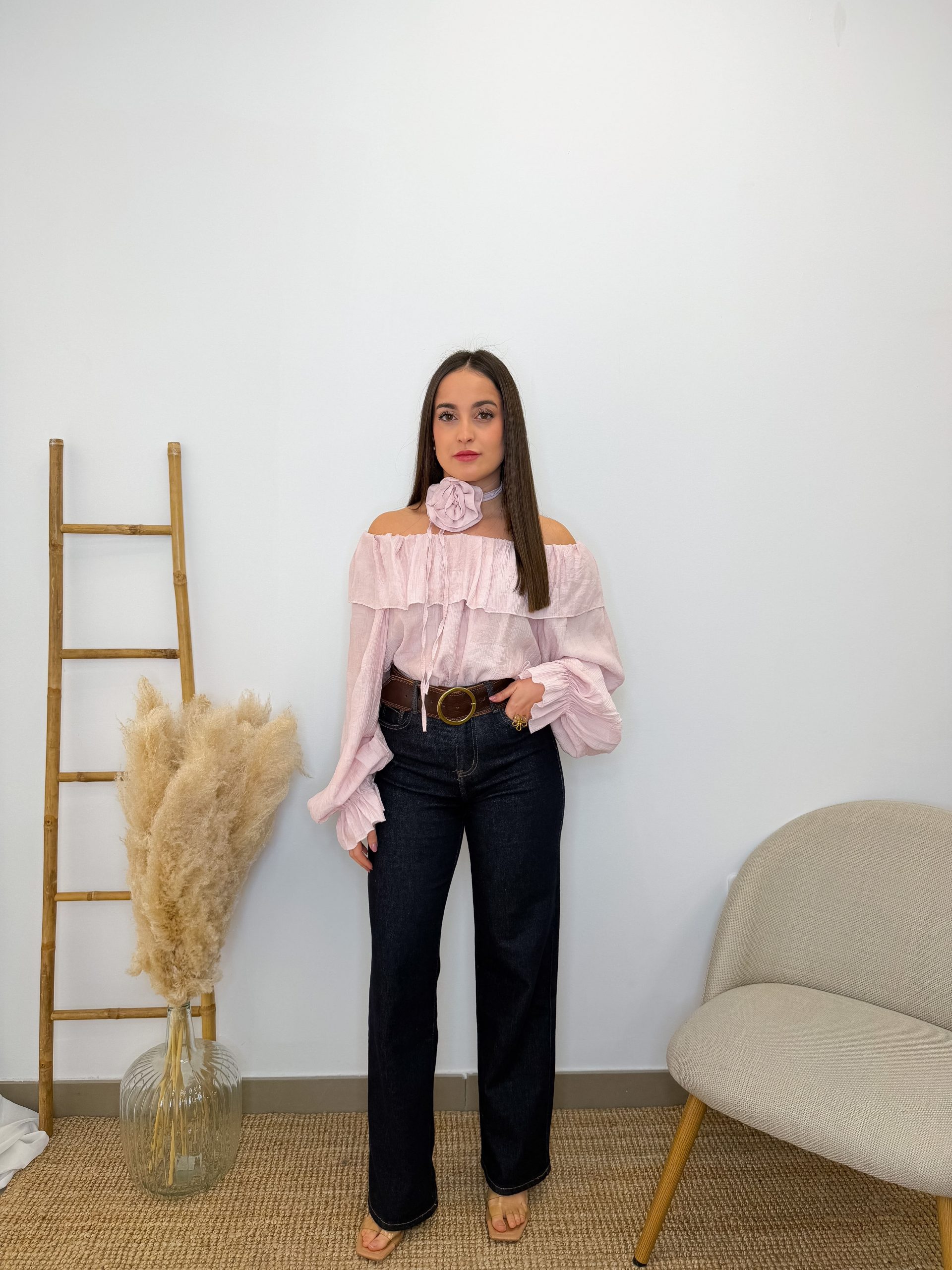 El rosa aporta luz y dulzura, mientras que la tela con textura arrugada le da un encanto natural, de esos detalles que hacen que se vea especial sin esfuerzo. Su escote palabra de honor con caída y elástico se adapta con suavidad y deja un efecto muy favorecedor, acompañado por un volante que recorre todo el escote y aporta movimiento.