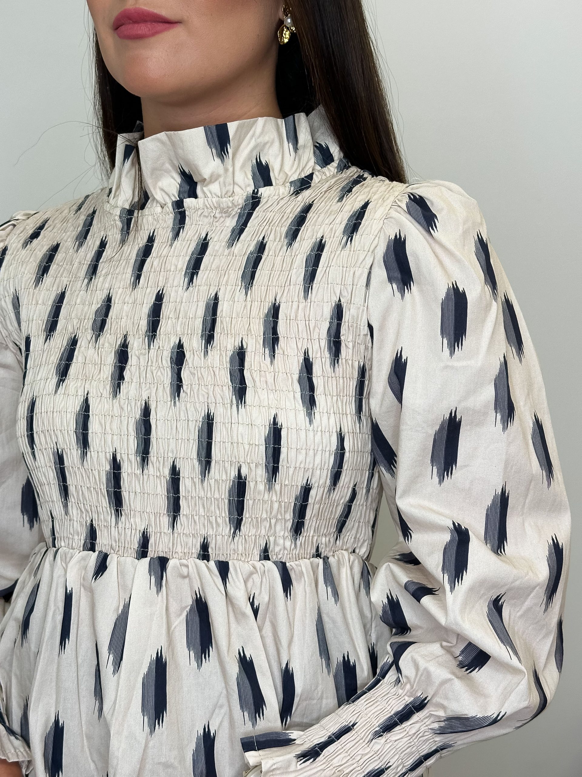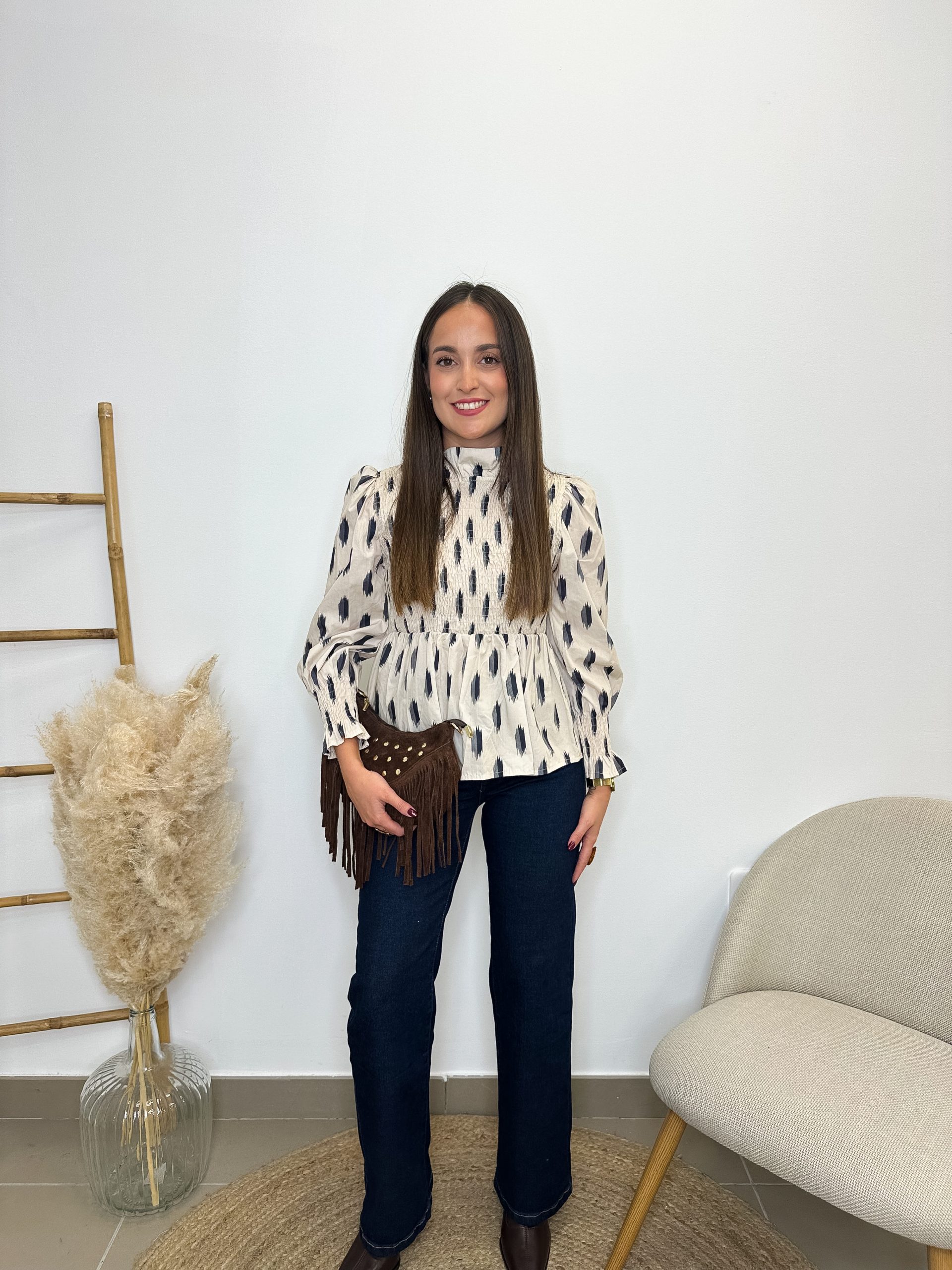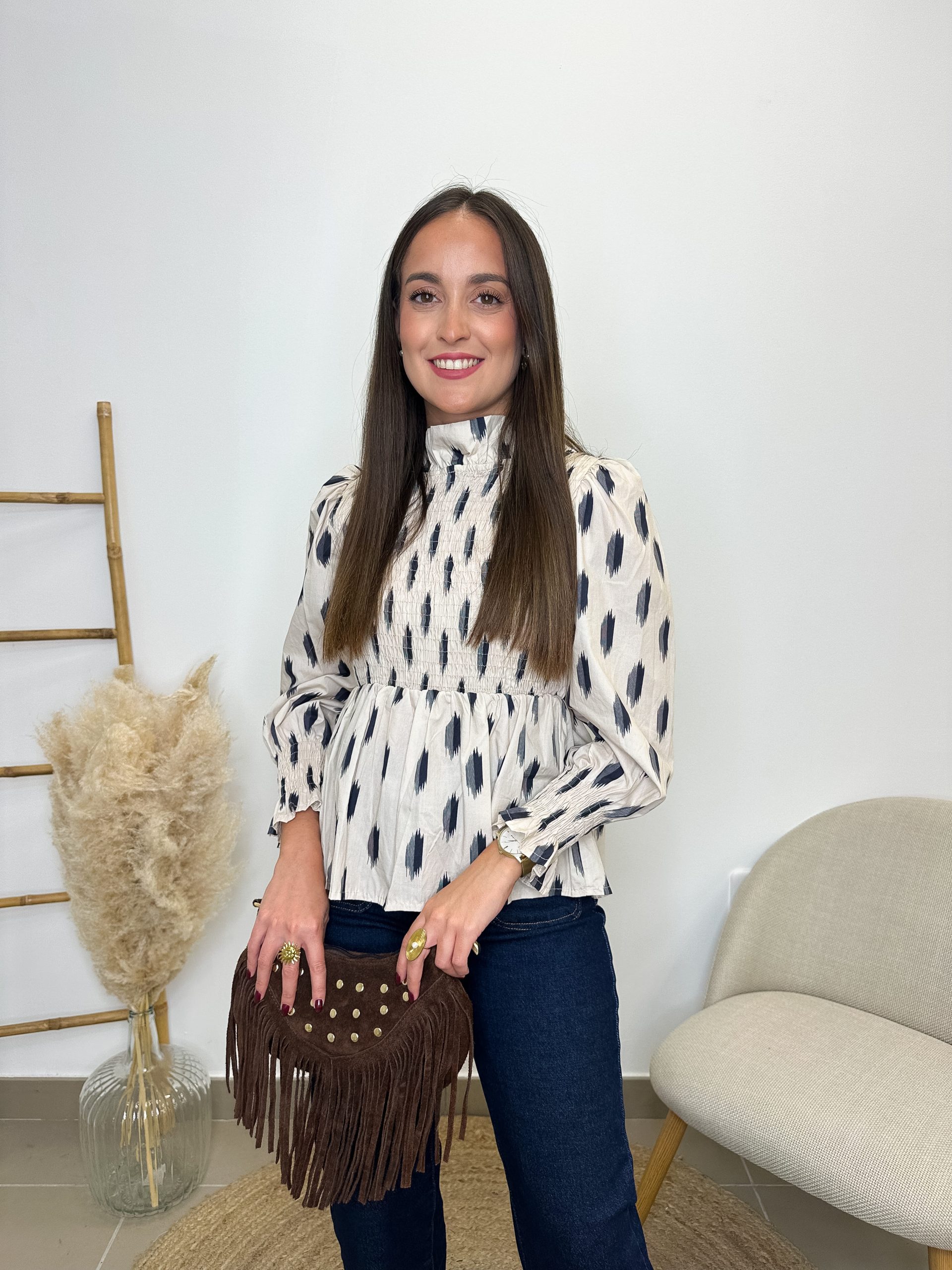 Suaves tonos, textura y un aire muy romántico. Esta blusa beige con topitos en azul marino tiene ese toque especial que realza sin esfuerzo. El nido de abeja en el pecho y los puños dibuja una silueta cómoda y femenina, mientras las mangas abullonadas y el cuello chimenea con cierre de botón aportan ese punto elegante que tanto nos gusta.