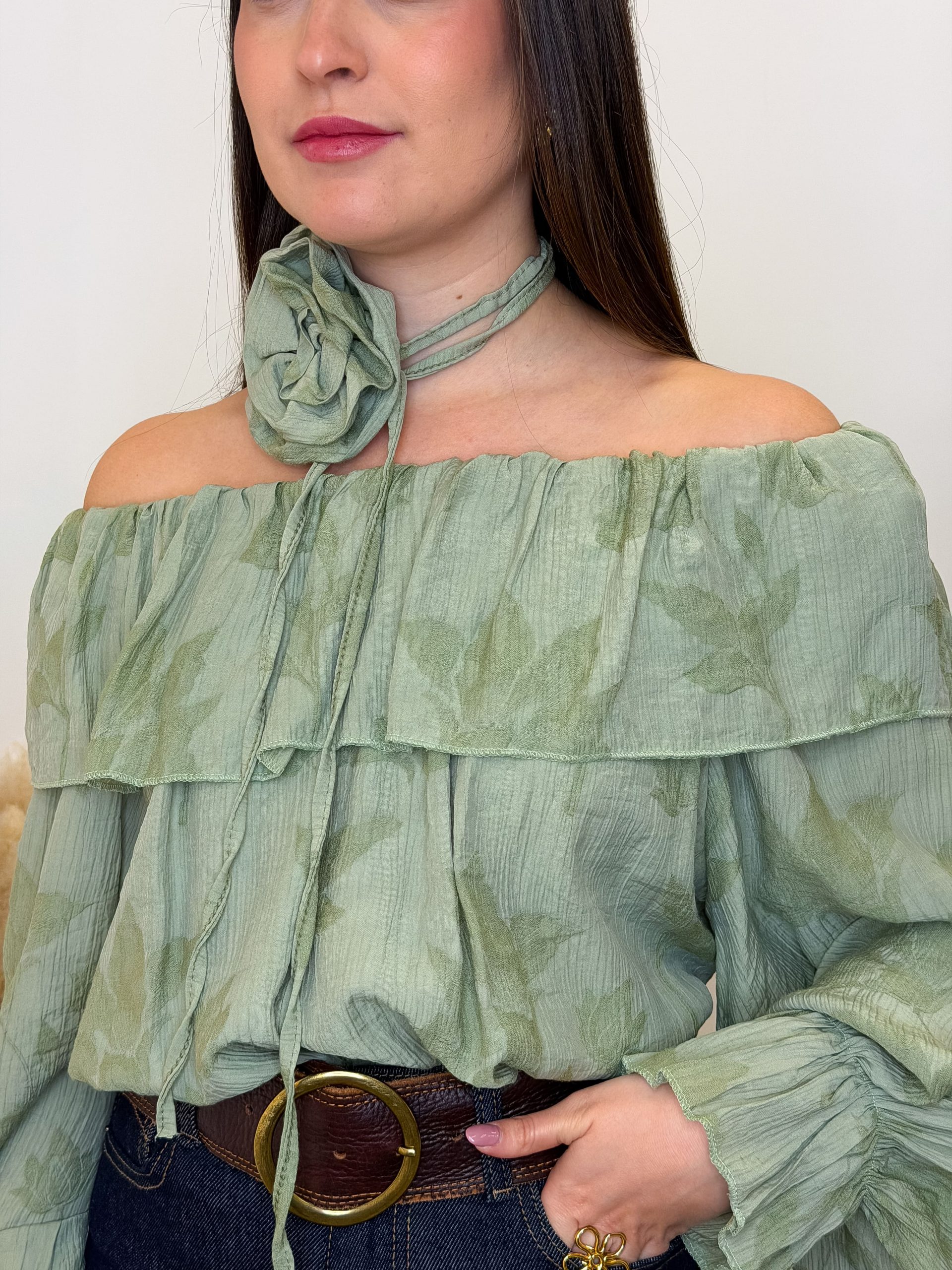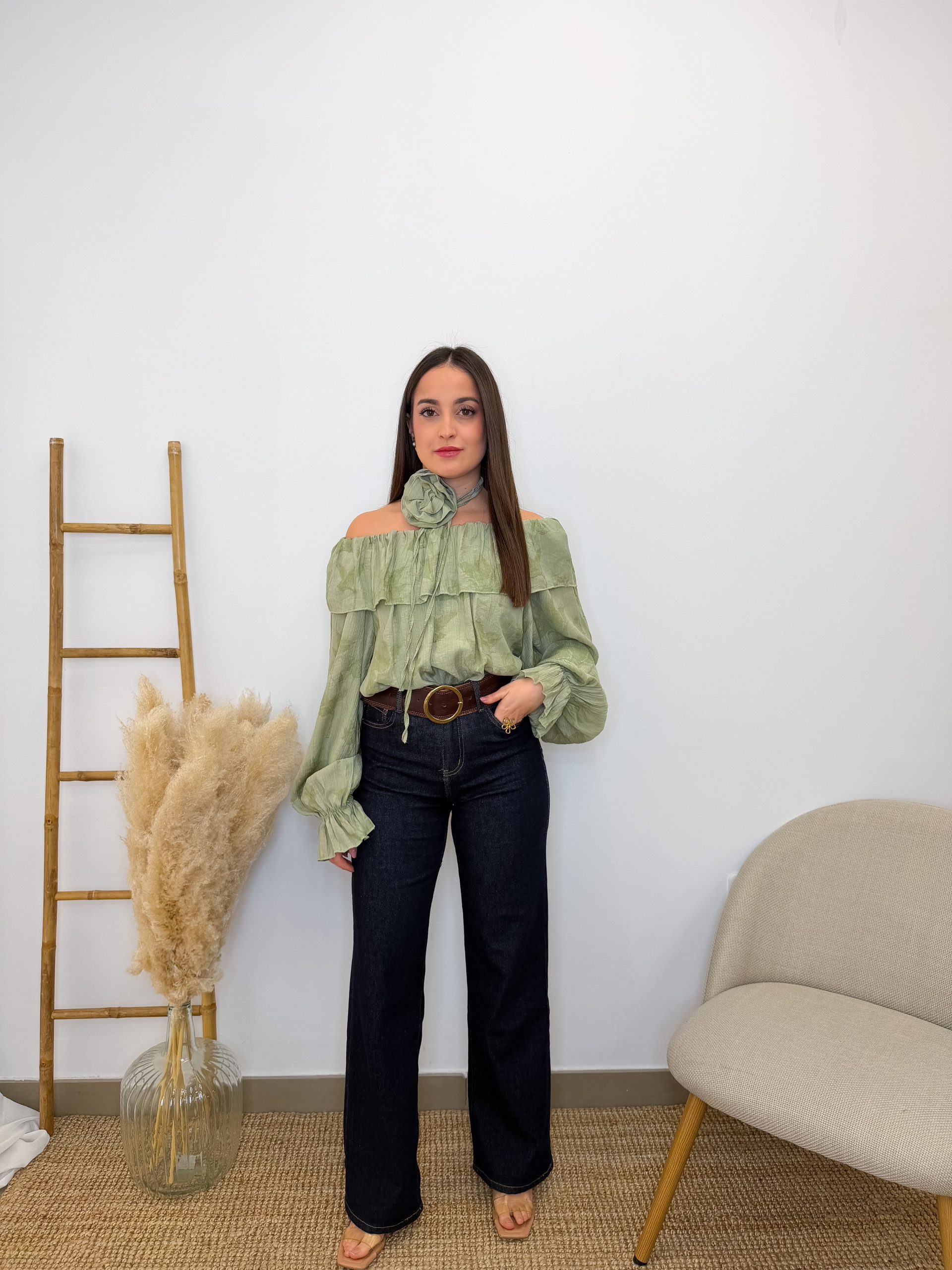 El verde aporta luz y dulzura, mientras que la tela con textura arrugada le da un encanto natural, de esos detalles que hacen que se vea especial sin esfuerzo. Su escote palabra de honor con caída y elástico se adapta con suavidad y deja un efecto muy favorecedor, acompañado por un volante que recorre todo el escote y aporta movimiento.