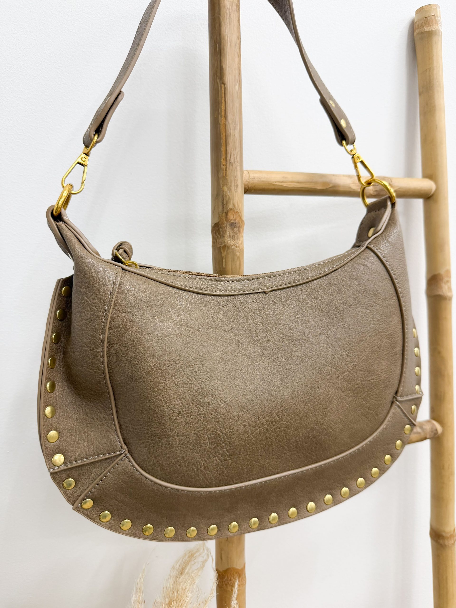 Este bolso de forma media luna en tono taupe es de esos que te acompañan todos los días sin cansarte de él. Elegante, versátil y muy fácil de combinar con cualquier look.