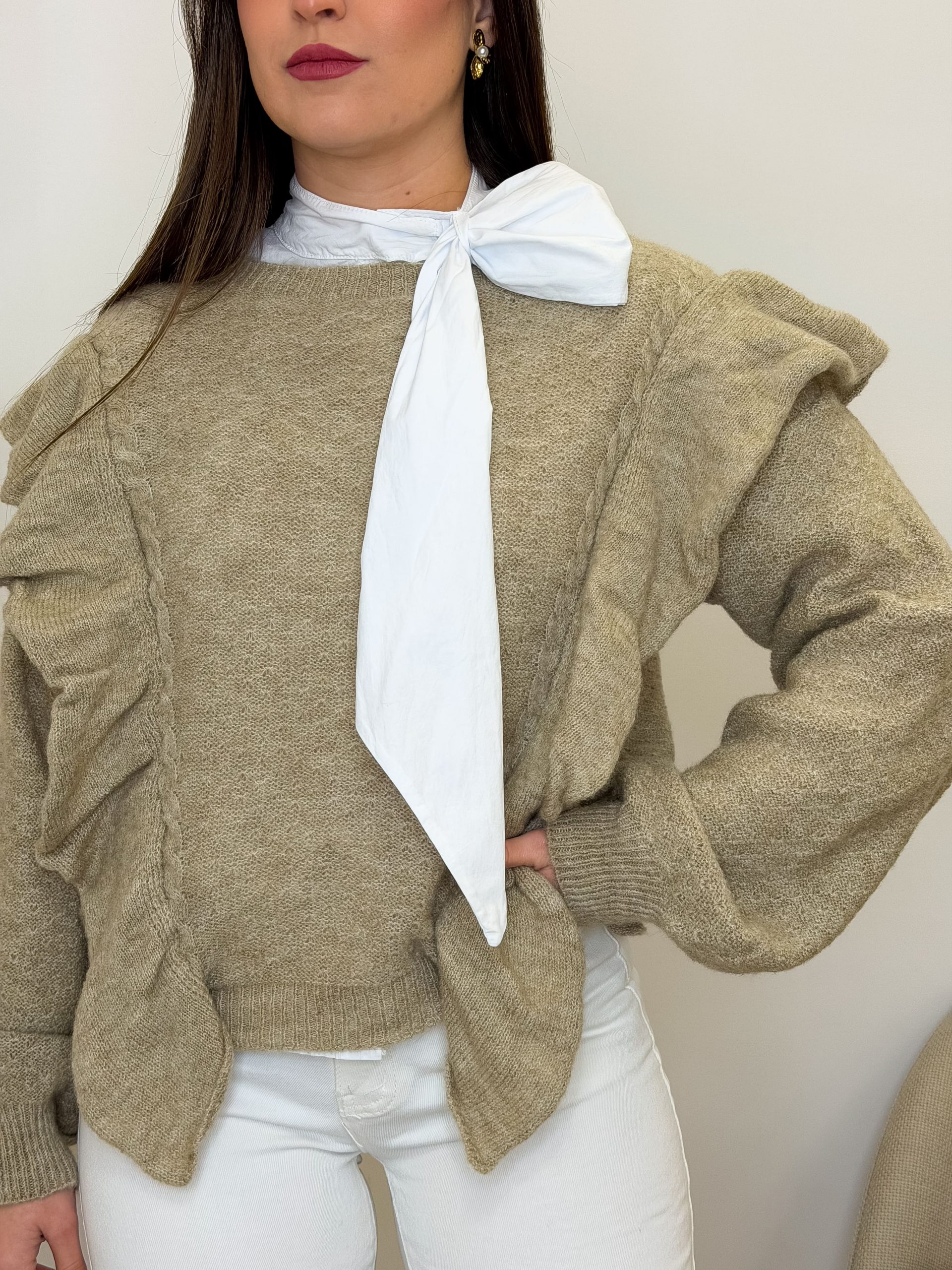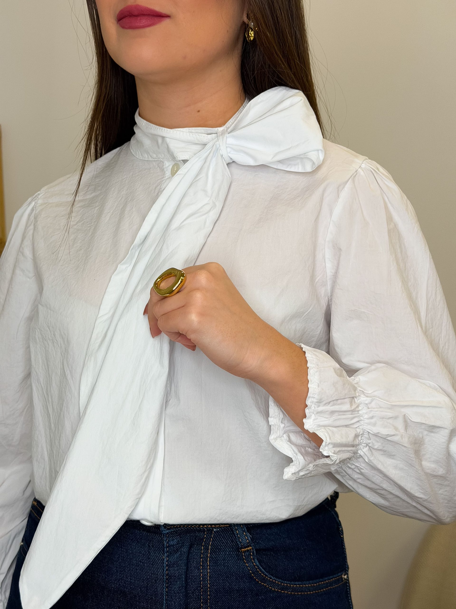 La lazada al cuello le da un aire femenino y elegante que puedes llevar anudada o suelta, según te apetezca. Los botones de nácar aportan luz y ese acabado bonito que eleva la camisa sin esfuerzo. Las mangas largas completan el diseño, haciéndola versátil y fácil de combinar.
