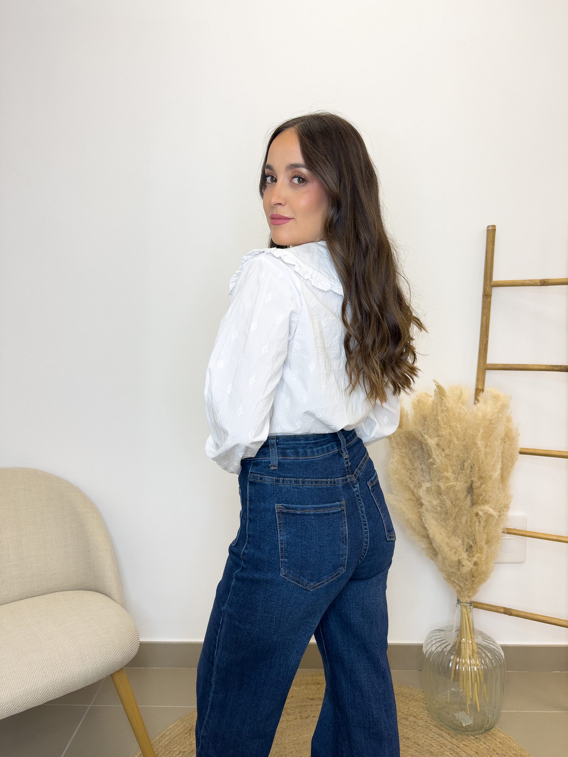 Una de esas prendas que tienen algo especial desde el primer vistazo. 🤍 Su tejido bordado en blanco crea un dibujo sutil y precioso, lleno de detalles que solo se aprecian de cerca. El cuello con solapas grandes y volante en el borde le da ese aire romántico y delicado, como de esas camisas que nunca pasan de moda. Abotonada por el centro, es suave, cómoda y con mucha personalidad.