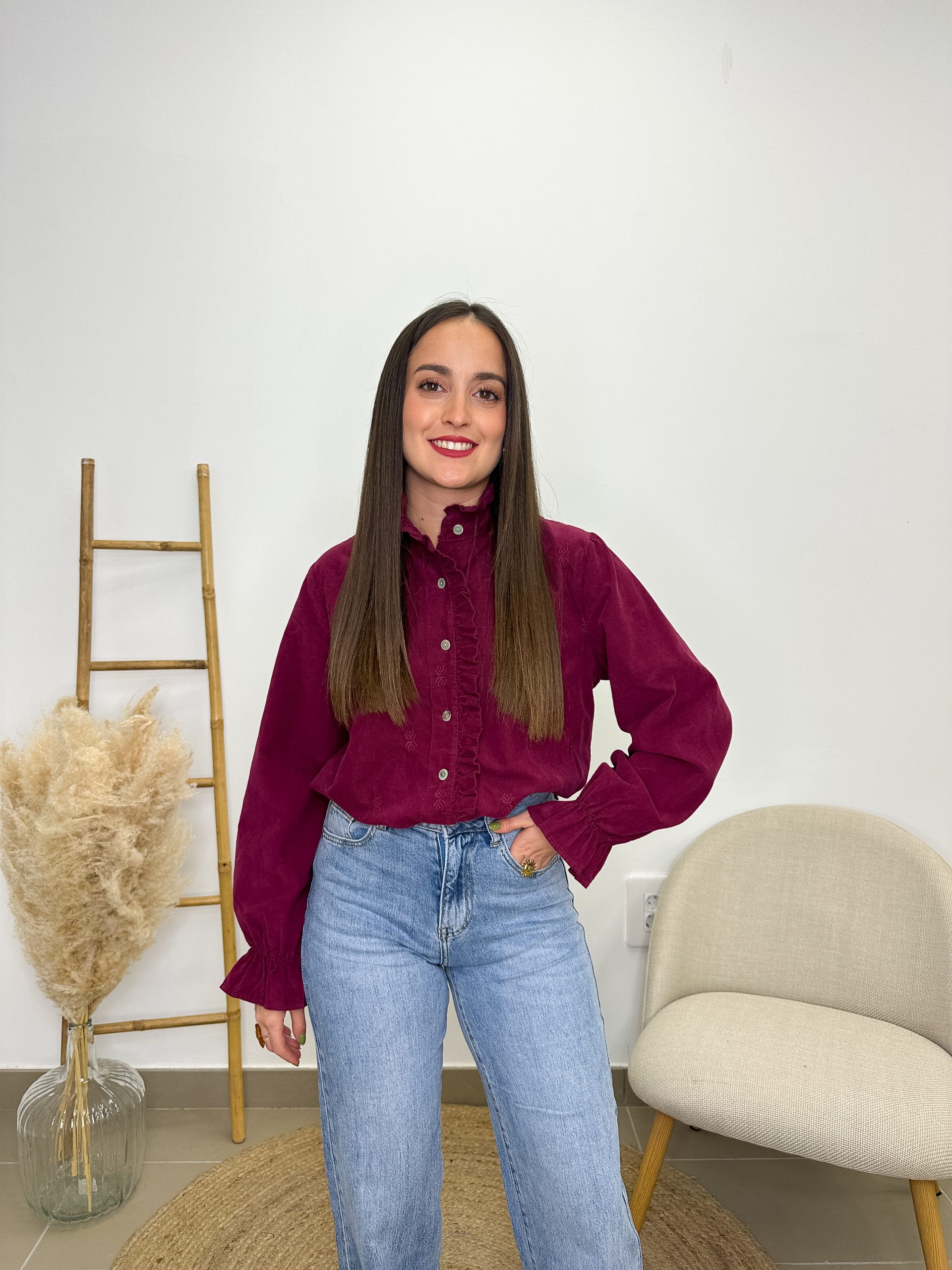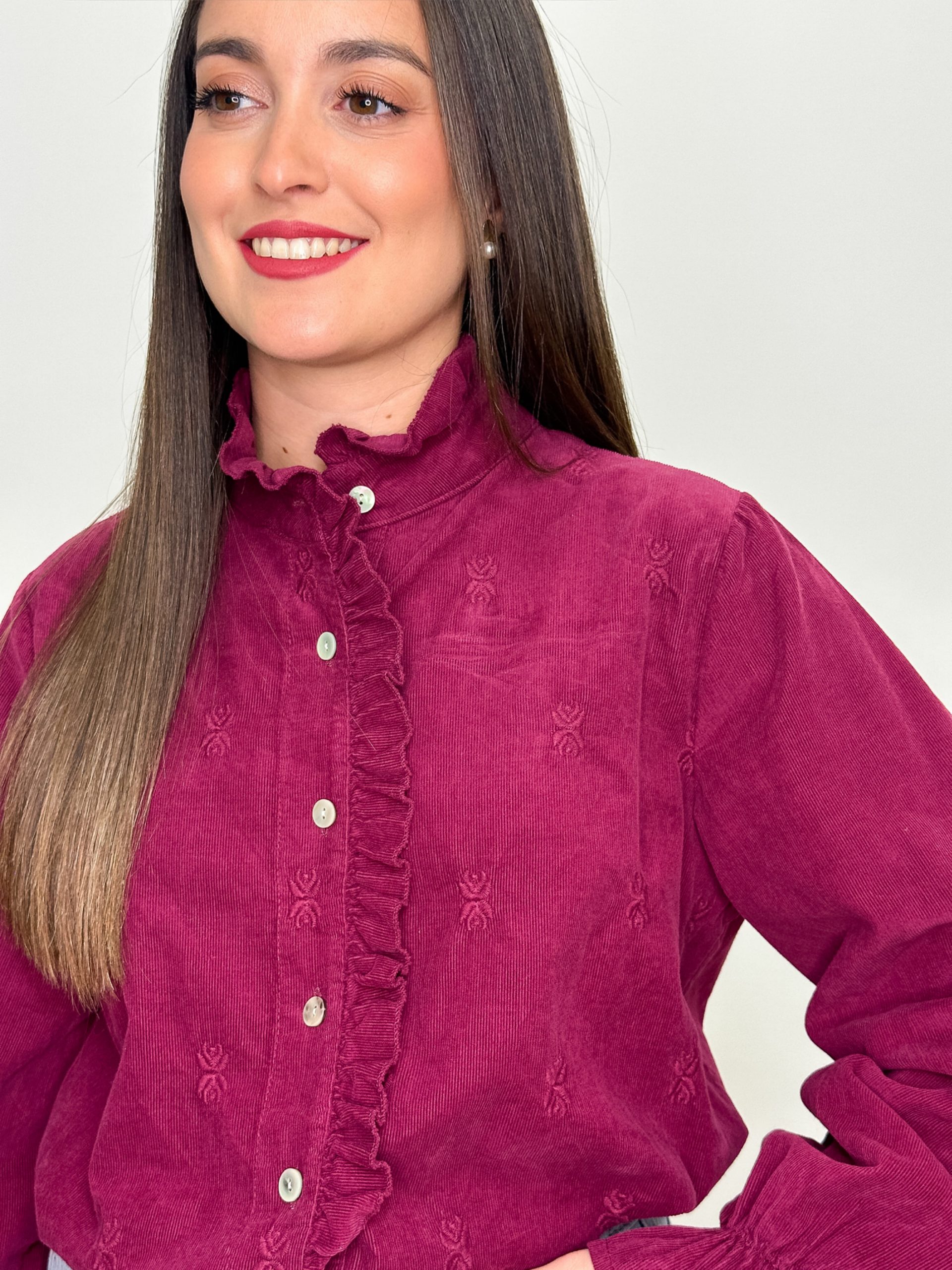Está hecha en pana suave, con ese rollo cálido y un pelín retro que tanto nos gusta. Lleva un cuello chimenea que estiliza un montón, un pequeño volante que acompaña la línea de los botones y un bordado delicado en el mismo tono que la hace todavía más bonita. Las mangas terminan en puño engomado para darte ese efecto abullonado tan femenino.