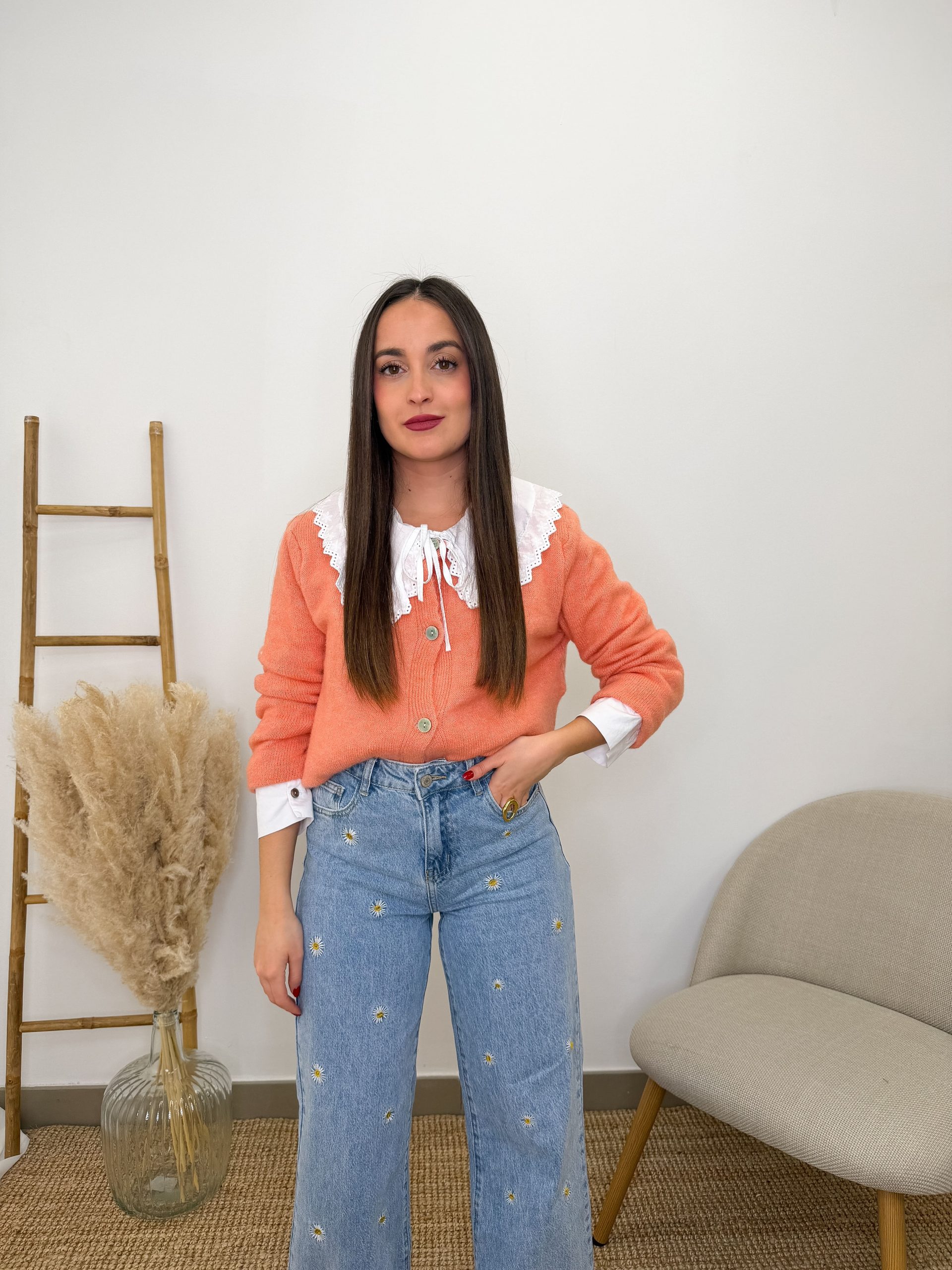 Este cárdigan de algodón en tono naranja tiene algo especial. Es alegre, favorecedor y de esos que iluminan la piel al instante. Cuando te lo pones, notas cómo suaviza el look y le da vida, incluso a los conjuntos más sencillos.