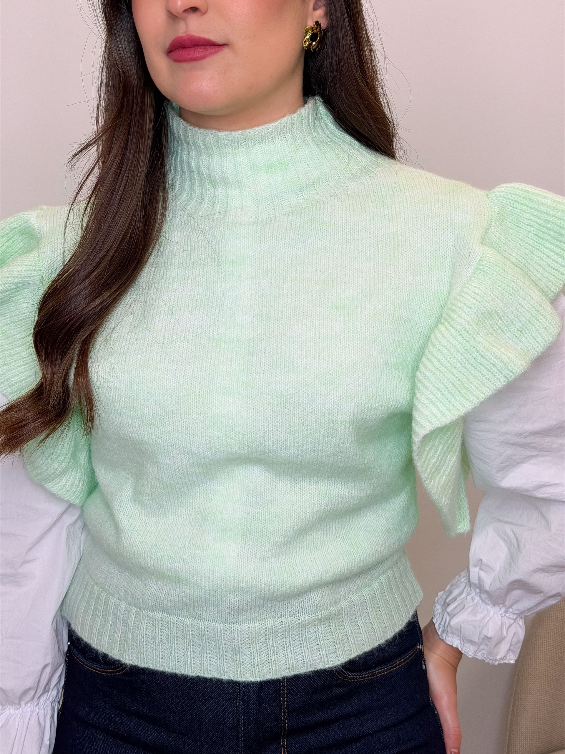 Su punto suave es cómodo y agradable, de esos que sientan bien y no molestan. Los volantes sobre los hombros le dan un aire femenino y especial, enmarcan la parte superior y aportan movimiento sin recargar. Tiene ese equilibrio perfecto entre dulzura y estilo.