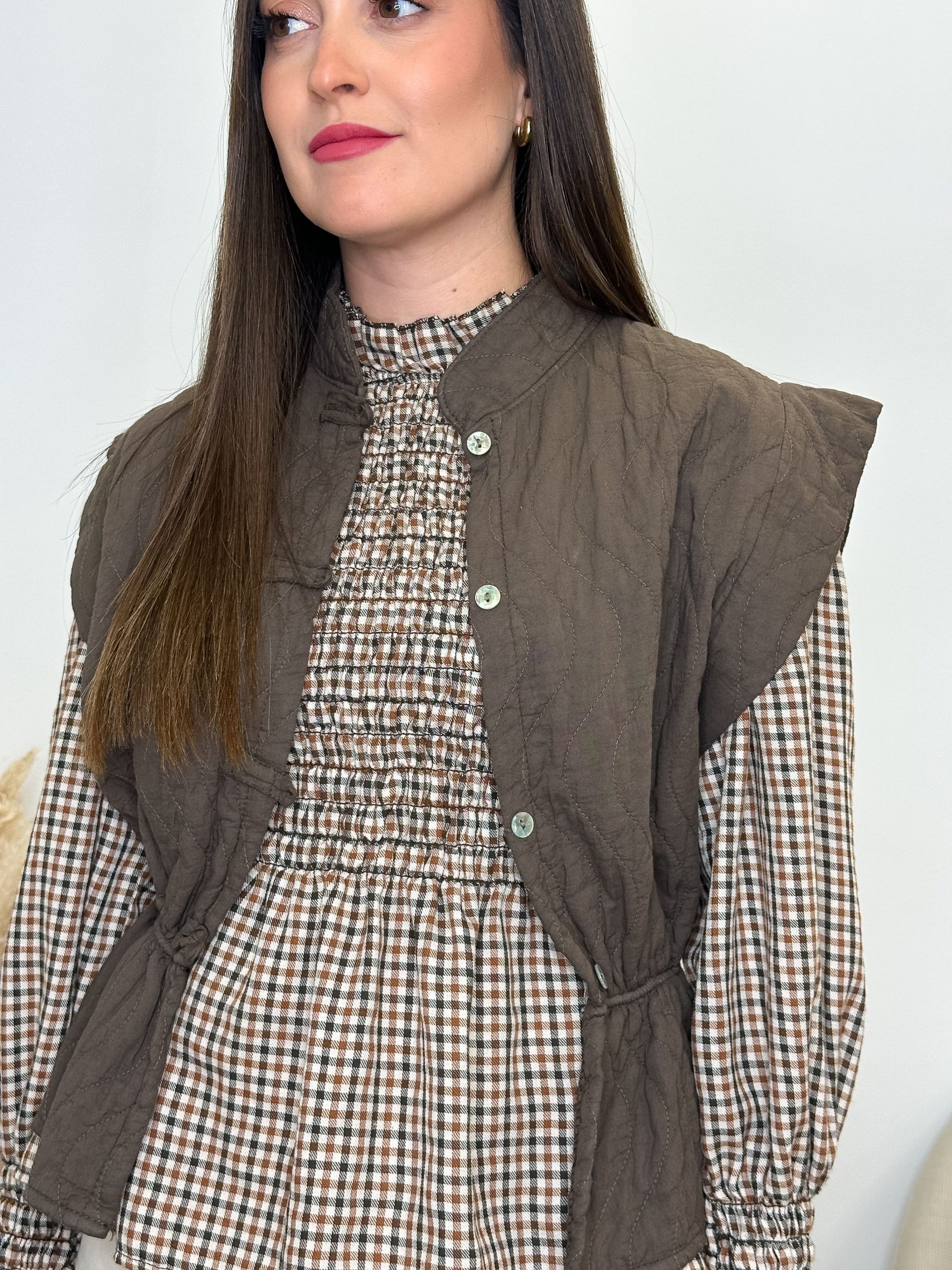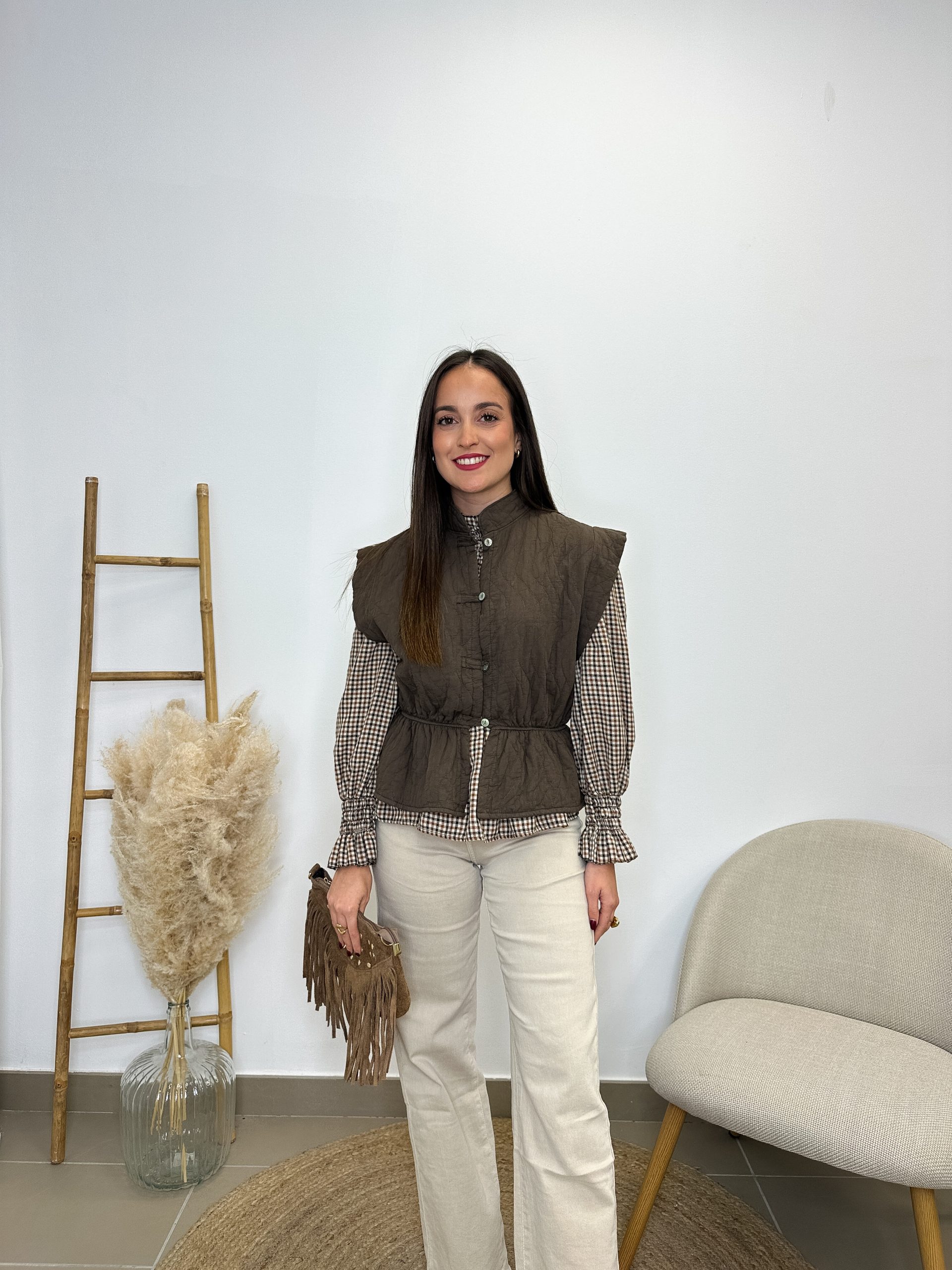 Hay prendas que abrazan sin apretar, y este chaleco marrón es una de ellas. Tiene ese aire coqueto y cálido que te hace sentir arreglada sin complicarte la vida.