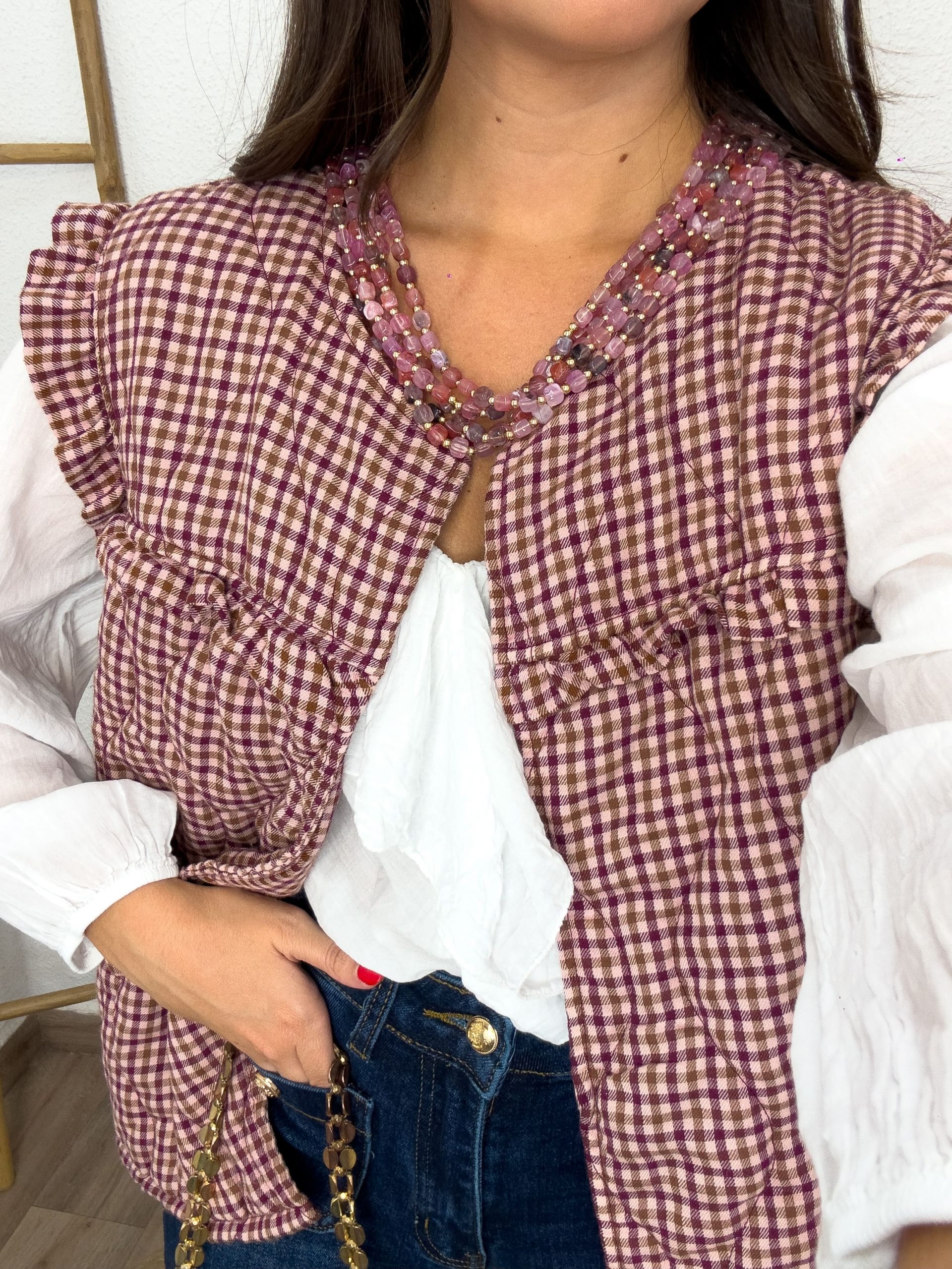 Cuando te lo pones, notas cómo el acolchado suave te abraza con comodidad y estilo. El estampado de cuadros vichy en buganvilla, beige y camel le da un aire alegre y sofisticado a la vez, mientras que los volantes en hombros y pechoaportan un toque femenino y coqueto.