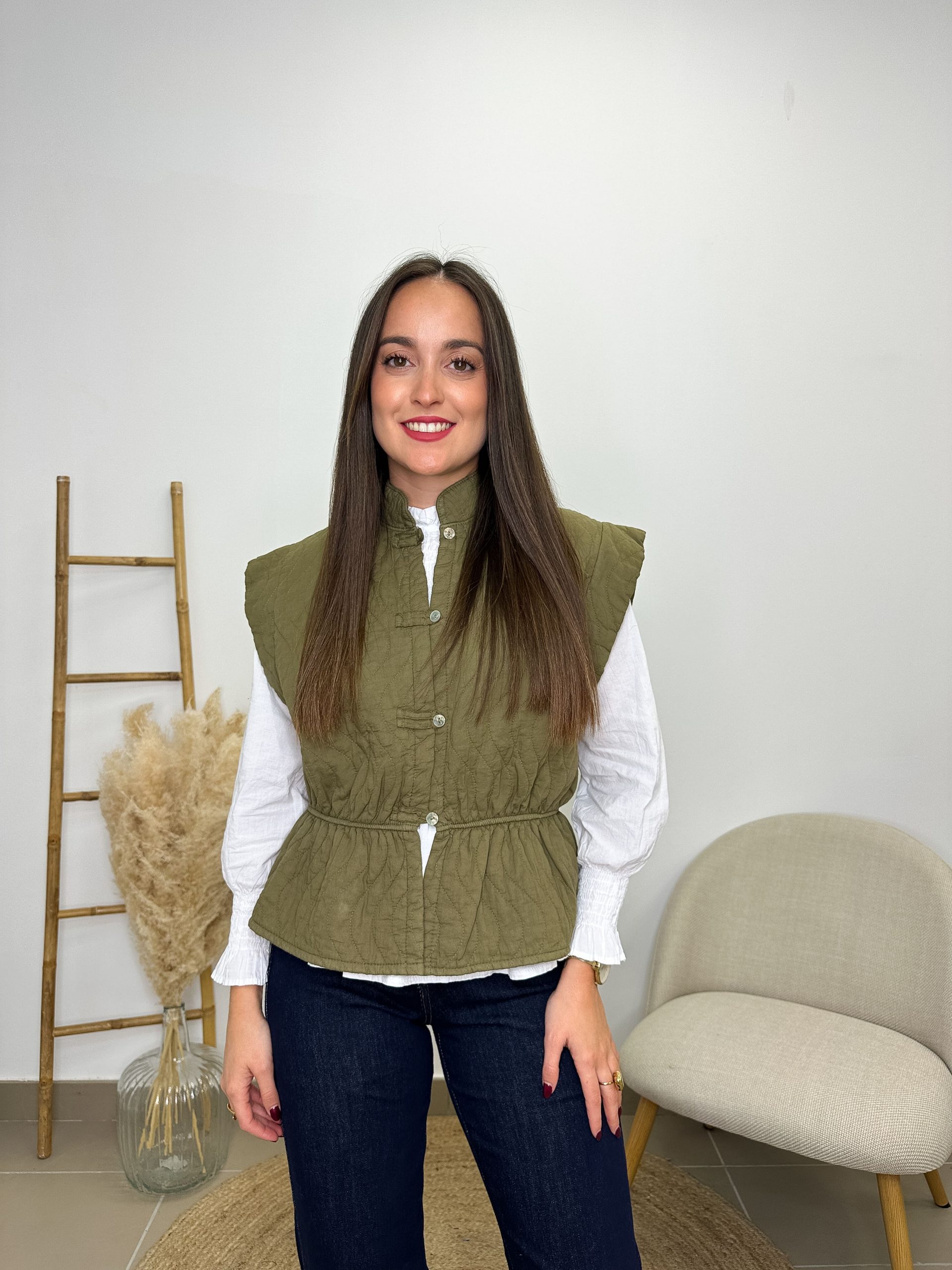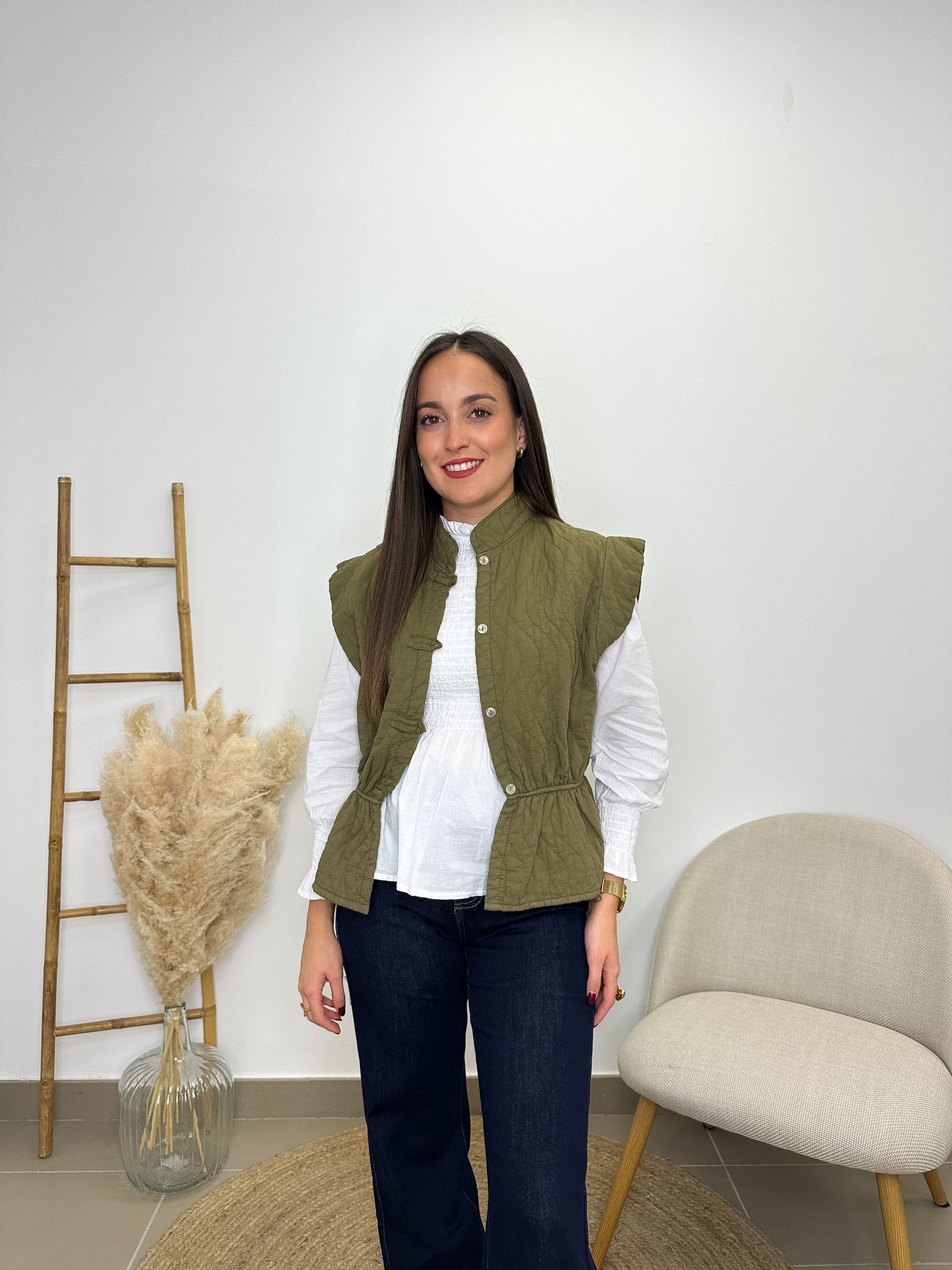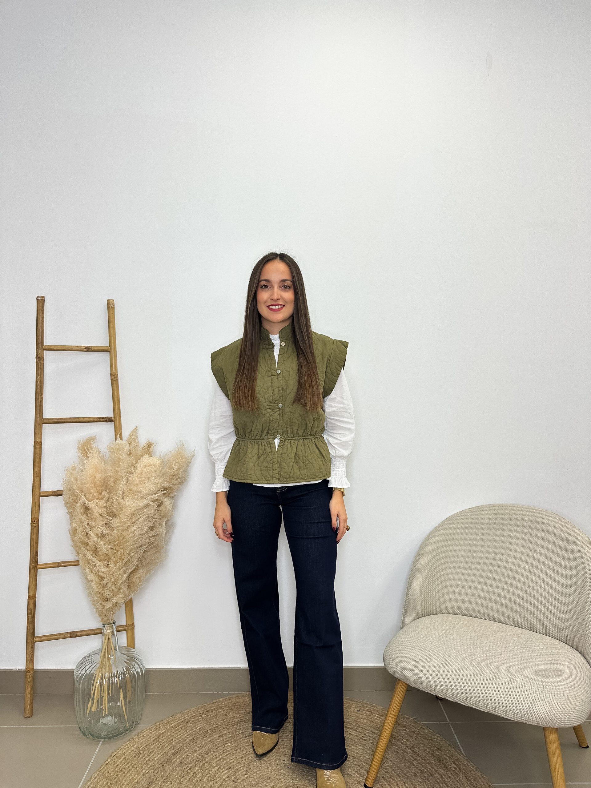 Hay prendas que abrazan sin apretar, y este chaleco en tono verde oliva es una de ellas. Tiene ese aire coqueto y cálido que te hace sentir arreglada sin complicarte la vida.