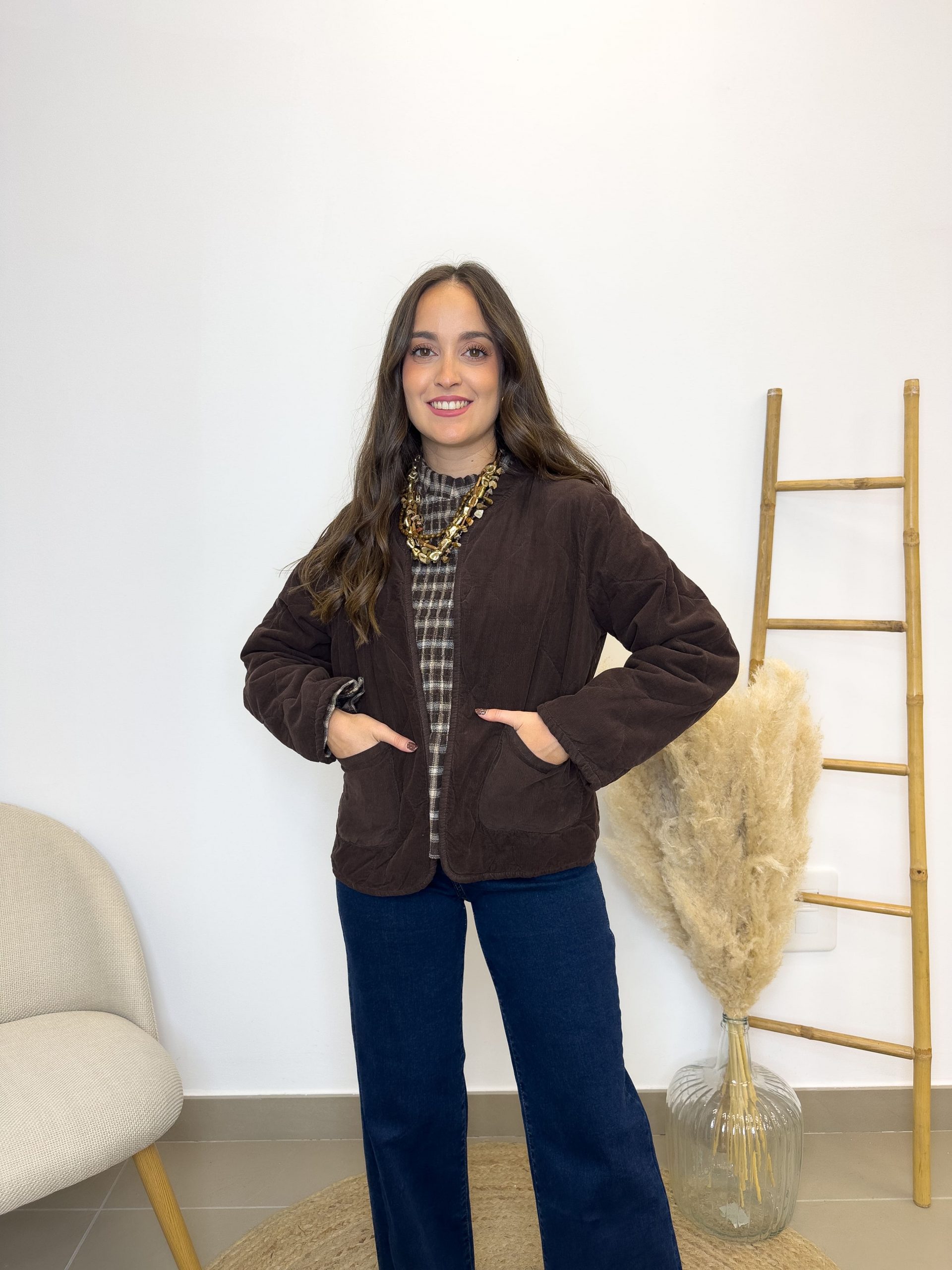 Esa chaqueta que abriga con encanto. ✨ Confeccionada en pana suave color marrón oscuro, tiene un acolchado con costuras en forma de ondas que la hace especial y diferente. El cuello redondo con volante le da ese toque romántico y delicado que tanto nos gusta, y su corte recto con bolsillos delanteros la hace cómoda y muy ponible. No lleva botones, para que puedas llevarla abierta y dejar que se vea tu look.