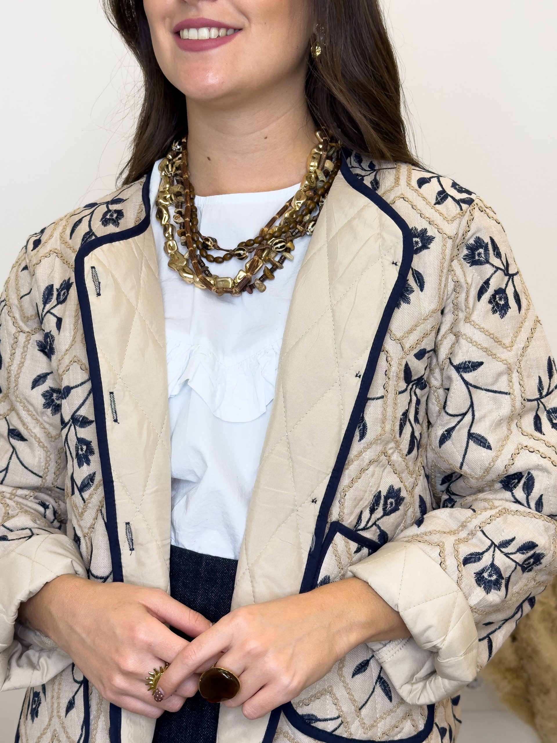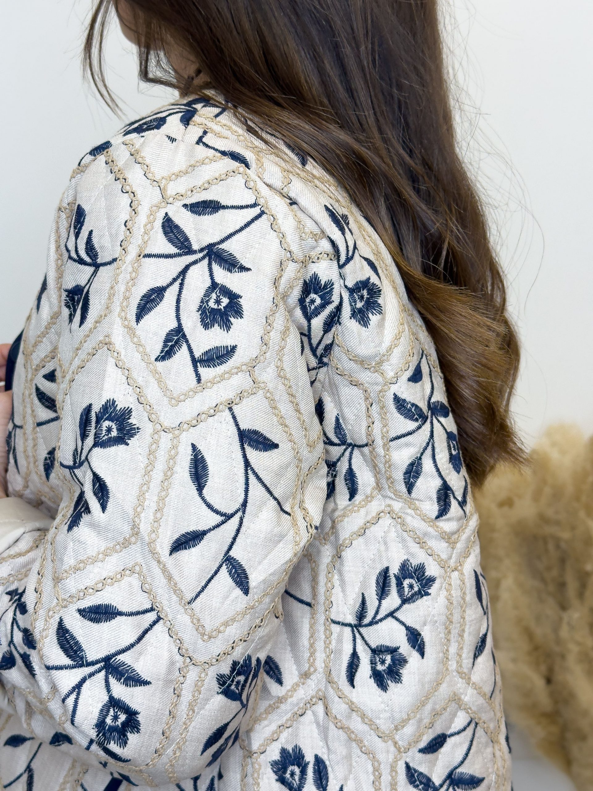 Esta chaqueta bordada en beige es una joyita. Su tejido suave y ligeramente acolchado está lleno de flores en azul marino, realzadas con un bordado en hilo beige que las enmarca con delicadeza.