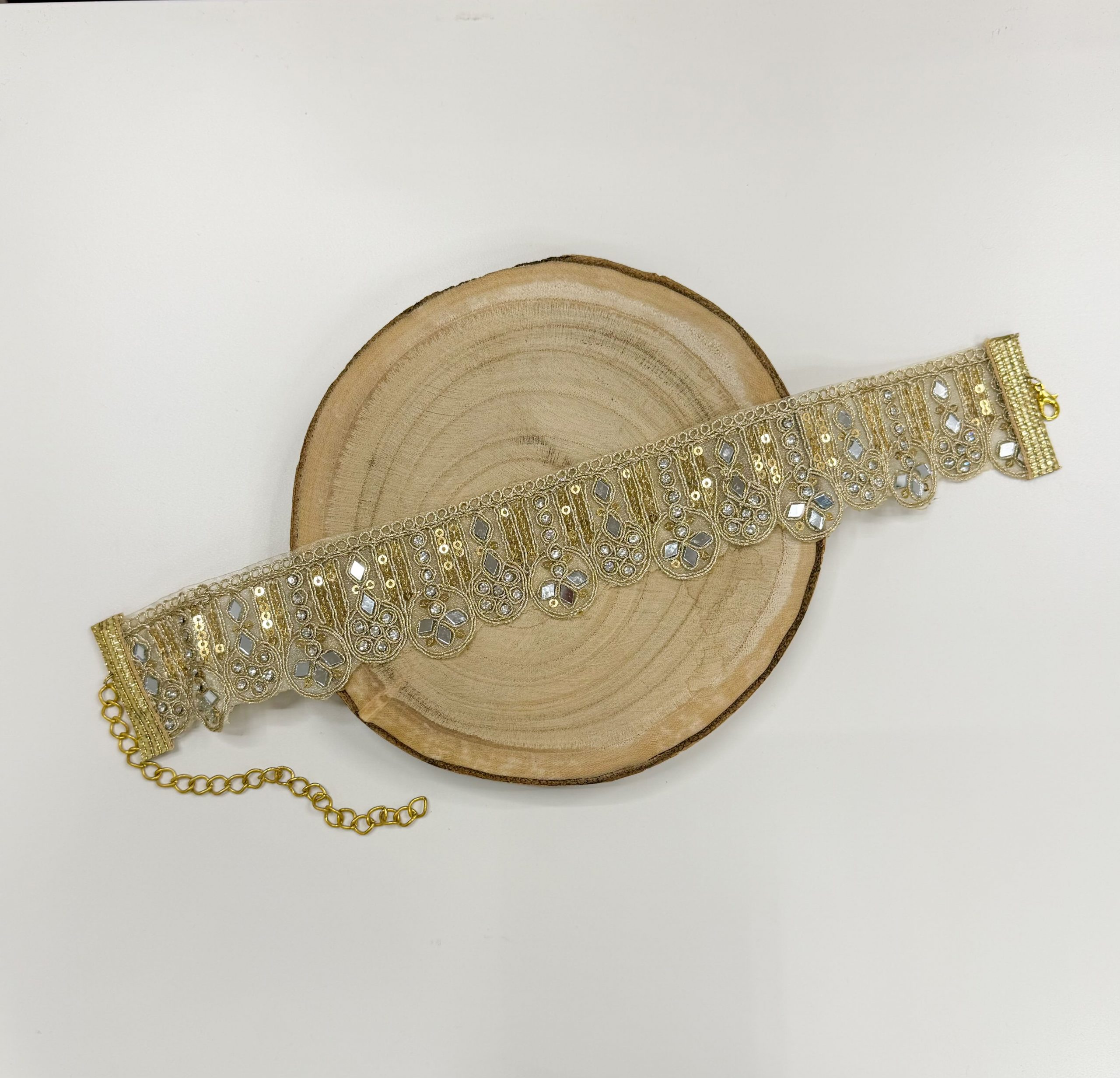 Su diseño ancho aporta presencia y enmarca el cuello con un aire elegante y muy actual. Las lentejuelas doradas reflejan la luz con cada movimiento, creando destellos sutiles que iluminan el rostro. Y los mini rombos y círculos añaden textura y un juego visual muy bonito, lleno de pequeños detalles que marcan la diferencia.