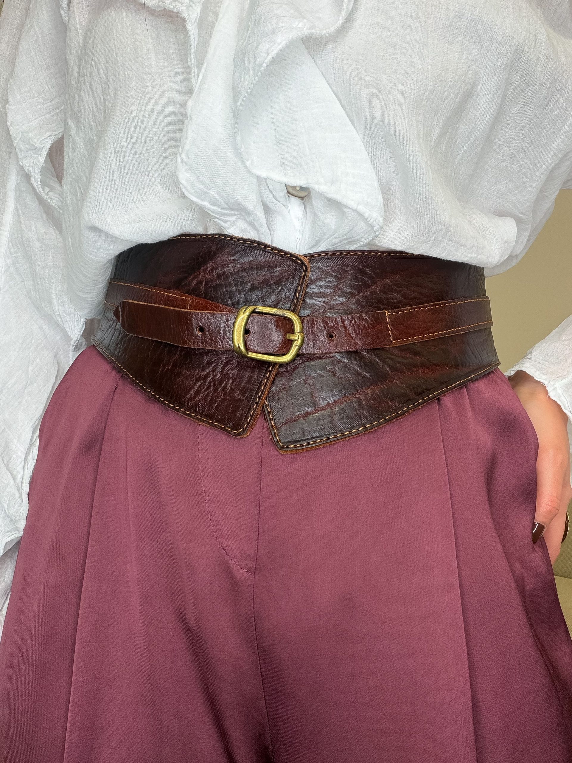 Este cinturón de piel marrón chocolate tiene el ancho justo para marcar la cintura con estilo, sin apretar. La hebilla dorada redonda le da ese punto elegante que hace que un look sencillo pase a ser especial al instante.