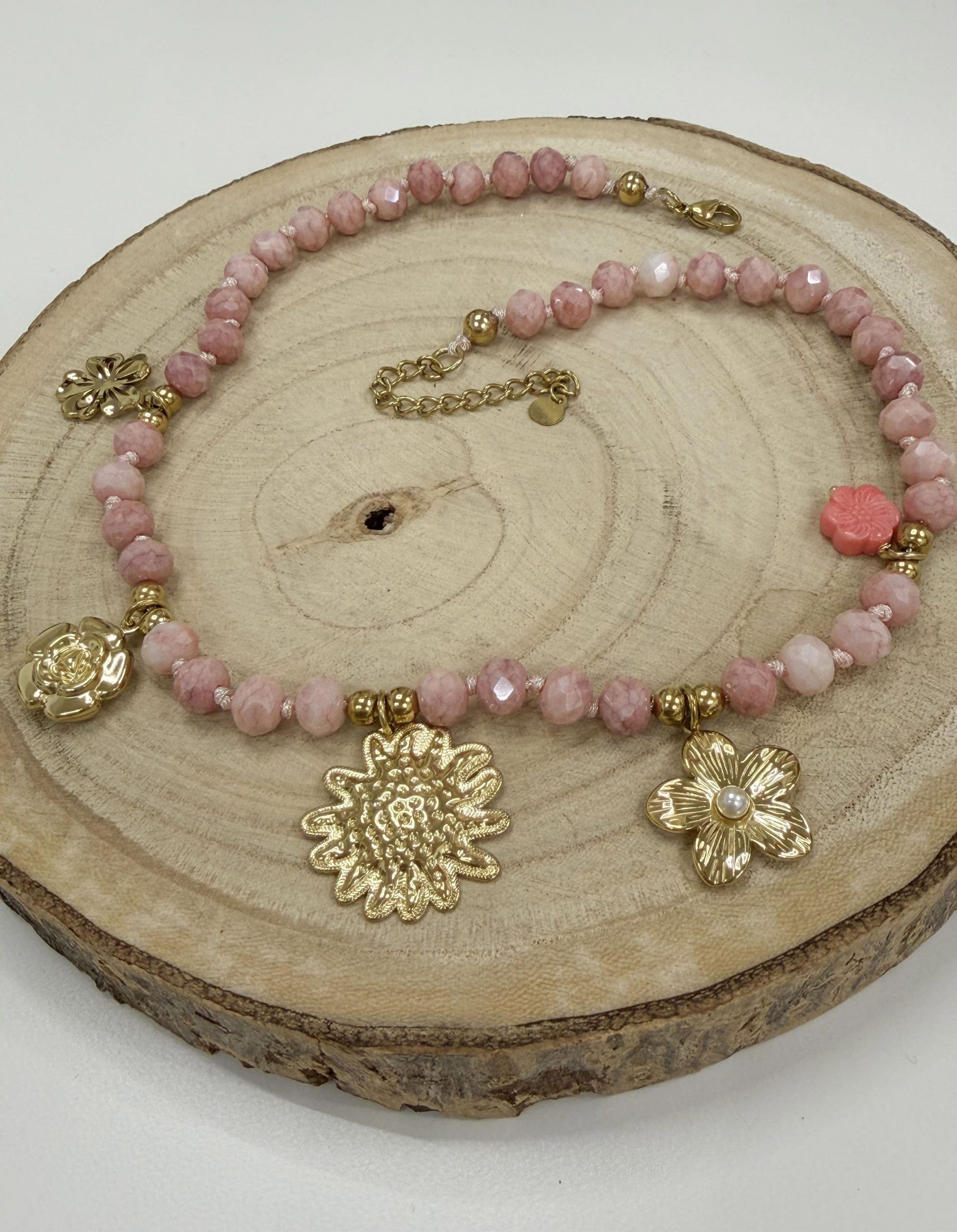 Este collar dorado está lleno de pequeños detalles que lo hacen único. A lo largo de la pieza se combinan bolitas en tono rosa suave, que aportan dulzura y un aire femenino muy sutil, con flores doradas distribuidas con delicadeza, creando un diseño armonioso y lleno de luz.
