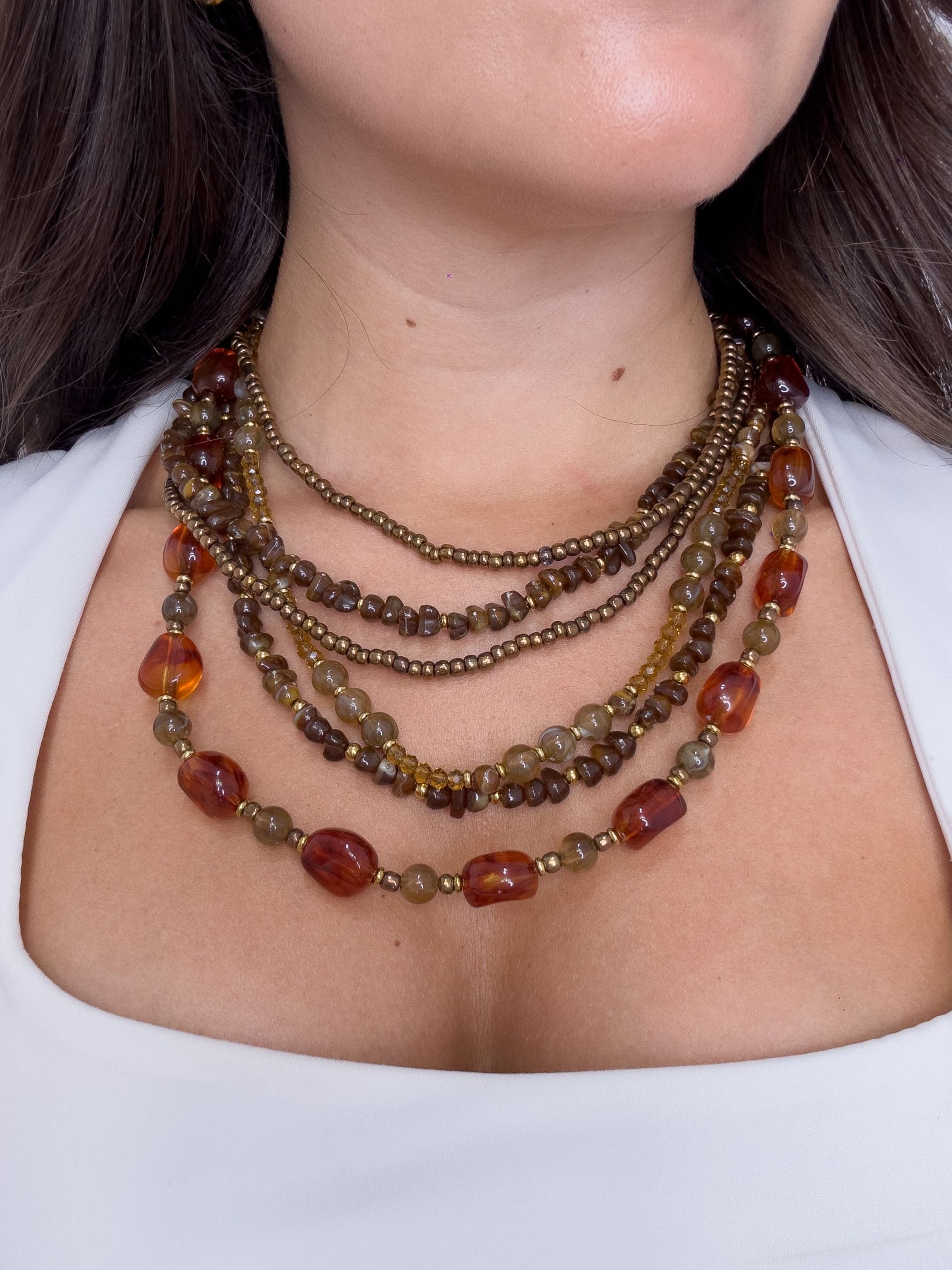 Cuando te lo pones, sientes cómo los tonos marrones de las bolas y piedras se mezclan con el dorado para dar un aire cálido y con personalidad. Tiene tres capas que se mueven con naturalidad y le dan vida a cualquier outfit.