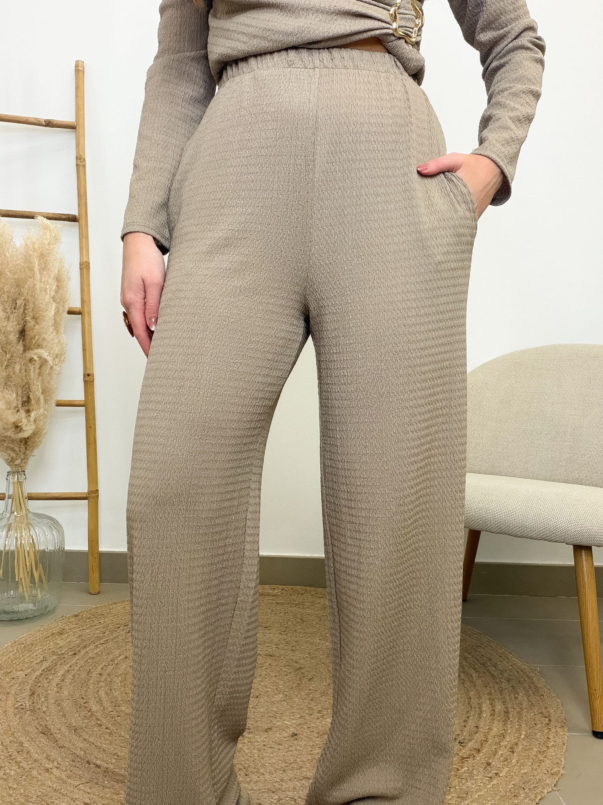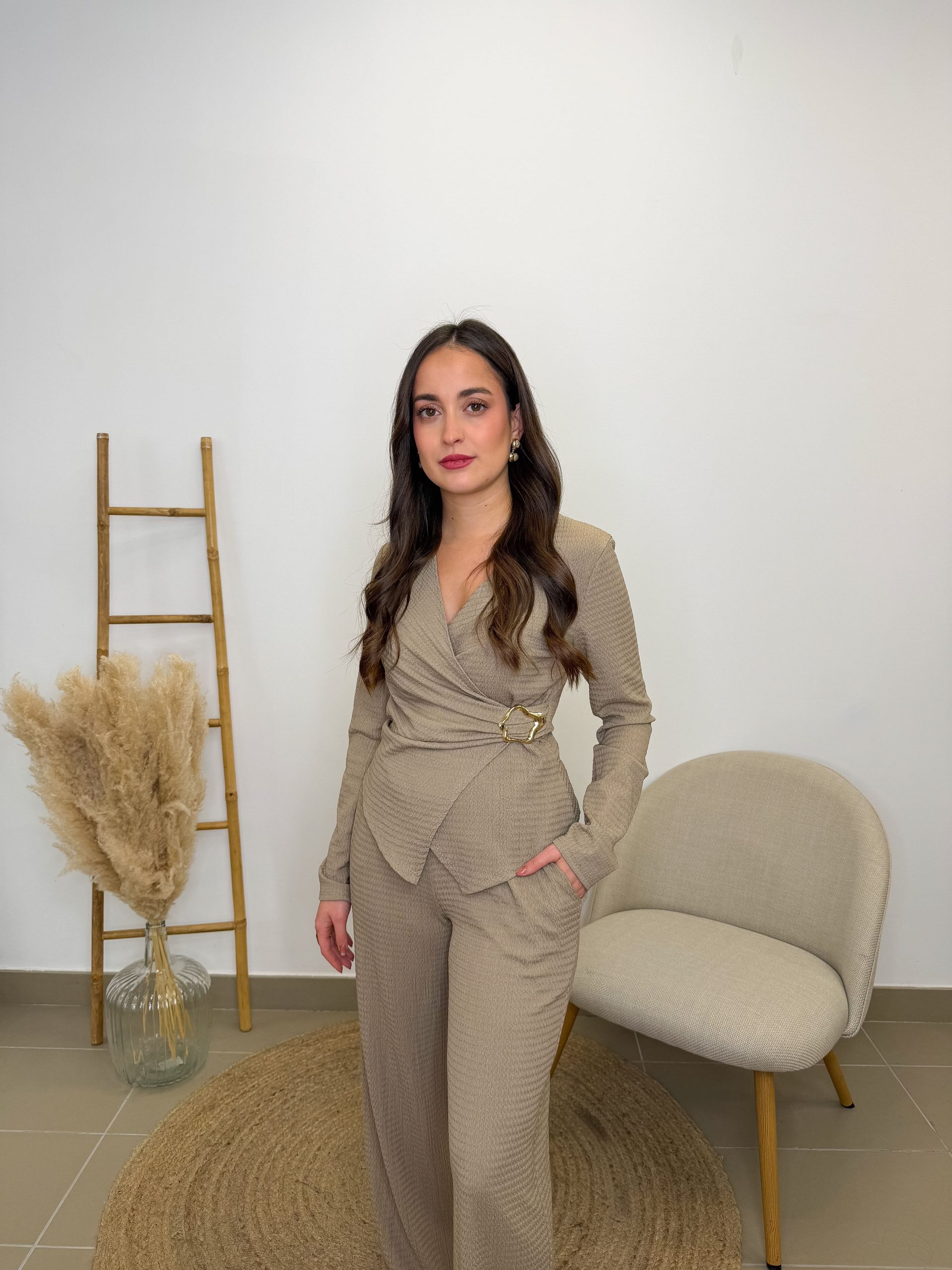 La camiseta cruzada es el detalle que marca la diferencia. El broche dorado aporta luz y un toque especial, de esos que elevan el conjunto sin esfuerzo. El pantalón es recto, sueltecito y comodísimo, con goma en la cinturilla para adaptarse a ti y acompañarte en todos tus planes.