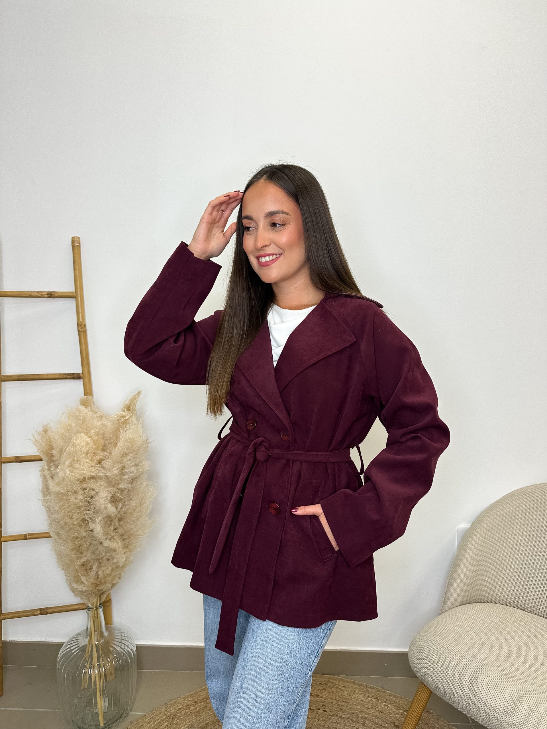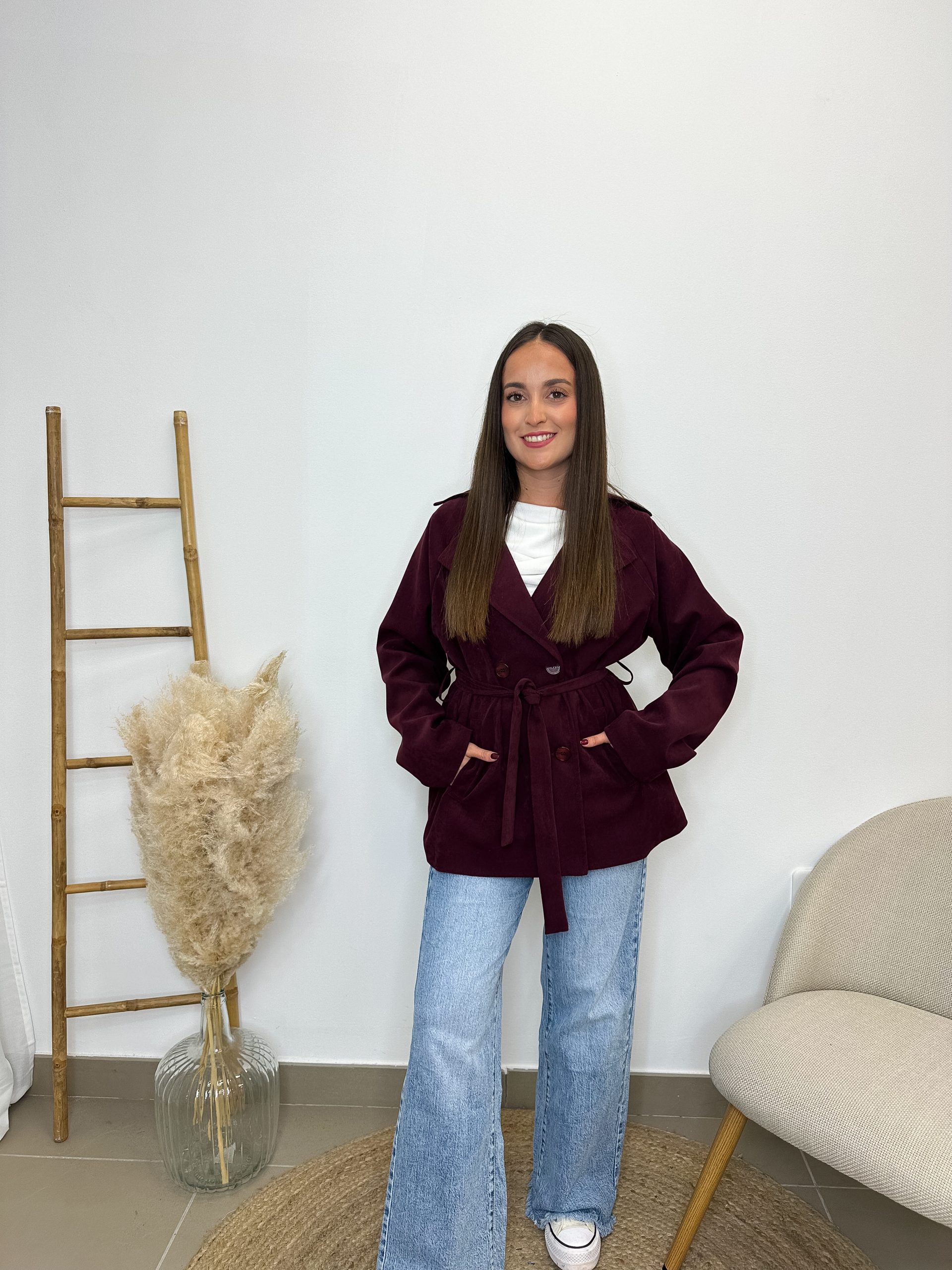 Tiene ese aire elegante y femenino que nunca pasa de moda. En color burdeos, con doble botonadura y lazada en la cintura para marcar silueta, esta gabardina es puro estilo. El cuello con solapa y el forro interior suave la hacen tan cómoda como sofisticada, y su tacto de ante le da un punto cálido y envolvente.