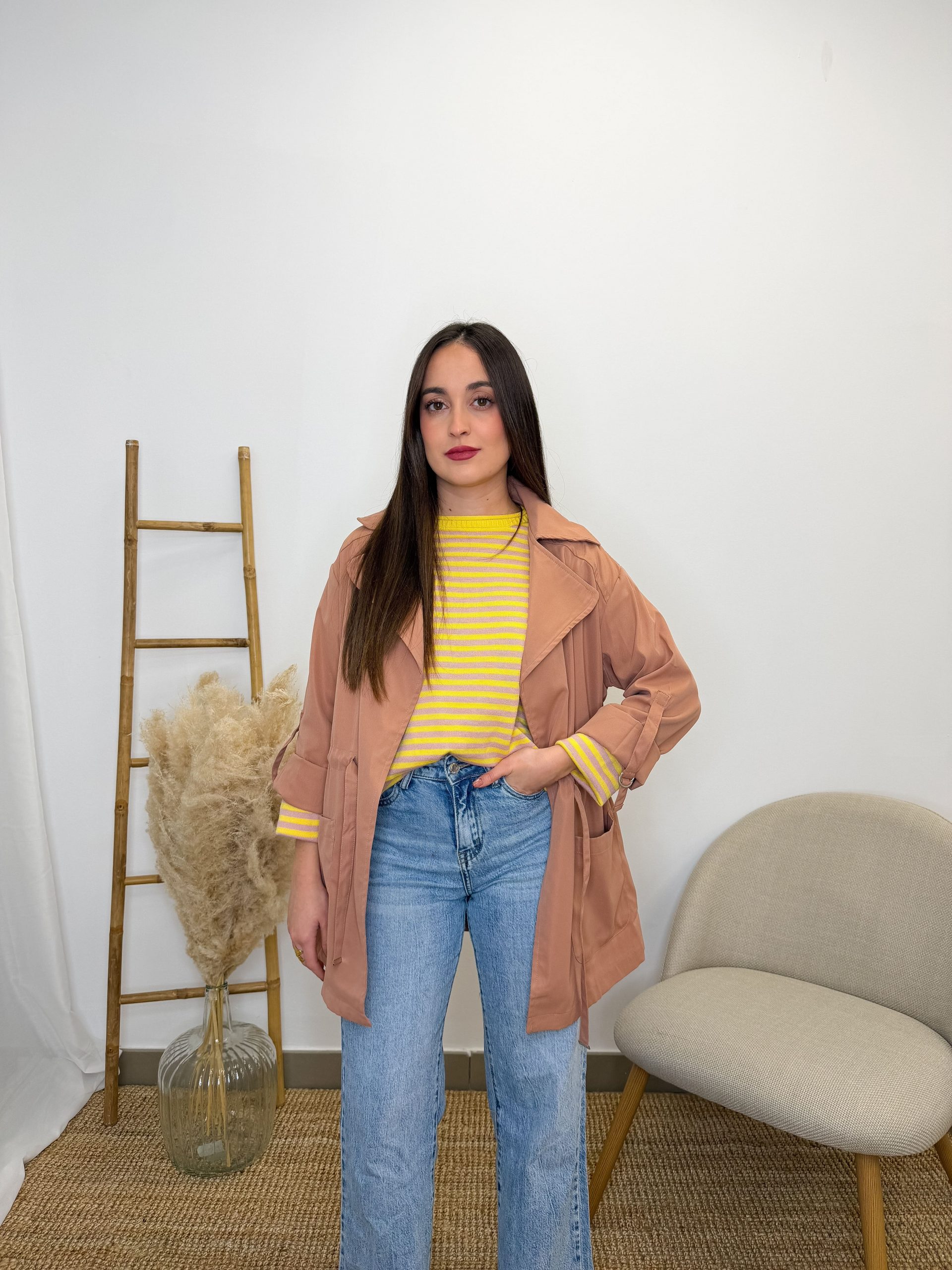 Tiene ese punto alegre y suave que apetece en cualquier momento. El color amarillo mantequilla es delicado y luminoso, y las rayitas en rosa pastel le dan un aire dulce y femenino que enamora.
