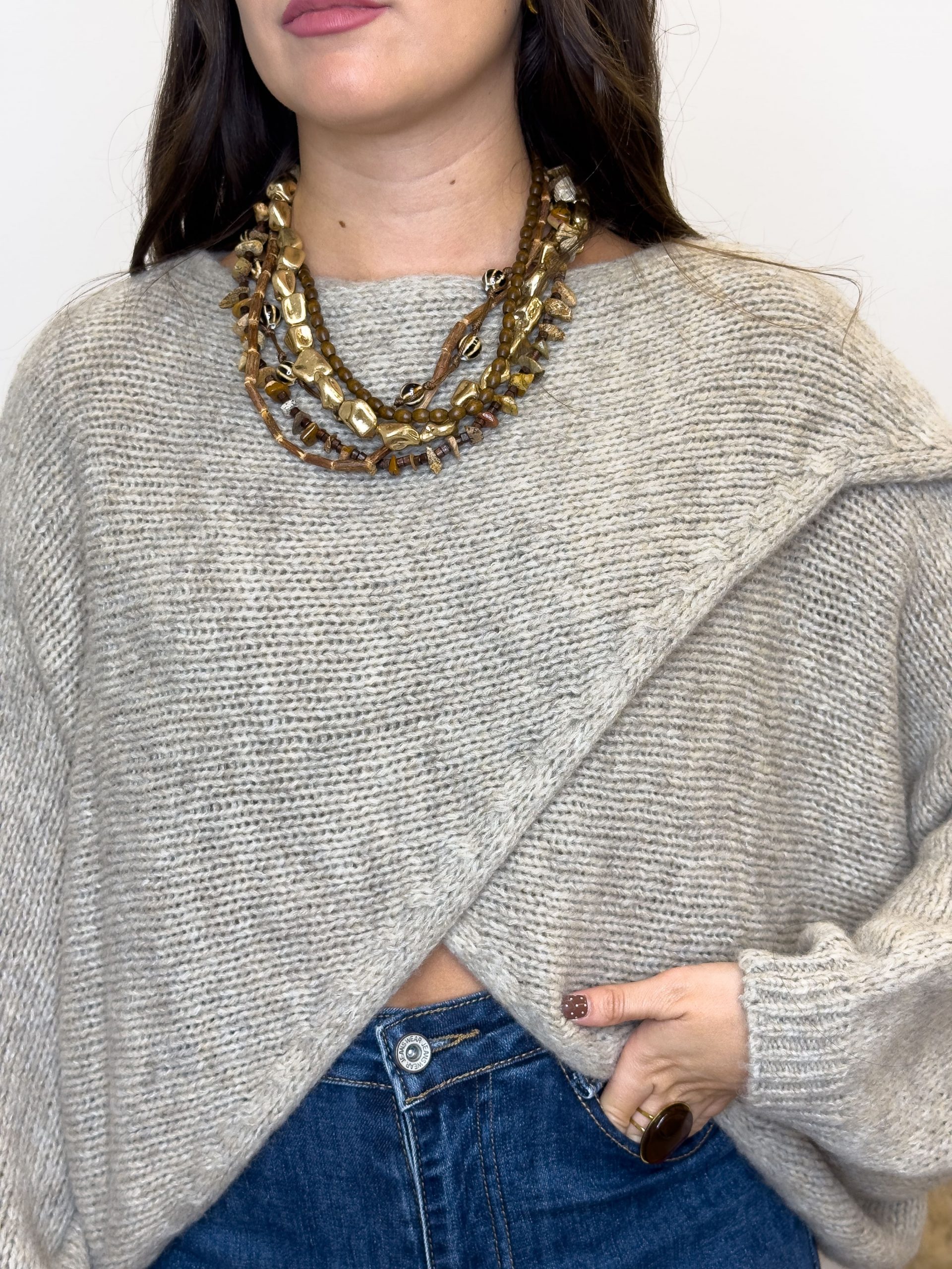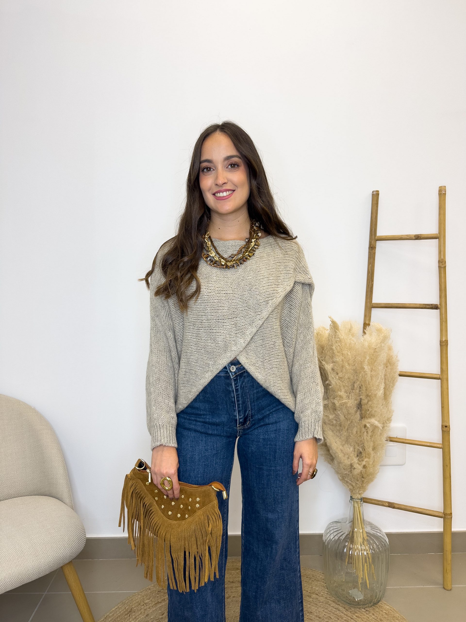 Este jersey asimétrico de lana en marrón clarito combina calidez y estilo. Las mangas de mariposa le dan volumen y movimiento, creando un efecto elegante y muy femenino.
