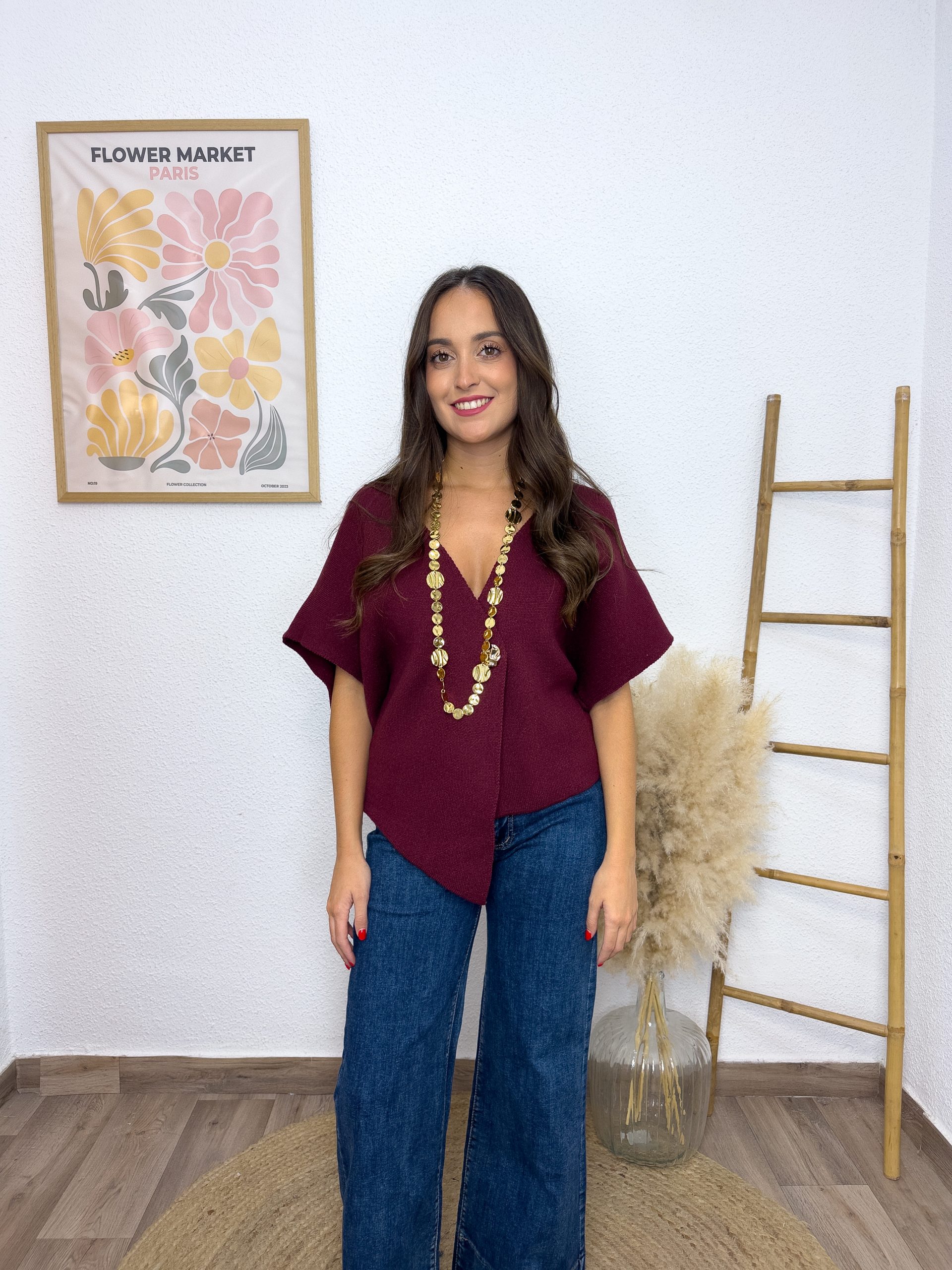 El burdeos intenso lo llena de elegancia y fuerza, mientras que el botón dorado XL se convierte en ese detalle especial que atrapa miradas. Su corte desigual con acabado en pico crea movimiento y un aire bohemio que lo hace único.