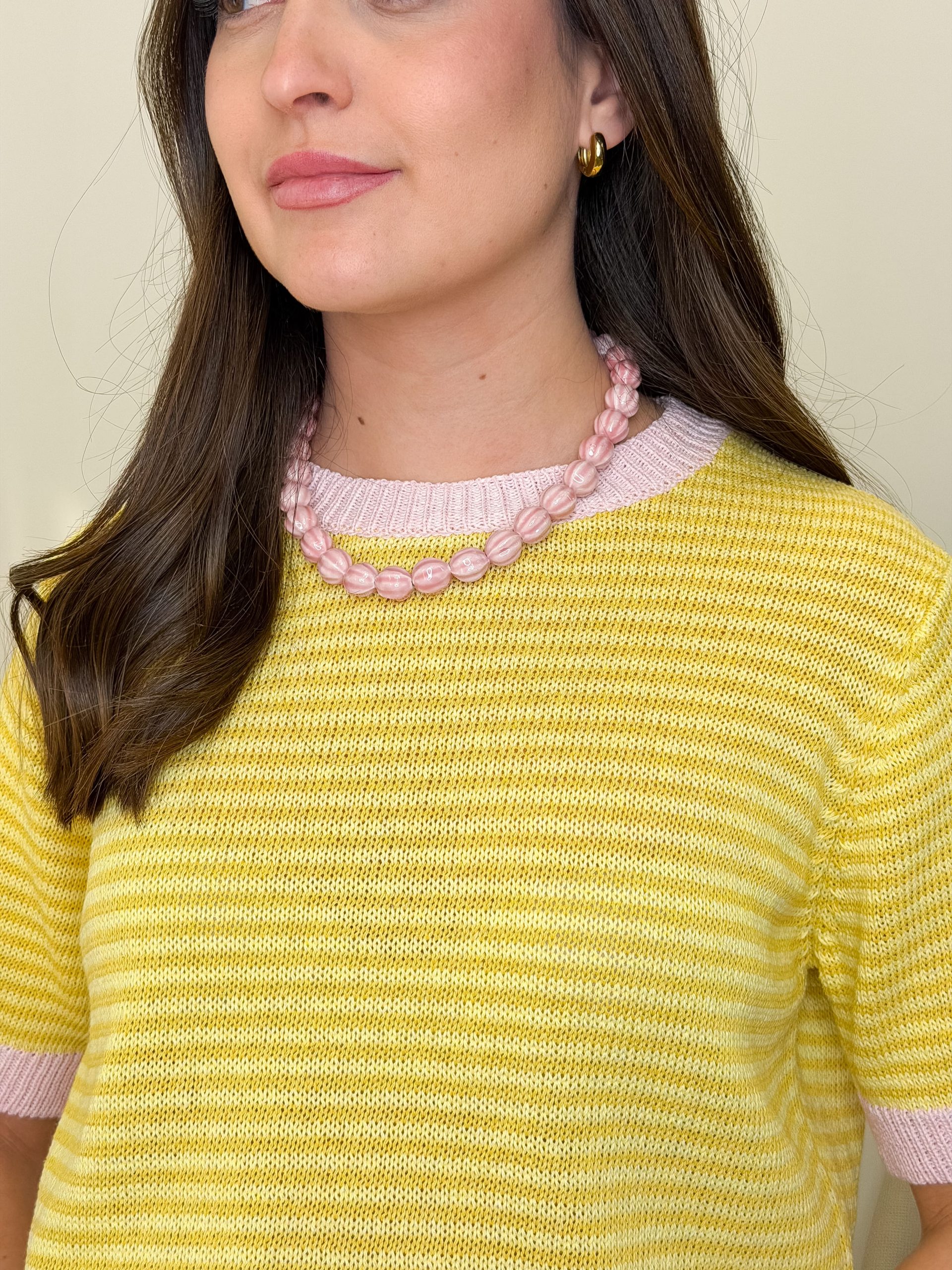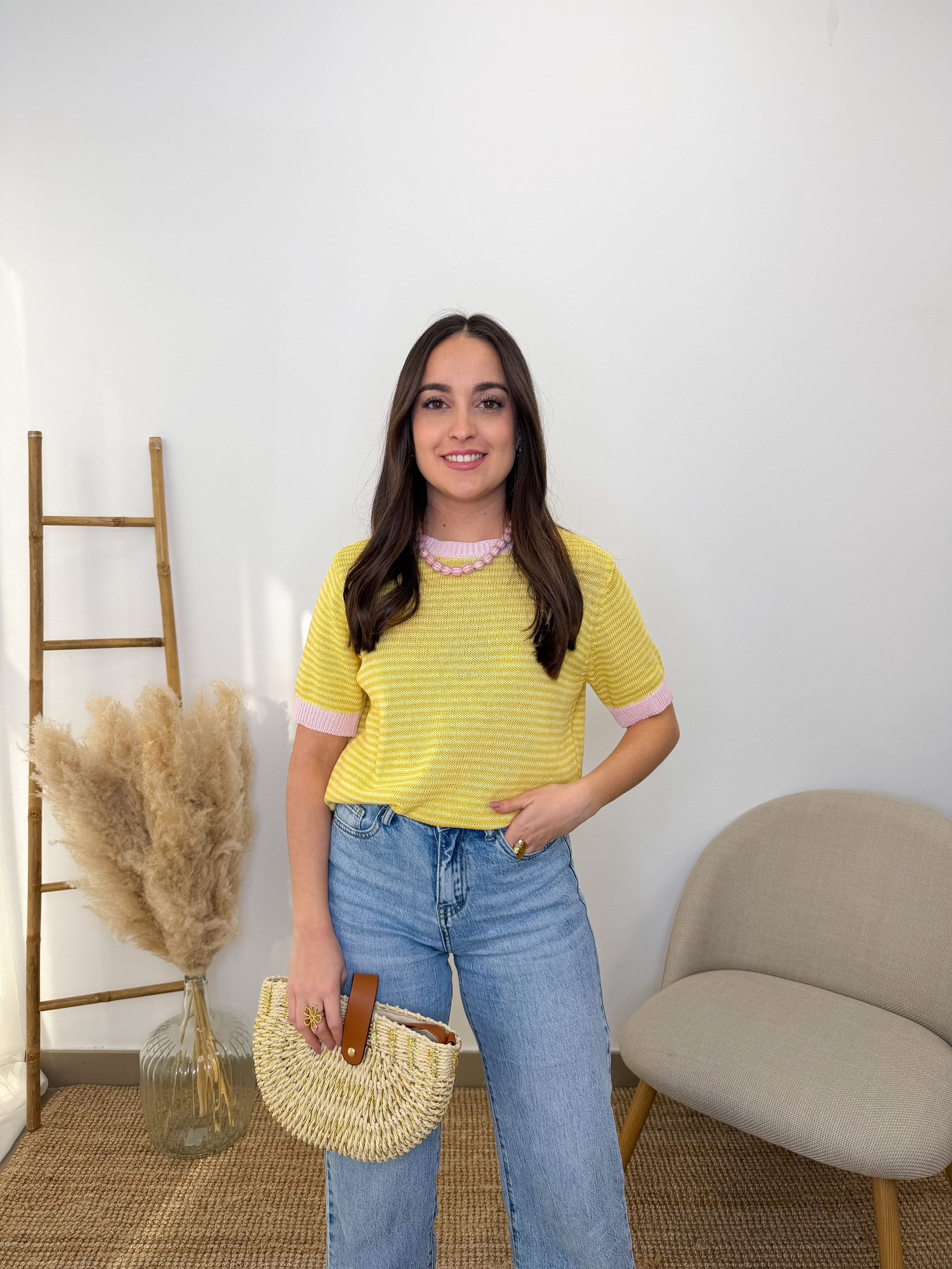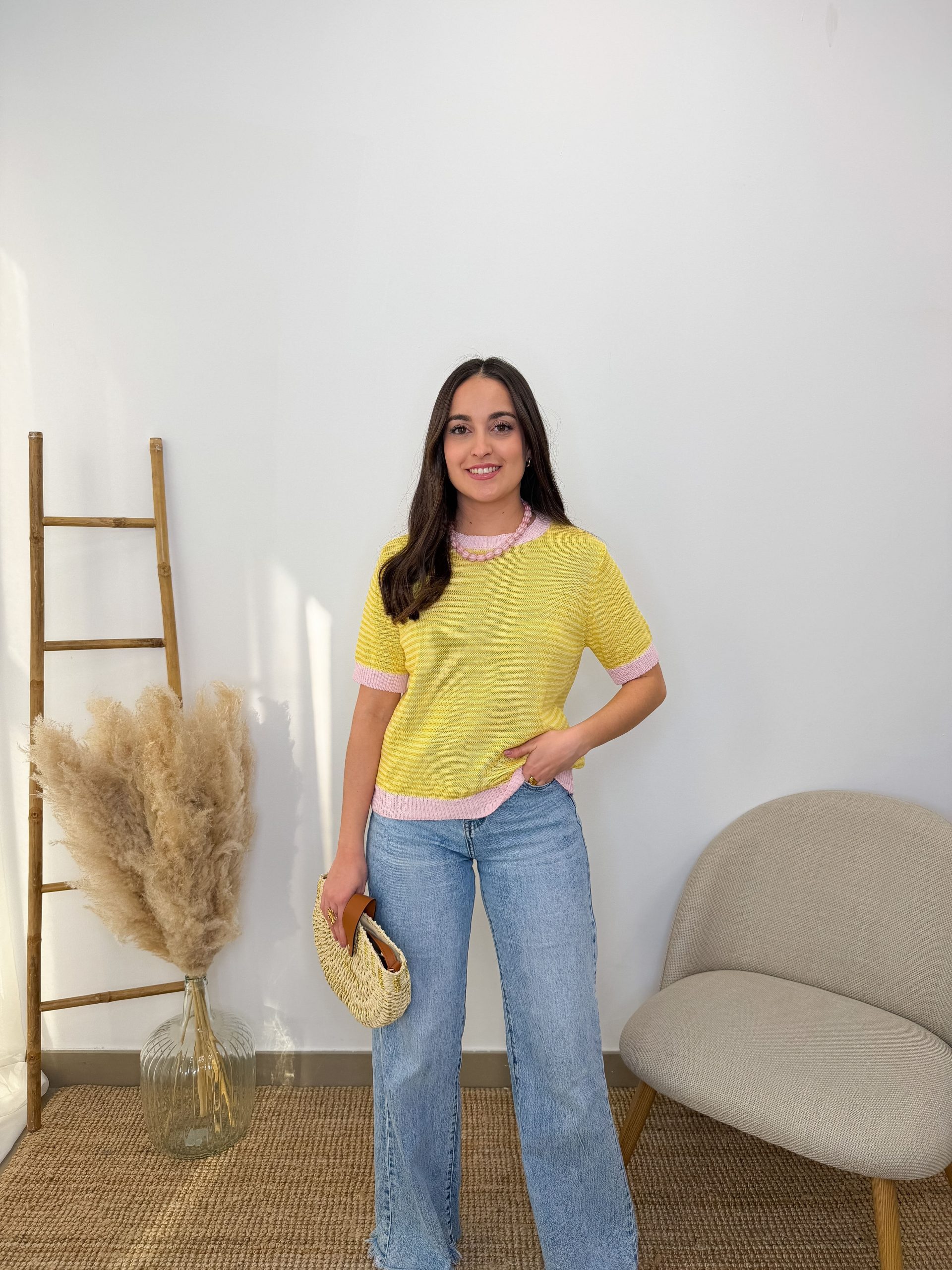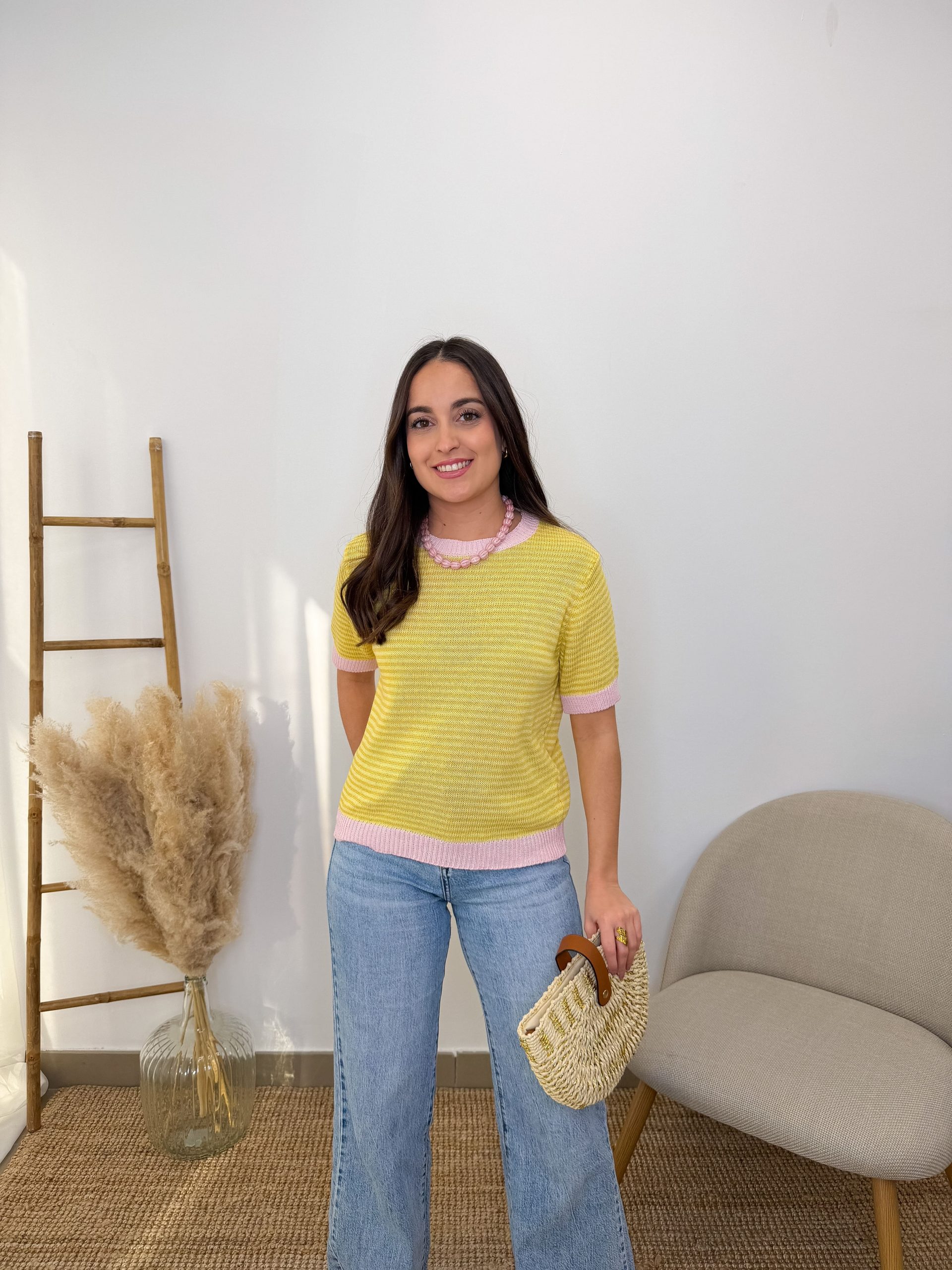Este jersey de punto y manga corta combina lo clásico con un detalle muy bonito que la hace diferente. Lleva rayas en tonos amarillos y blancos, un contraste suave y fácil de combinar que siempre funciona.