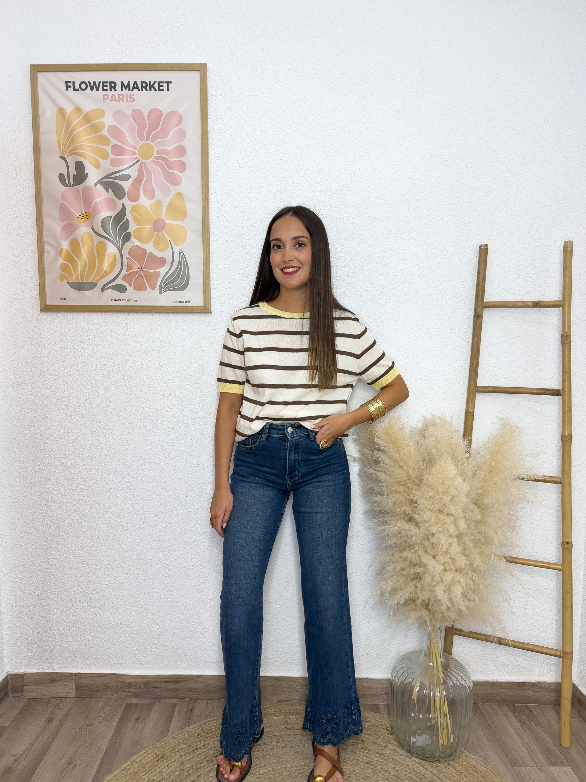 Fresco y versátil, este jersey de manga corta combina estilo y comodidad en un diseño de rayas en marrón chocolate y beige, con detalles en color amarillo que le aportan un toque vibrante y actual.