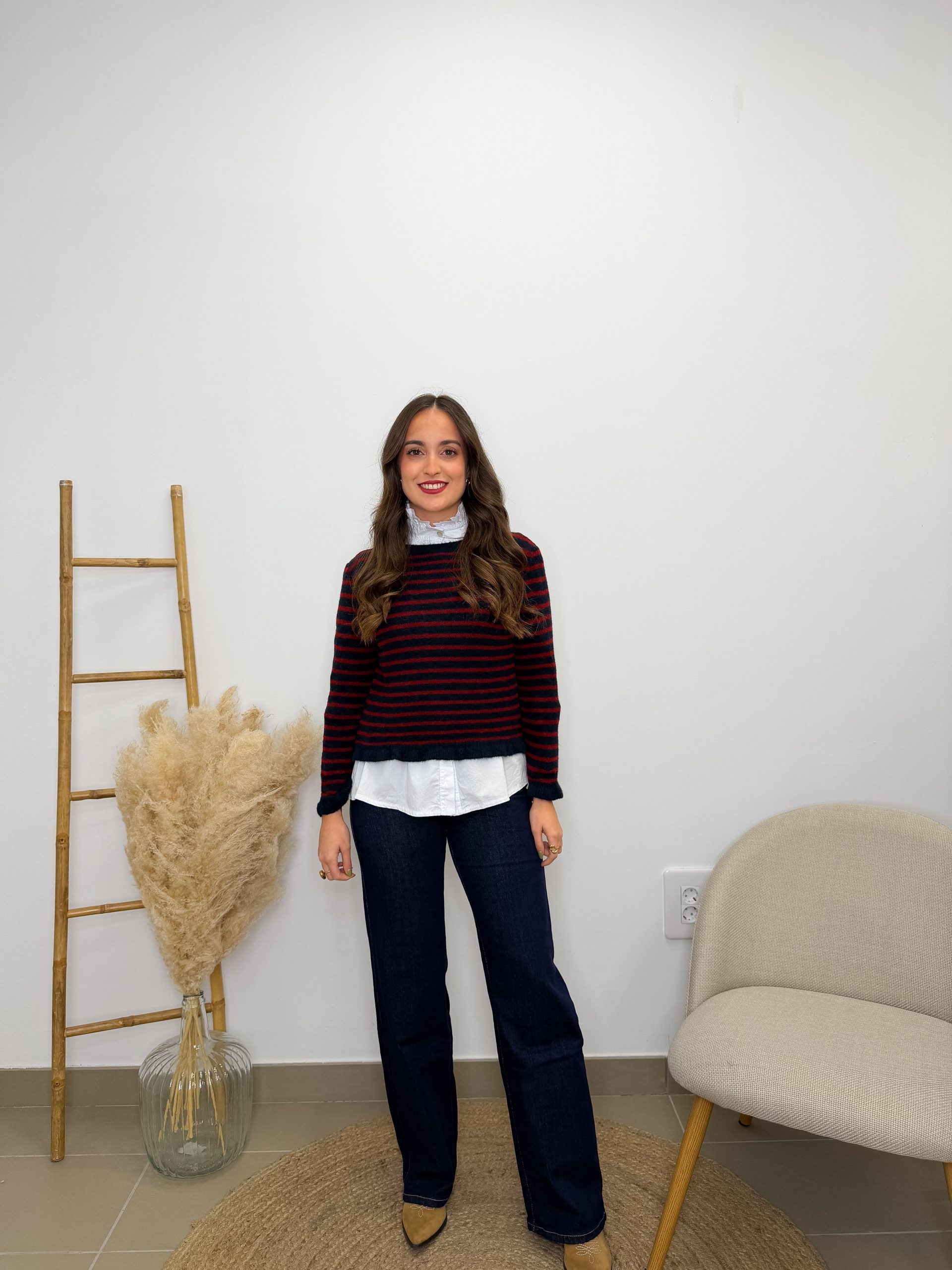 El azul marino tiene una magia especial… es profundo, favorece un montón y combina con absolutamente todo. Y cuando aparecen esas rayas rojas, vibrantes pero suaves, el jersey cobra vida. Ese contraste tiene rollo, energía, un puntito atrevido sin dejar de ser delicado.