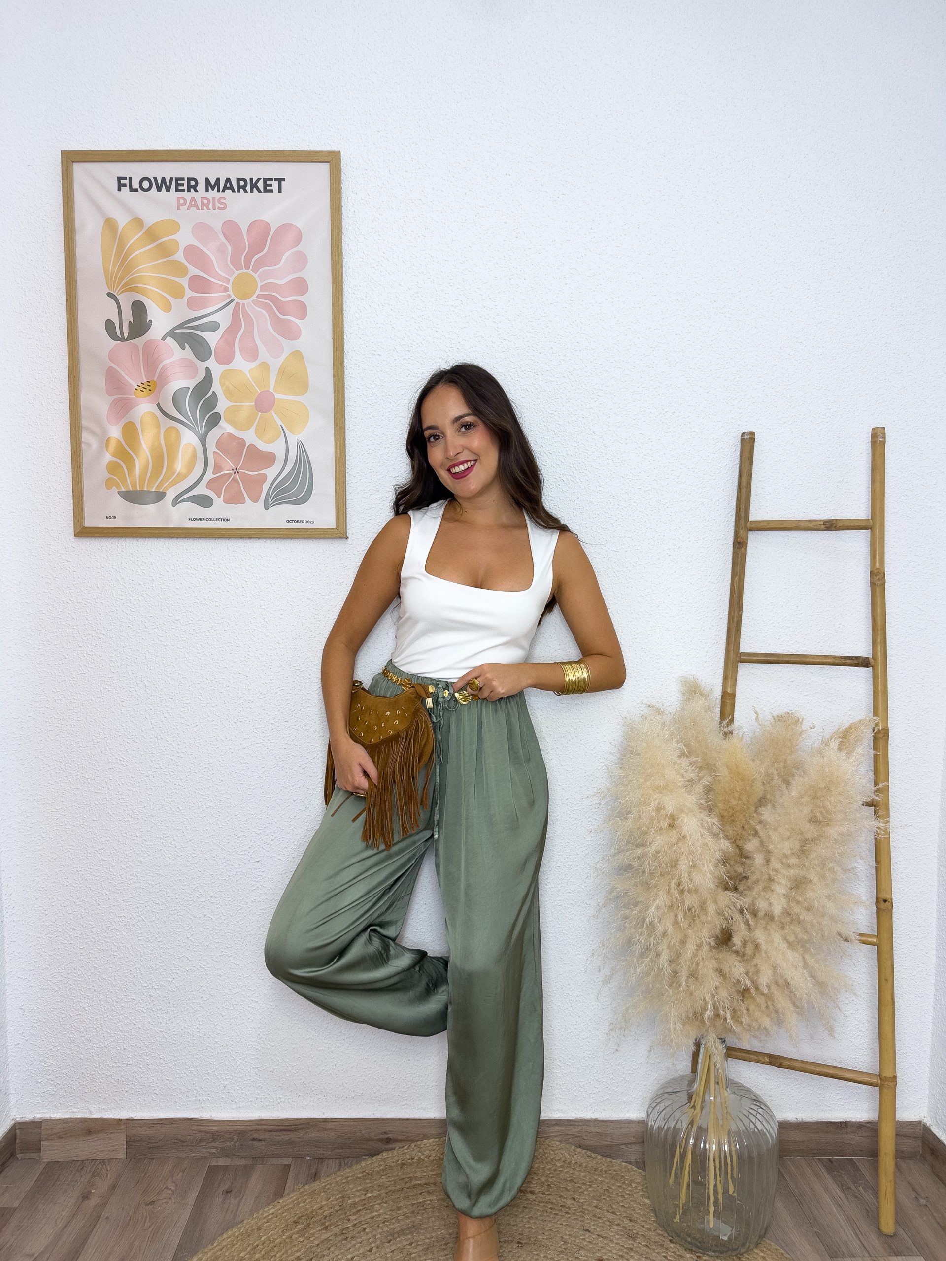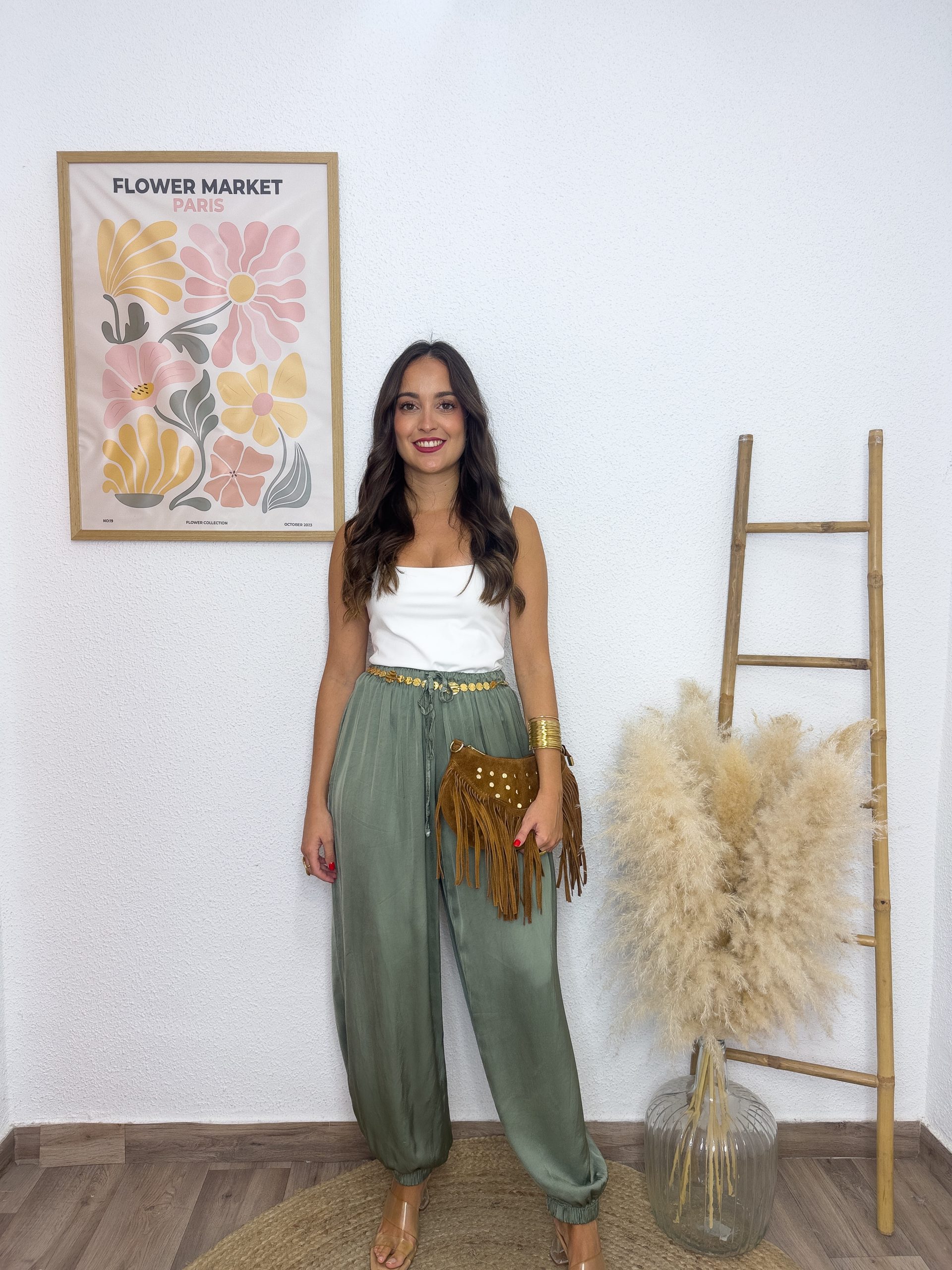 Cuando te lo pones, notas lo suave y ligero que es el satén, con ese brillo sutil que hace que cada movimiento se vea elegante. La cintura de goma se ajusta sin apretar y los tobillos engomados le dan un aire moderno y desenfadado, lo típico que llevas y de repente tu outfit gana estilo sin esfuerzo.