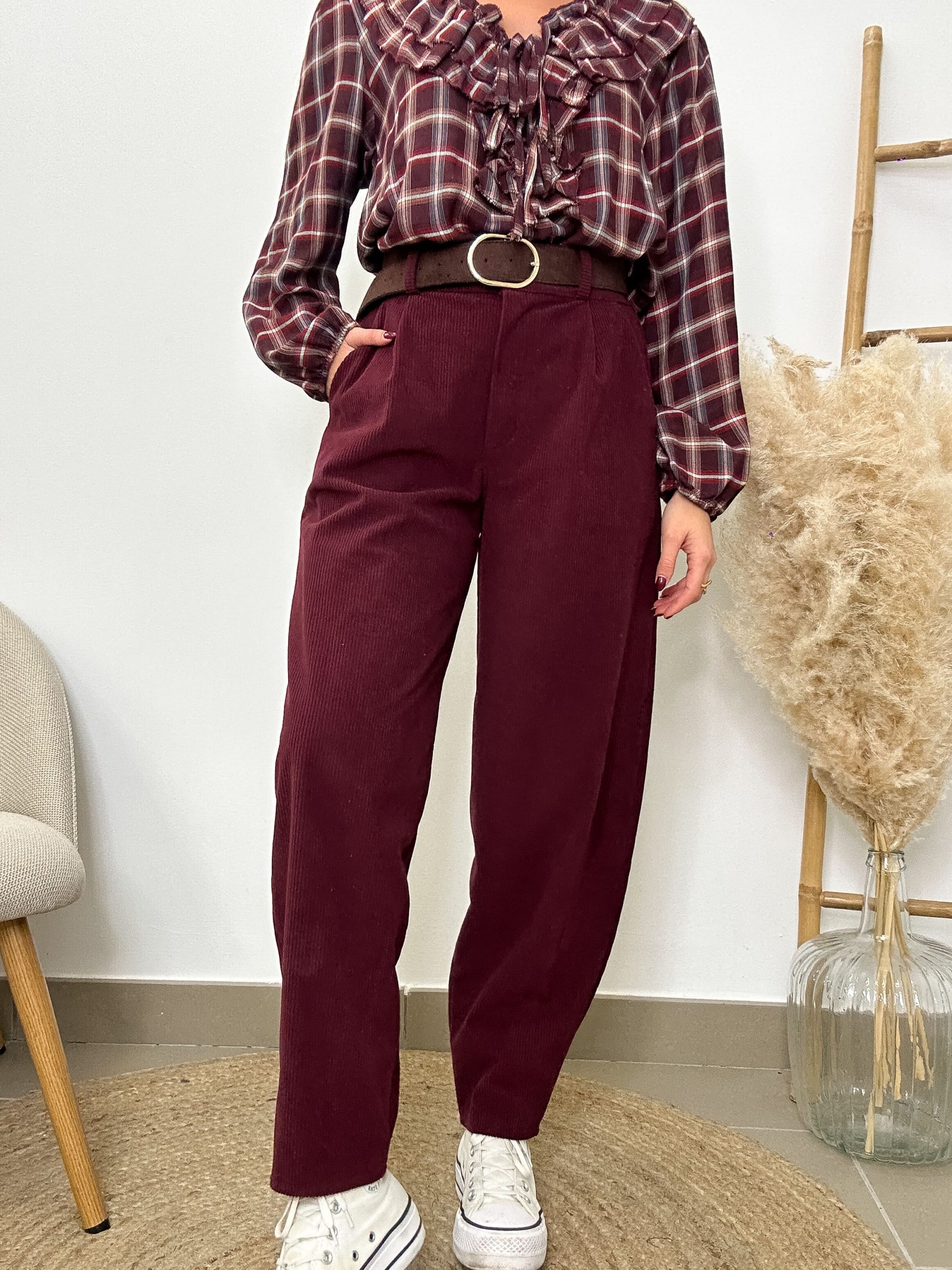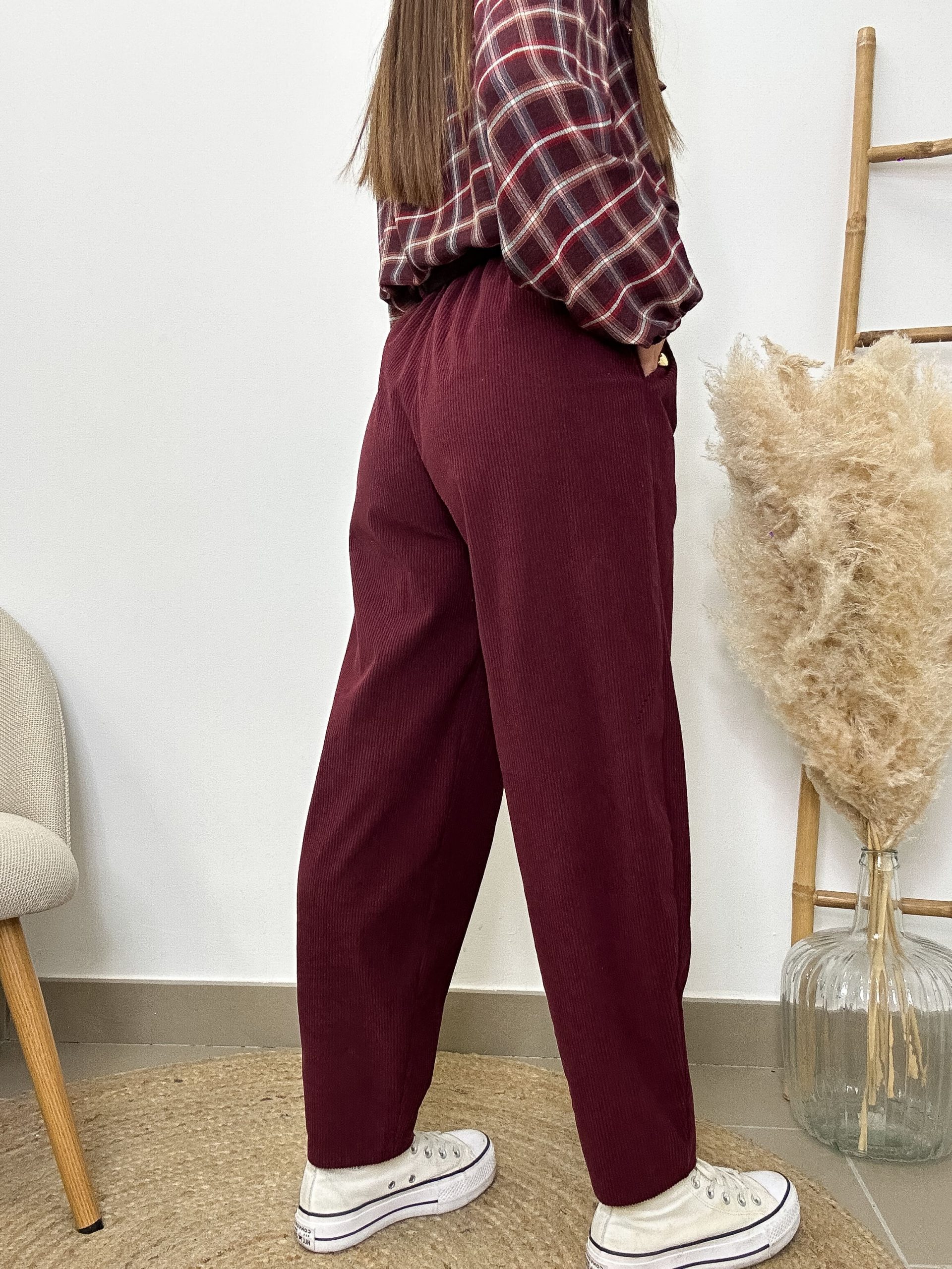 Este pantalón de pana burdeos es de esos que te suben el ánimo con solo mirarlos. Se adapta a la cintura con ese estilo mum que recoge sin apretar y cae recto, cómodo, muy favorecedor… como si estuviera hecho para ti.