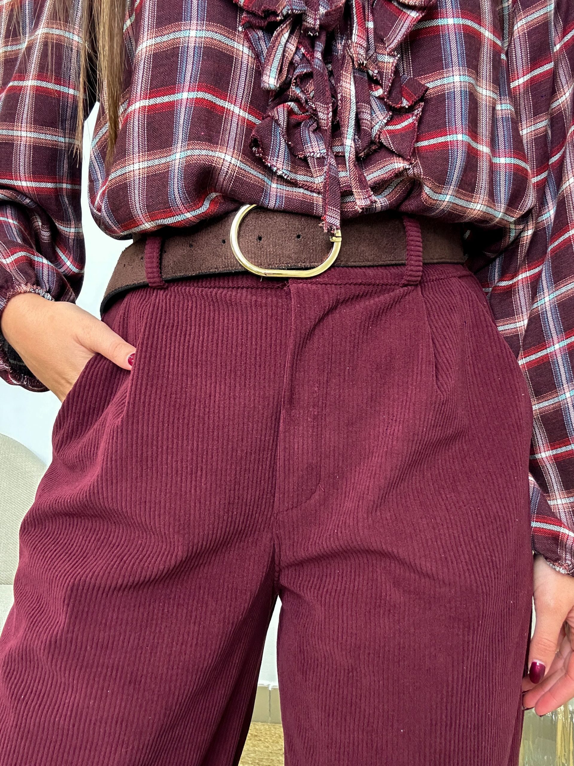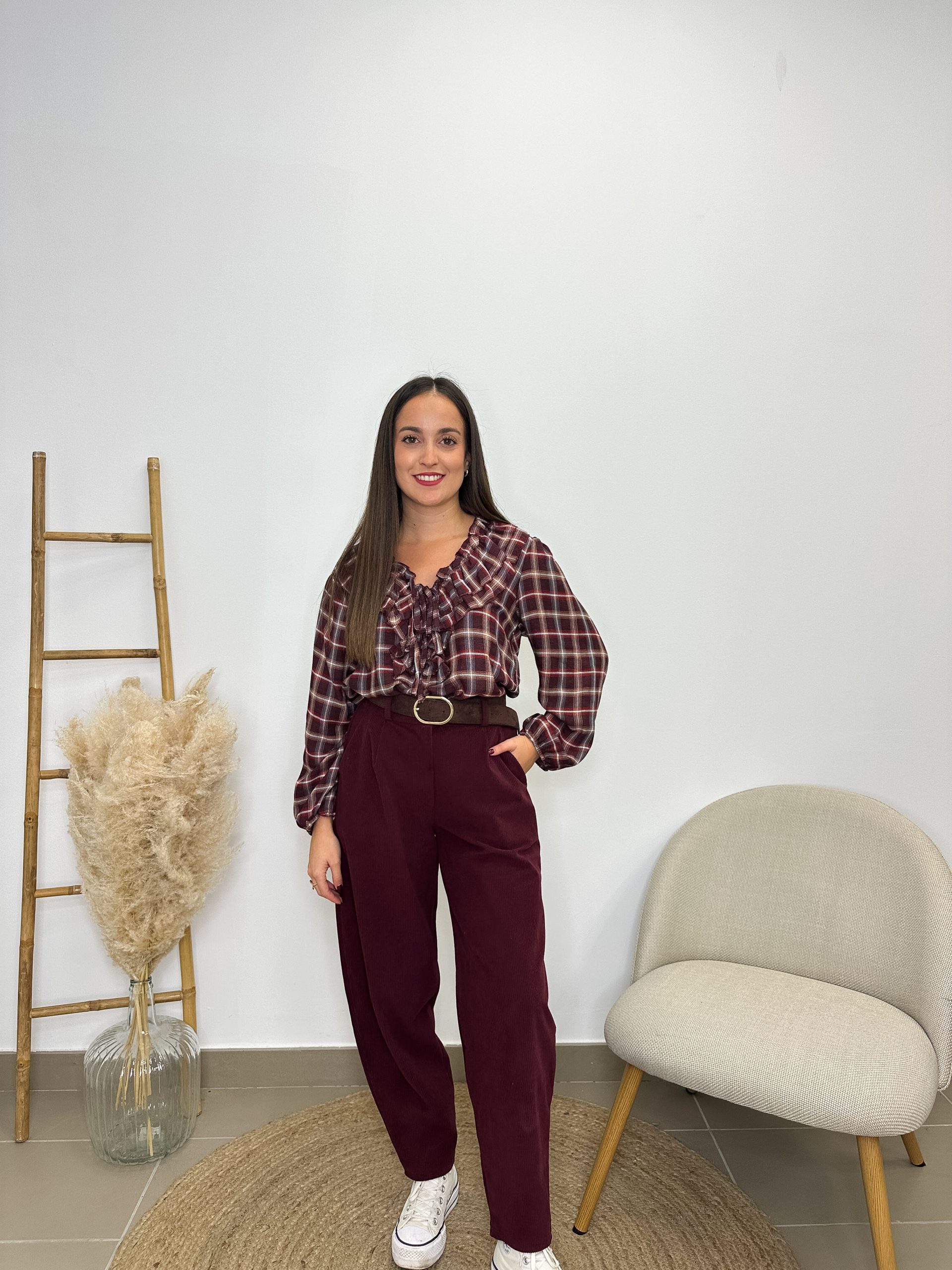 La pana tiene esa textura calentita que invita a tocarla, y el tono burdeos es puro carácter: elegante, diferente, muy “La Mar de Ángela”. Viene con un cinturón marrón que le da el contraste perfecto y define la cintura sin esfuerzo.