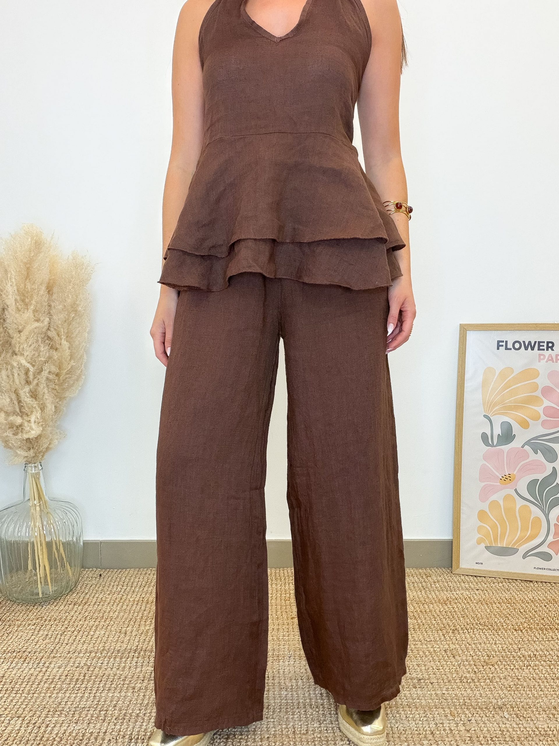 Este pantalón de lino en color marrón es pura calma y versatilidad. Al ser de corte recto, estiliza las piernas de una forma increíble, dándote ese aire elegante pero relajado que tanto nos gusta. ¿Lo mejor de todo? La cintura de goma. Es ese detalle que te permite moverte libremente, sin presiones, para que te sientas cómoda desde el café de la mañana hasta el paseo del atardecer.