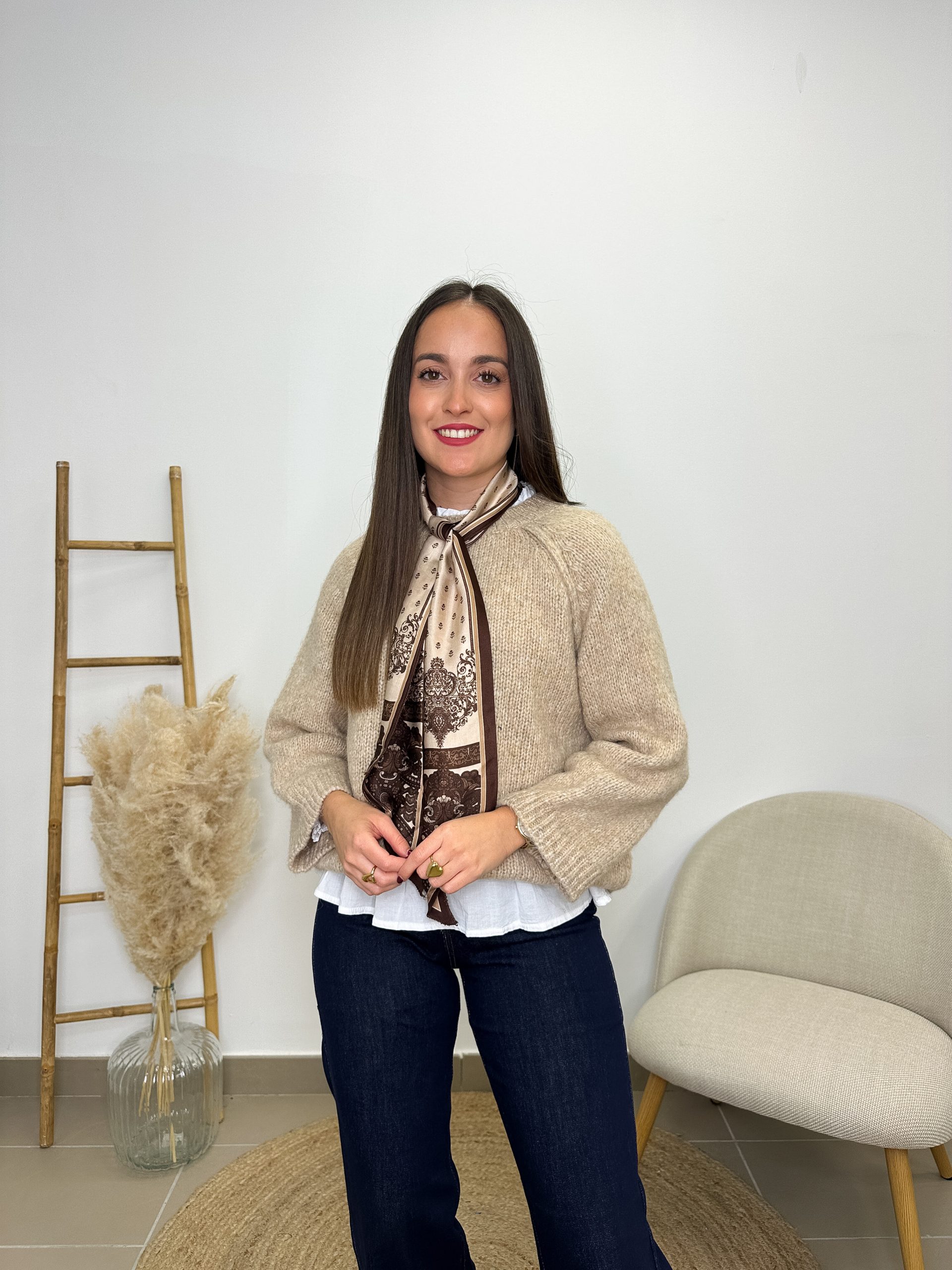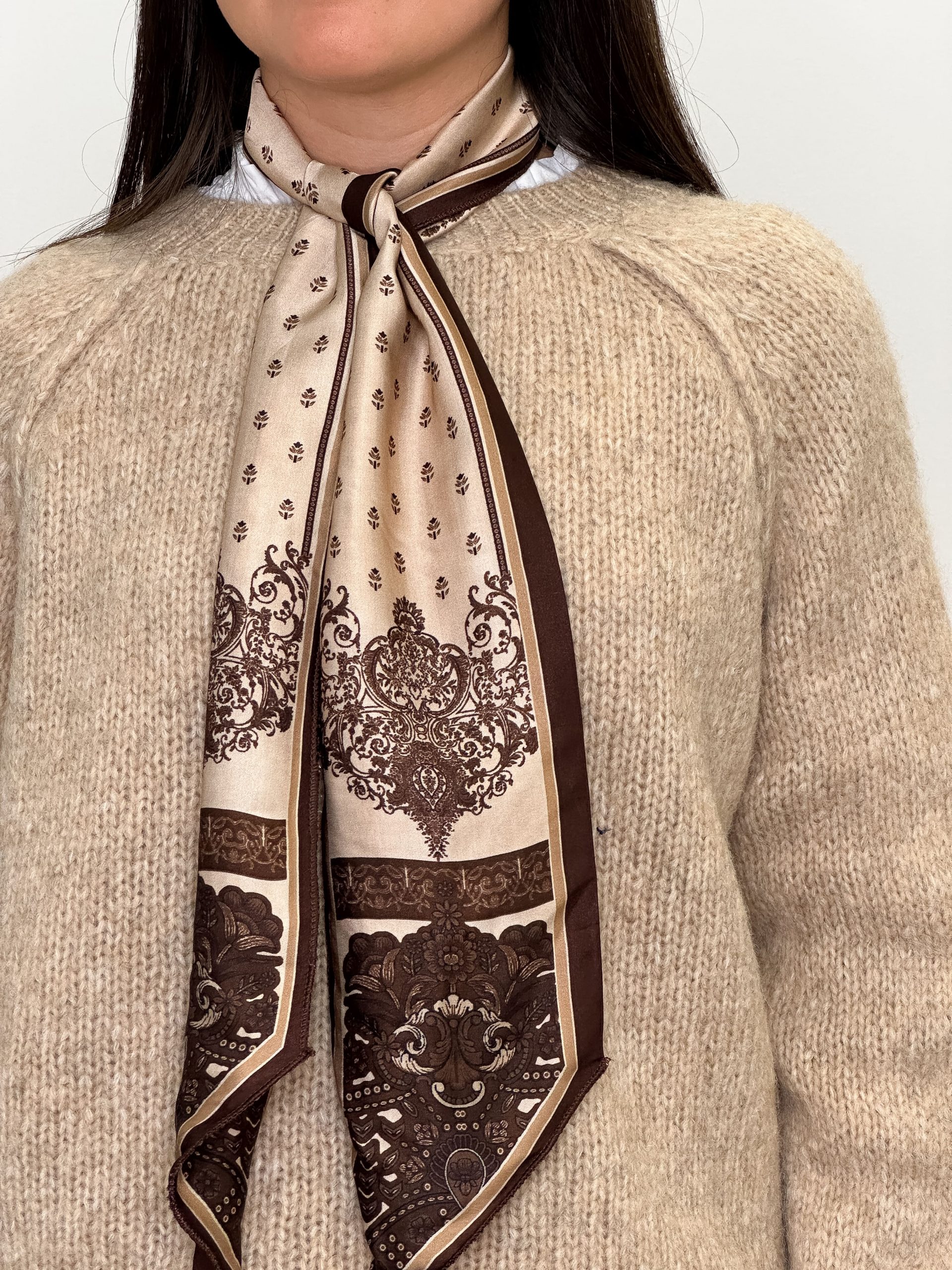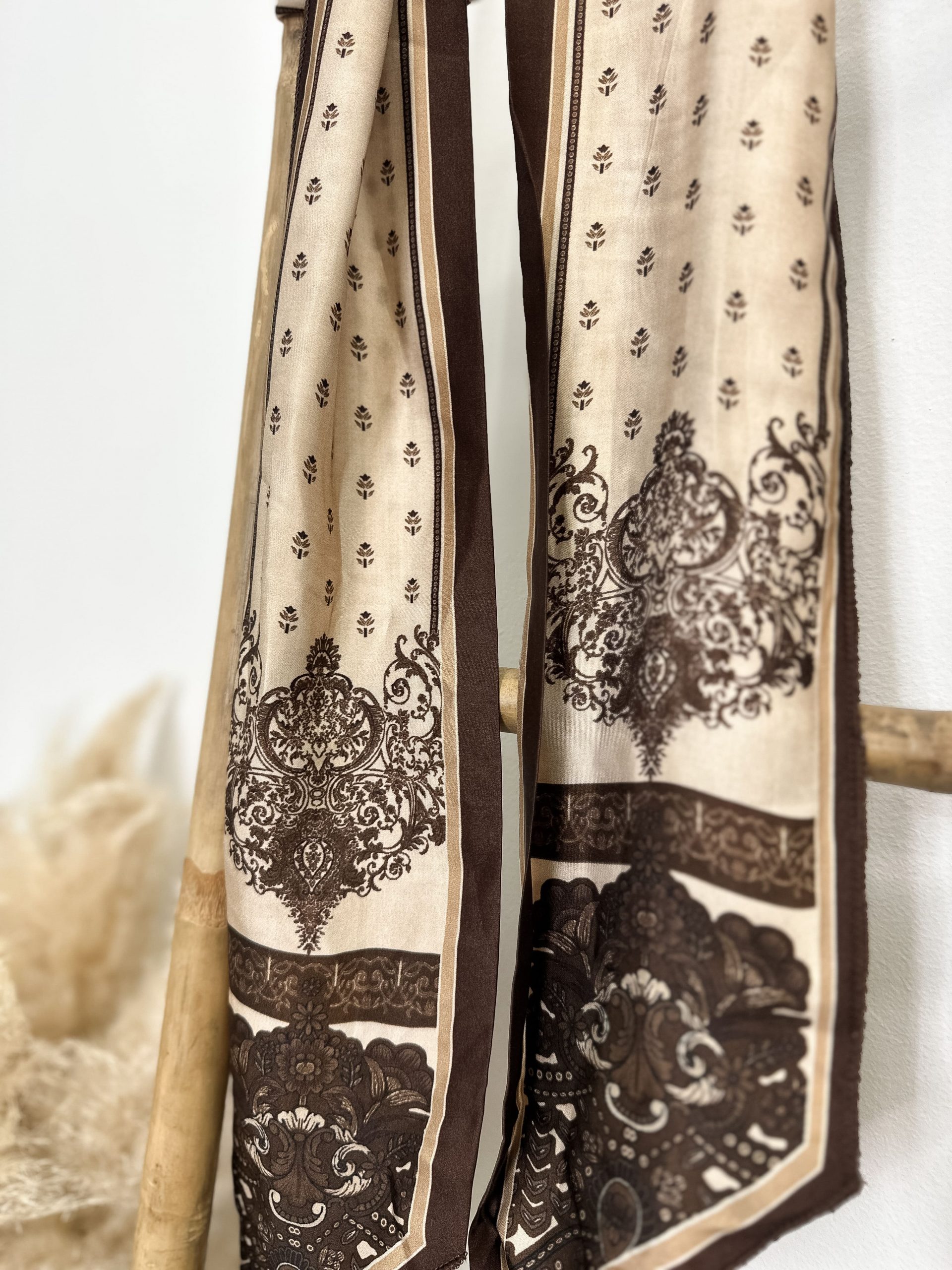 Su mezcla de marrón oscuro y marrón claro tiene ese aire elegante y discreto que combina con todo, y el estampado suave le da un toque muy especial sin robar protagonismo. Además, sus picos asimétricos hacen que caiga de una forma preciosa, como si se hubiera colocado solo.