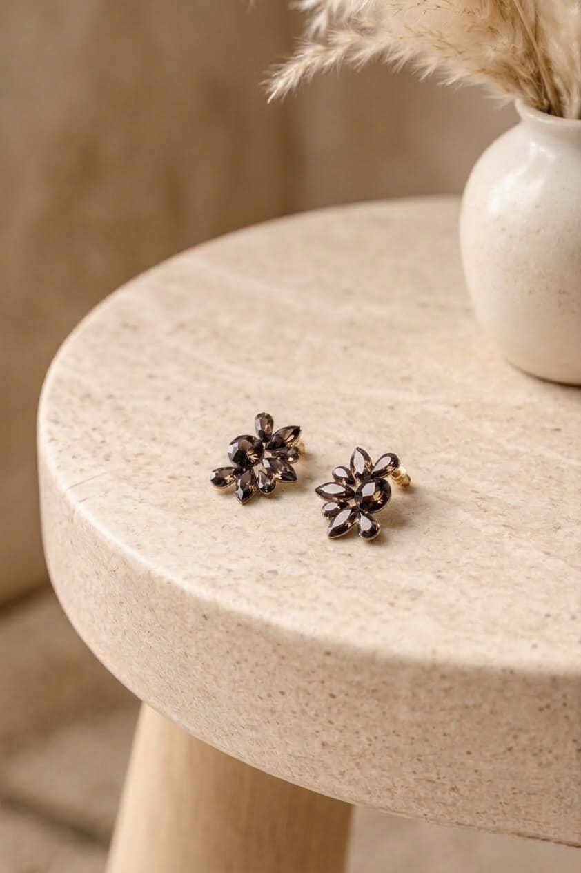 En tono marrón con un toque de brillo, tienen una calidez muy favorecedora que combina fácilmente con prendas neutras, tierras o incluso looks más sofisticados. La parte trasera dorada añade un contraste delicado que realza aún más el diseño.