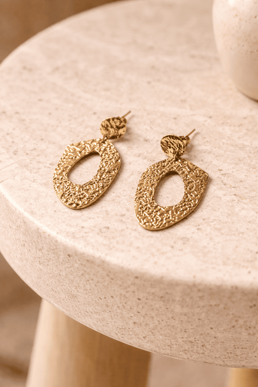 Estos pendientes dorados son especiales desde el primer vistazo. Tienen un círculo exterior ligeramente deformado que les da un aire moderno y atrevido, y un círculo central con textura que aporta profundidad y movimiento cada vez que giras la cabeza. El brillo dorado capta la luz de manera sutil, creando un efecto elegante pero natural.