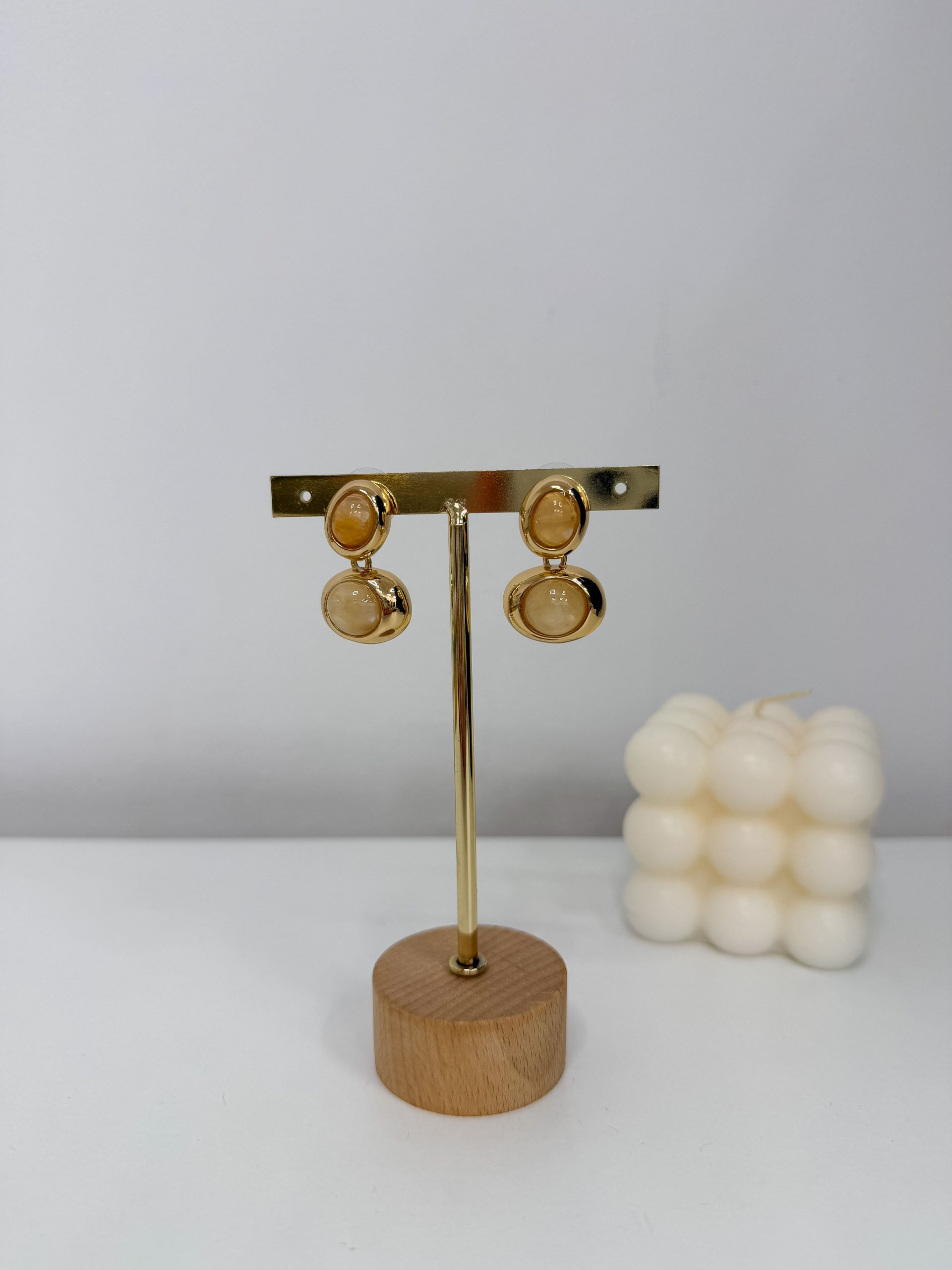 La forma ovalada con piedras en tono nácar aporta un brillo suave y muy favorecedor, de esos que combinan con todo. El borde metálico con acabado dorado enmarca la piedra y suma ese toque sofisticado que hace que el pendiente tenga presencia sin resultar excesivo. Al ser de acero inoxidable, están pensados para acompañarte en el día a día sin perder su encanto.