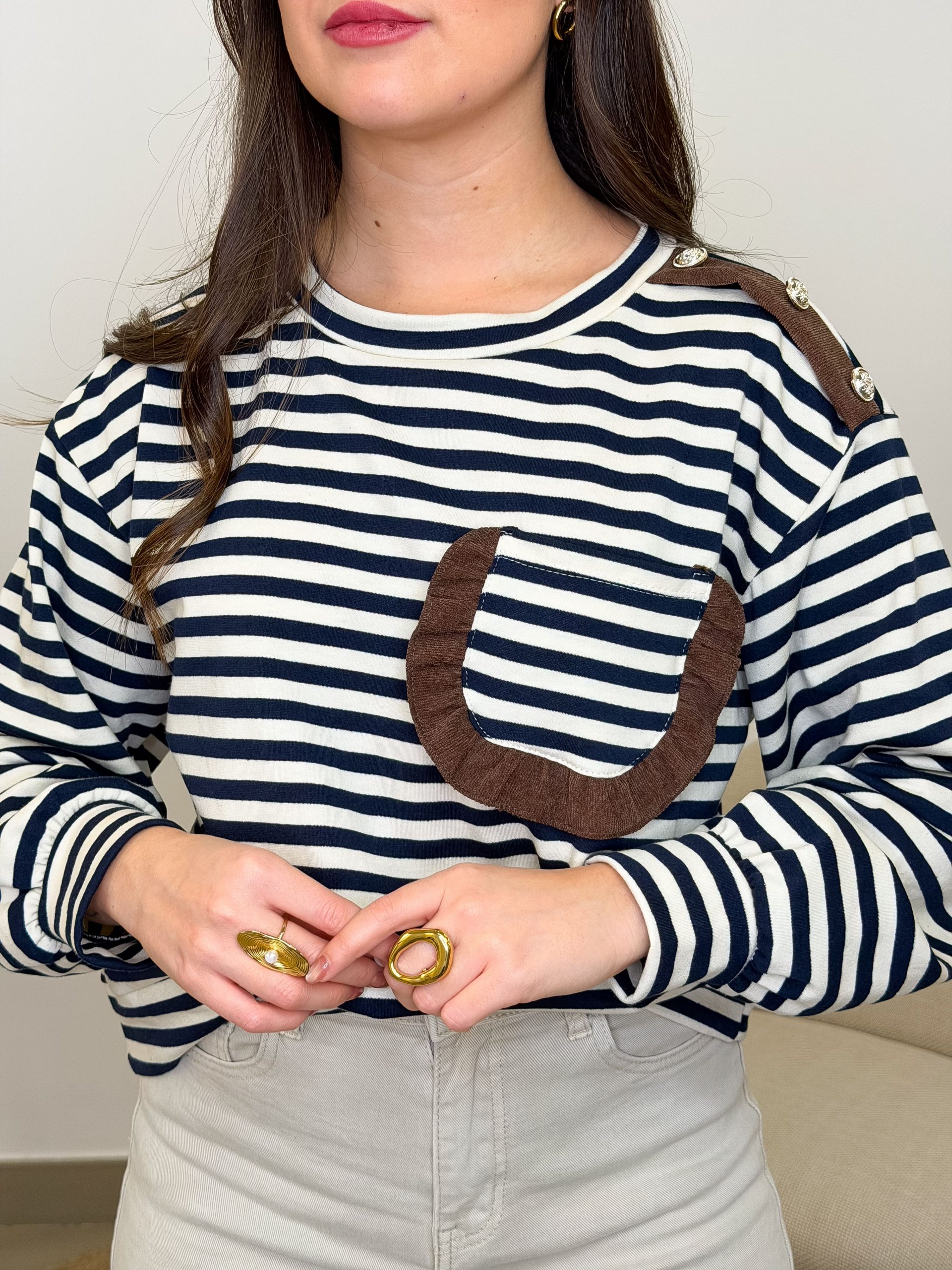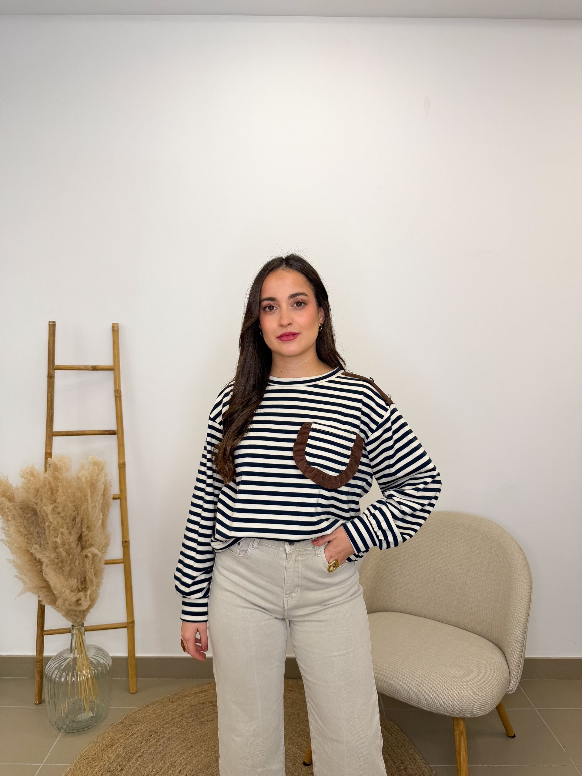 Tiene ese aire relajado que tanto nos gusta, pero con detalles que la hacen única. El blanco roto con rayas en azul marino es luminoso, atemporal y muy fácil de combinar, de los que siempre funcionan.