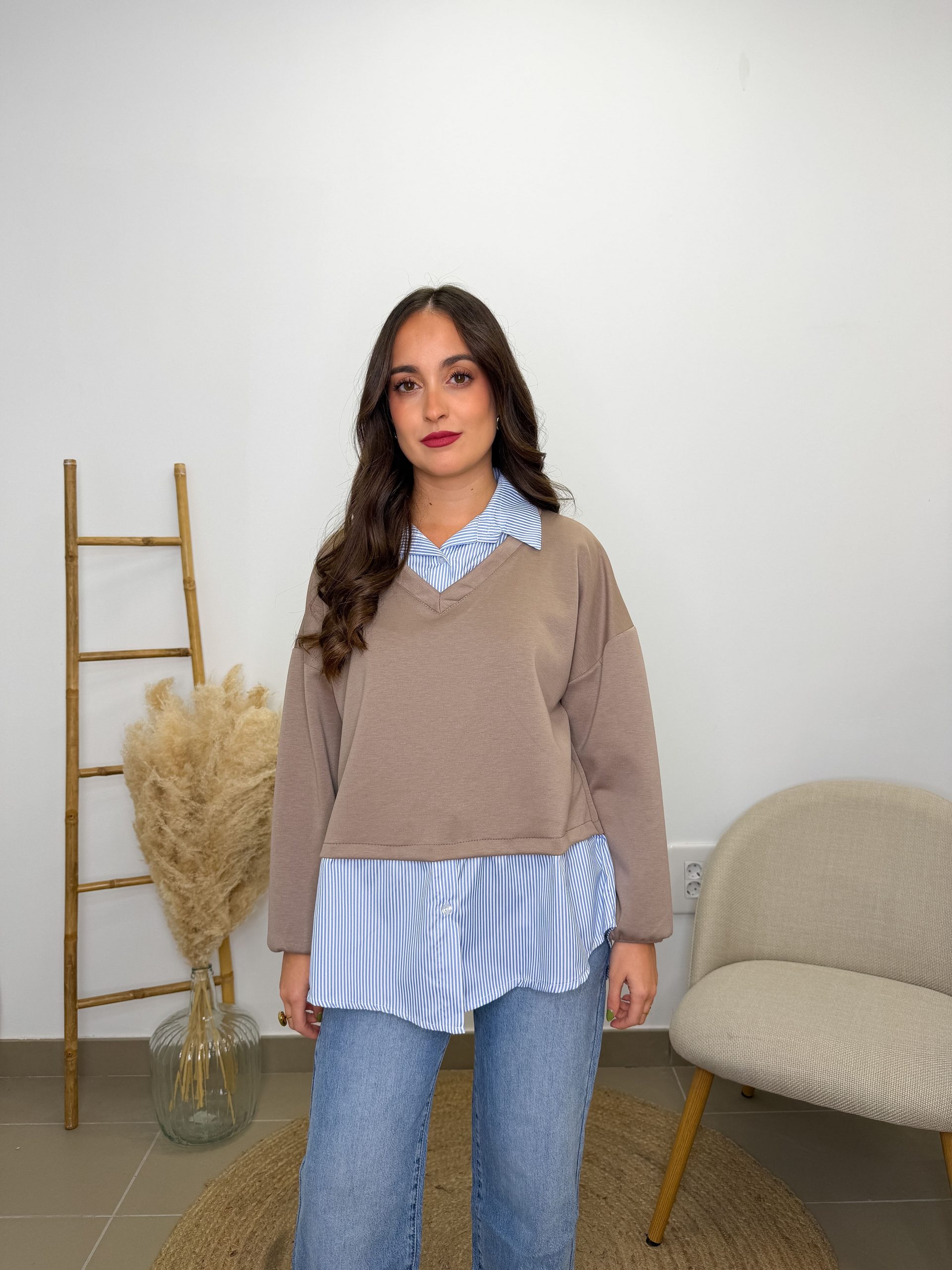 Tiene ese tono taupe suave que sienta bien siempre, pero lo que más engancha es ese bajo tipo camisa y el cuello cosido en blanco con rayitas azules. Le da un aire muy casual, muy de “voy cómoda, pero con estilo sin querer”.