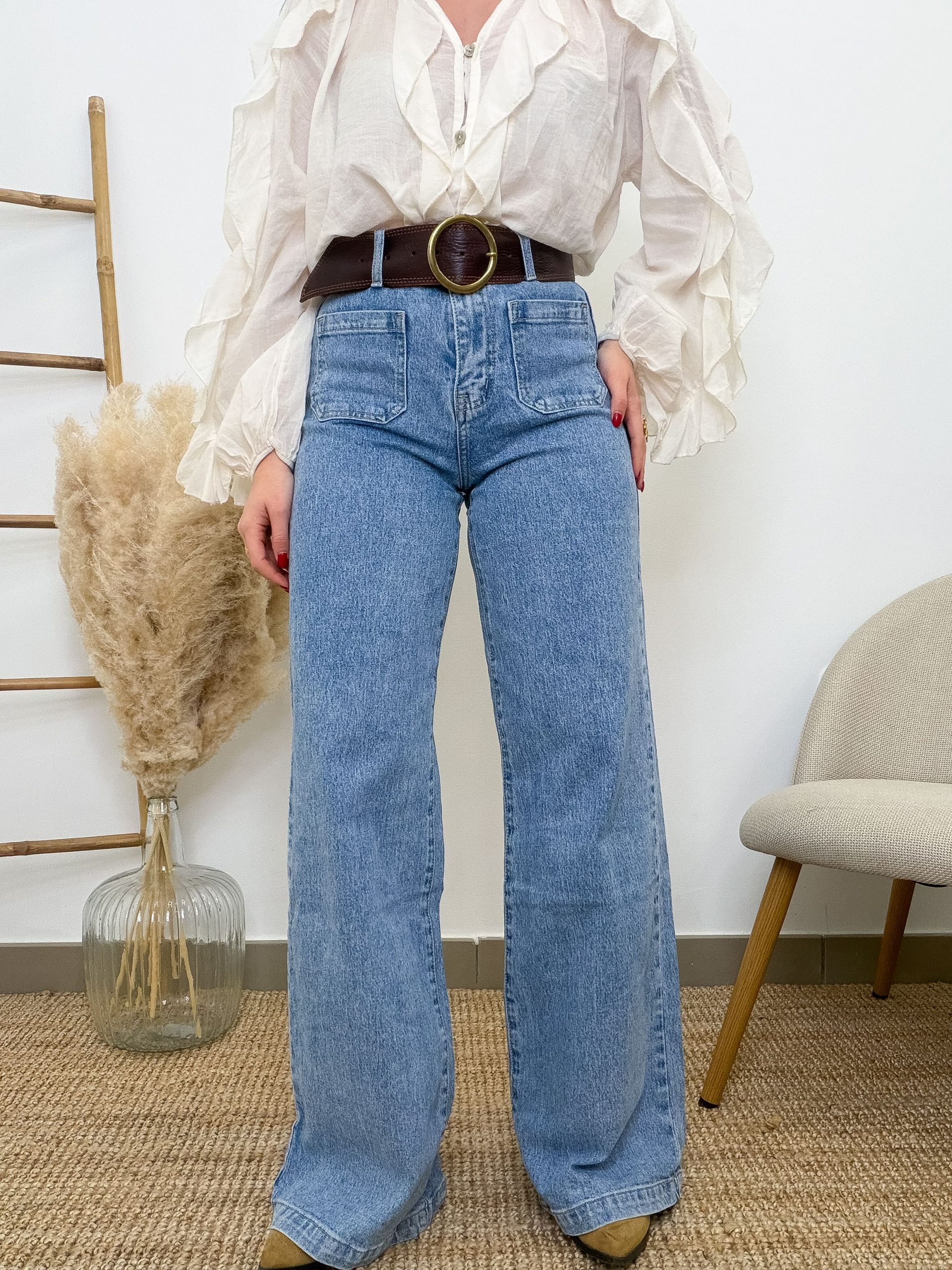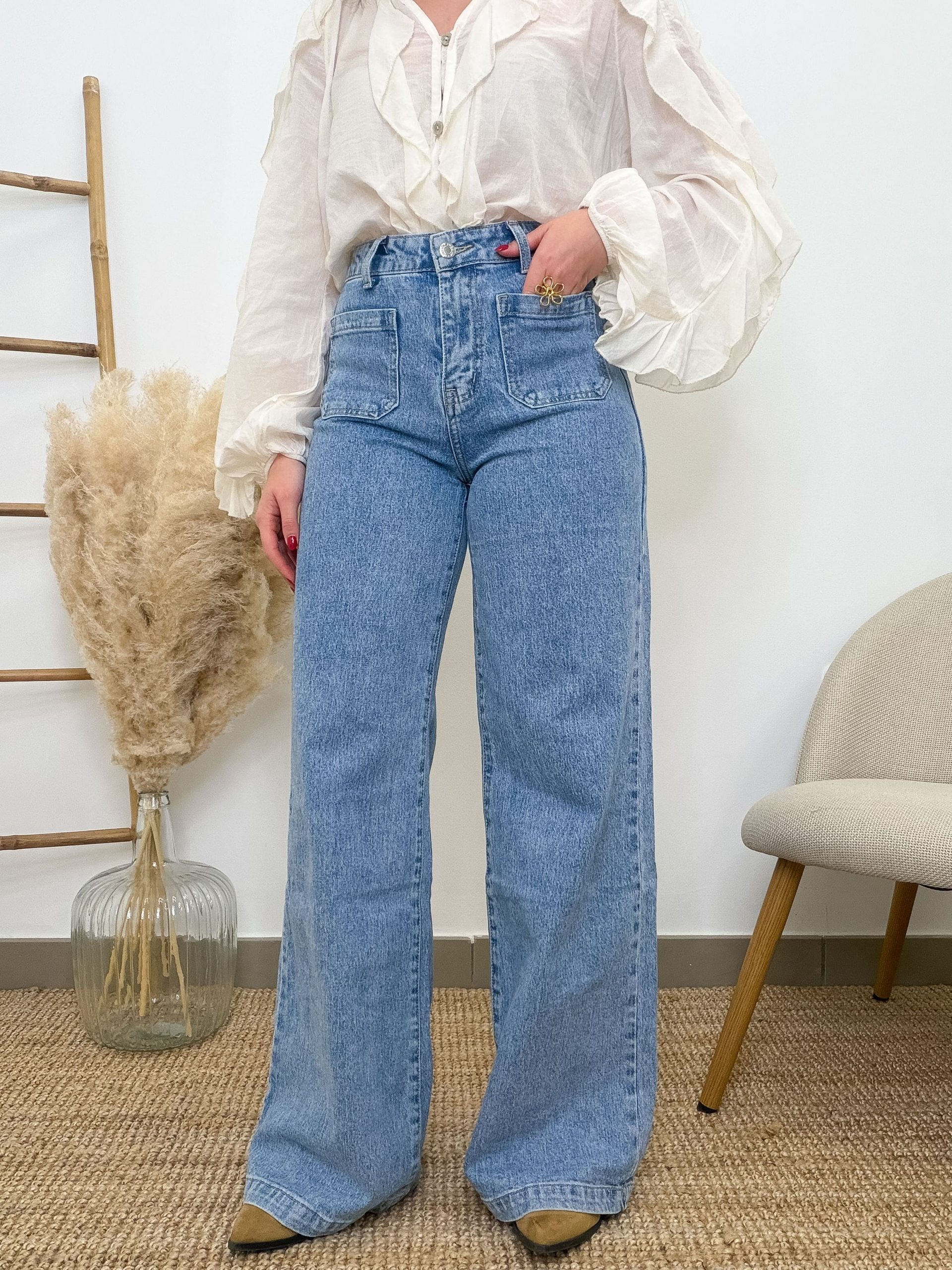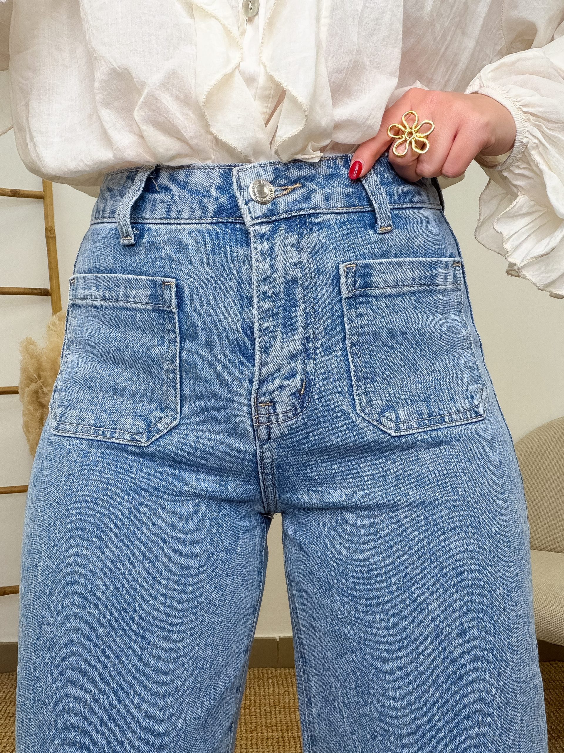 El tono vaquero claro desgastado le da ese punto desenfadado que combina con todo. Con blusas románticas, camisetas básicas o jerséis gustosos. Los bolsillos delanteros aportan ese detalle clásico que nunca falla.